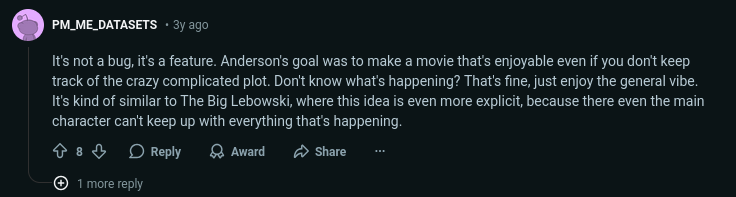 >>4108818 Во второй раз фильм понятнее намного, но я бы сказал, что этот фильм и не про сюжет, а про вайб и юмор с оттенками меланхолии. Я все это во второй раз тоже лучше прочувствовал. мимо