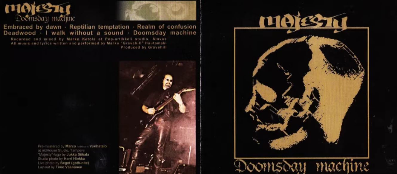 Затем Марко вспомнил про Majesty и таки записал полнометражную работу под этим названием. Альбом он назвал «Doomsday Machine». Выпустил этот альбом лейбл Actcom Music в июне 2001 года. Вот этот Actcom Music — это крошечная фирма, основанная каким-то другом Марко. Прожила она недолго и выпустила мало. Ну, тут ноунейм выпускает ноунейма. С понятными продажными перспективами.