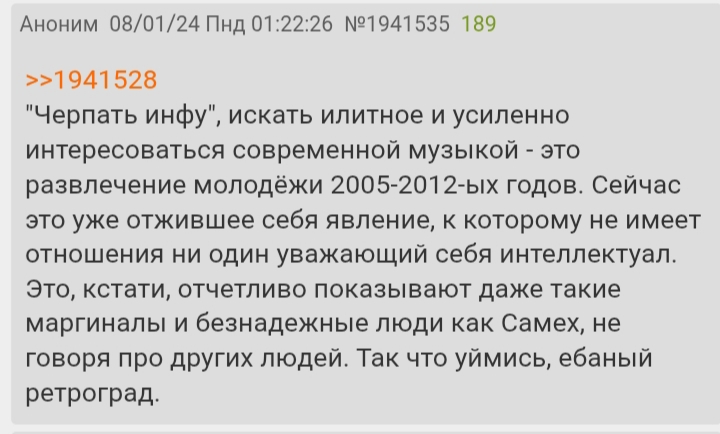 ты блядь тут высирался про хуевый вкус, а от джейн римувер то как разъебало вообще пиздец, у тебя явно завышенные ожидания от музыки или ты зашел потралить как это обычно здесь происходит в общем то я не удивлен, айдиэм треды еще в 2019 пополнялись таким пиздецом где за арку могли нассать и насрать на голову, и я это не поддерживаю