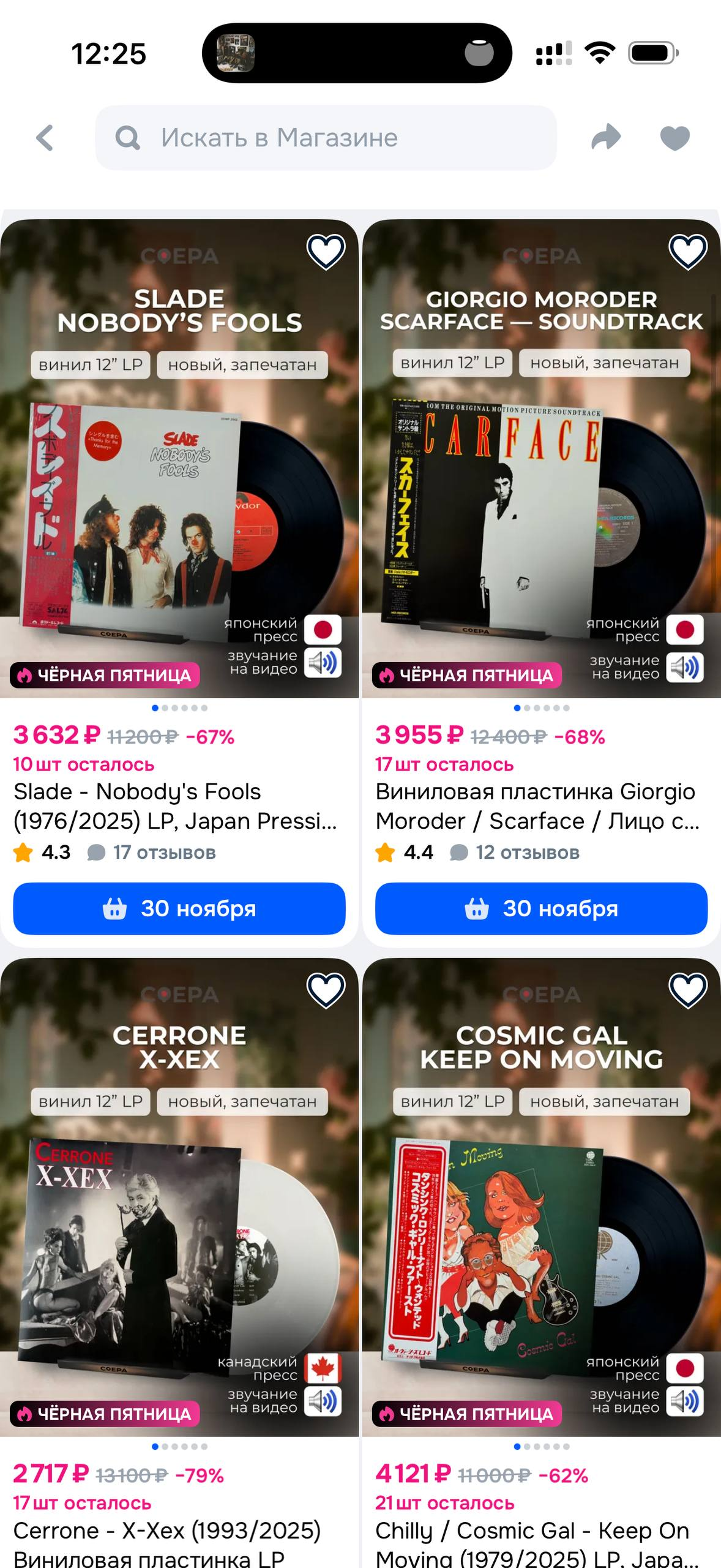 >>1997534 Купил недавно стопку пластинок одним лотом, на фото всё красиво, в описании стандартно: домашного бережного хранения, в идеальном состоянии и т.д. На деле же конверты все рваные по швам, пластинки все исцарапаны словно специально вдоль и поперёк, заляпаны и словно по ним ходили. Не стал ничего писать продавцу, т.к. цена просто не серьёзная (5тыщ за 20+ штук, причём там несколько попалось заграничного производства). Но связываться с Мелодией как-то теперь расхотелось. Разве что выбирать по одной и требовать дотошных фото всей поверхности.