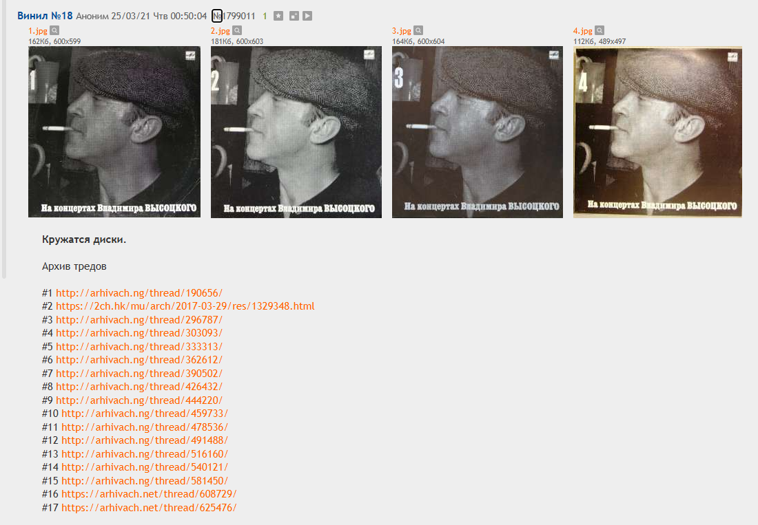 >>1998240 Я как-то шёл мимо рынка, и между бабулек с комнатными цветами и всякими репами сидит тётка и пластинки раскладывает. Интересно стало, подошёл, а она грит: "Вот Высоцкий, недорого отдам, за 700 рублей!" Ну-ну. Это из серии "на концертах", за штуку. Это она летом продавала. Недавно тоже её видел - до сих пор продаёт.