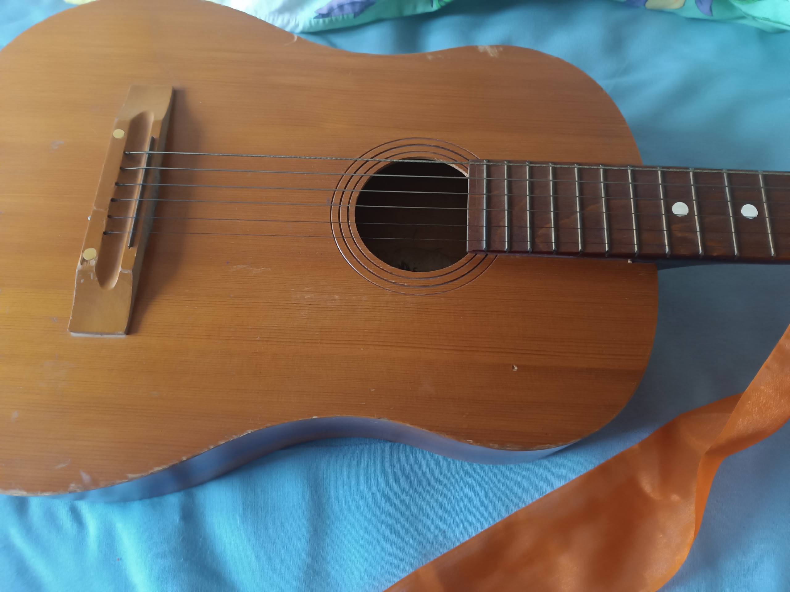 В 2021 году я купил вот это чудо в какой-то барахолке за 1,5 тысячи рублей. Я не знаю о чём я думал, в гитарах я вообще не шарю, понятия даже не умею как она правильно называется, из чего струны, рассчитываю что эксперты расскажут че за хрень я взял. И хотел научиться играть.