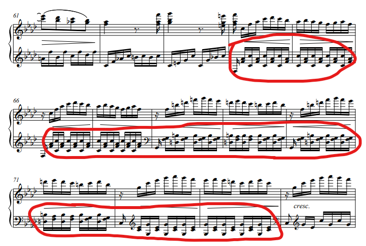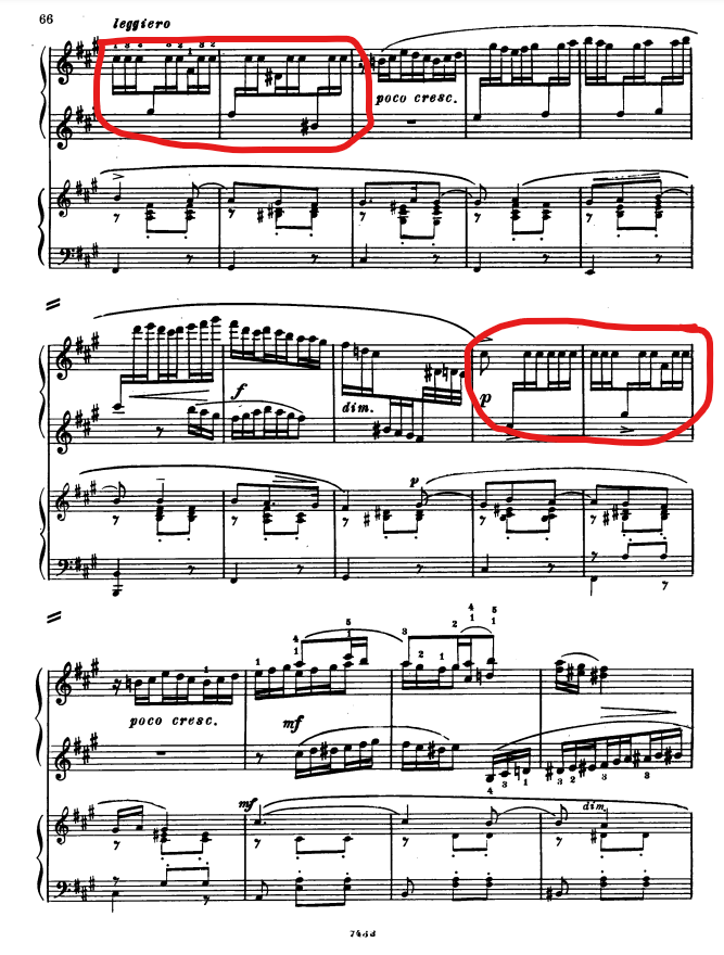 Как сыграть то, что выделено на пикриле? Как исполнить последовательность из одной и той же быстро повторяемой ноты, чтобы она звучала равномерно, отрывисто и без эффекта Паркинсона?