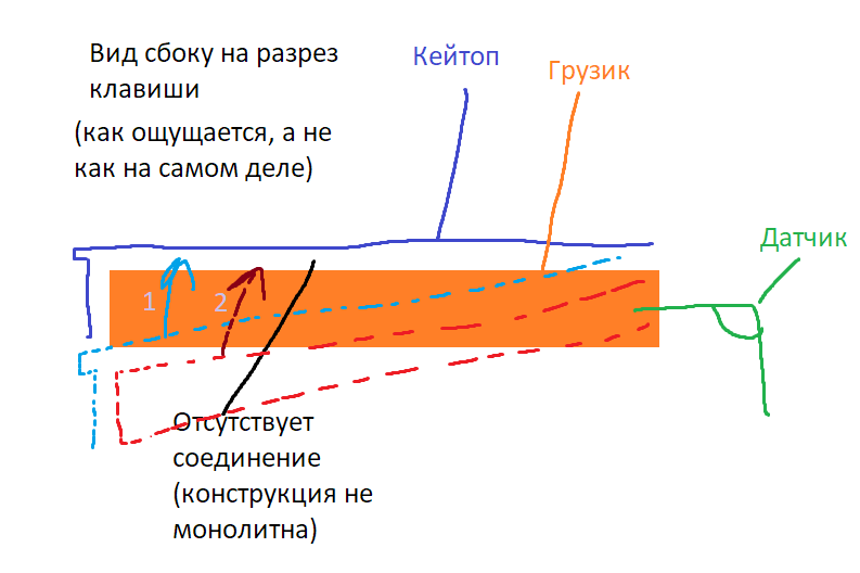 То есть крышка (1) возвращается в верхнее положение раньше чем клавиша (2). Но это только если тянуть. Понятно что при нормальной игре крышку кто-то должен поднимать.