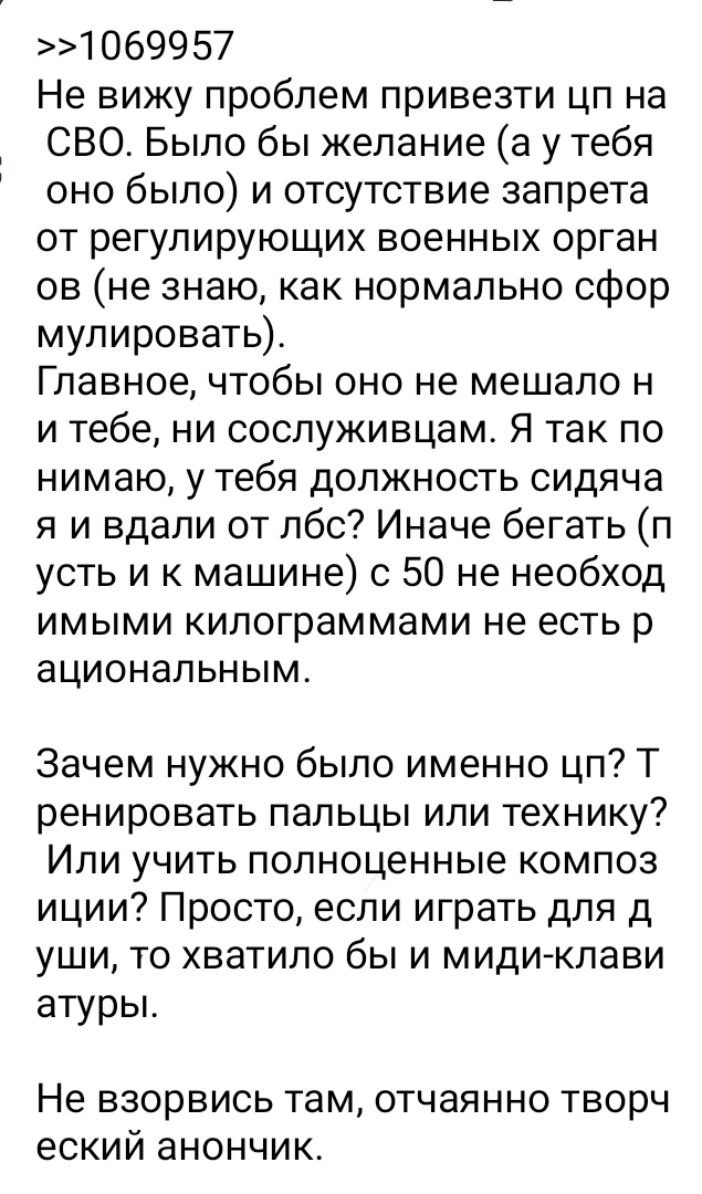Аноны, а что можно купить на работу для новичка, который занимается 2 месяца? У меня дома стоит Роланд фп10, я занимаюсь каждый день в зависимости от того сколько свободного времени есть. От 5 минут до 2-3 часов. На работе я нихуя не делаю, буквально весь день сижу и смотрю видосы. Я инженер, который следит чтобы ничего не наебнулось, а ломается все очень редко. Так вот какой инструмент можно притащить, чтобы была польза и интерес? Допустим что-нибудь на 2 октавы это полезно? Или какую нибудь миди клавиатуру в 1 октаву, но что с ней делать вообще, чему учиться на такой? Спасибо за ответы!