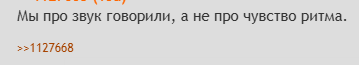 >>1127815 Тебе 2 человека отвечают. Один из них реально клоп. А я вот не понял, почему ты играешь под мою ударку, когда я её кинул не для проверки твоих ритмических навыков, а для проверки звука. А ещё я обосрался с того, что тебе мешает пустота в начале. Я так и представляю, как ты ирл к барабанщику приходишь, он садится за барабанную установку, и, пока он берёт палочки, ты начинаешь орать, что он не попал в темп, который у тебя в башке играл. Обосраца.