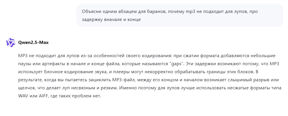 ещё раз: если ты чёткий поц то ИИшка работает на тебя как музыканта и через неё ты пишешь свои идеи, и никакие технические скилы тебе не помеха выразить свои мысли ну, а если у тебя мыслей своих нет, то тебе даже личный стив вай в рабстве не поможет написать что-то интересное