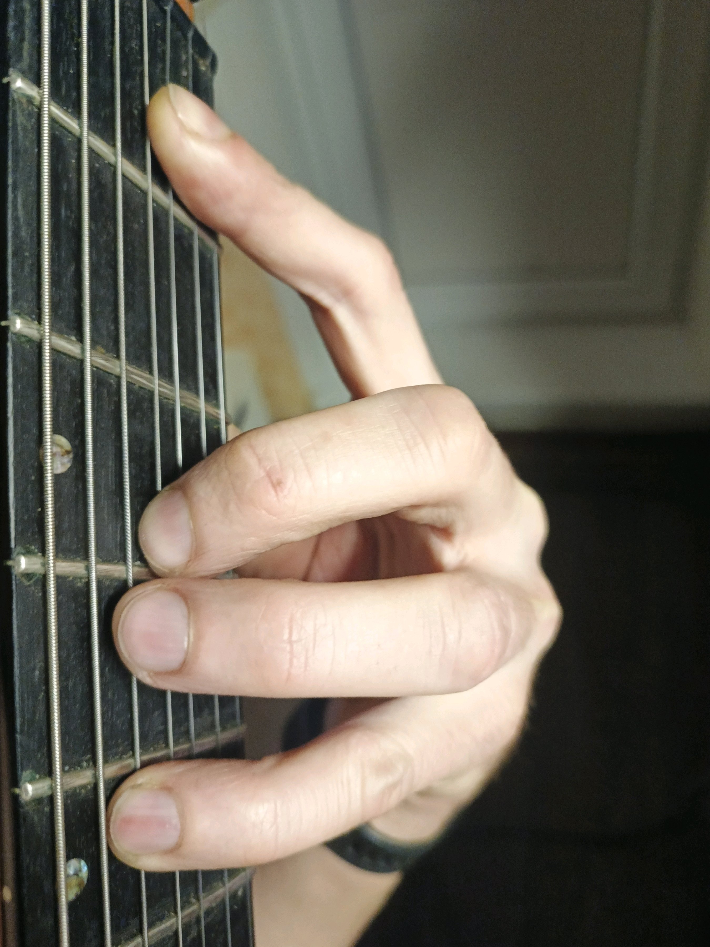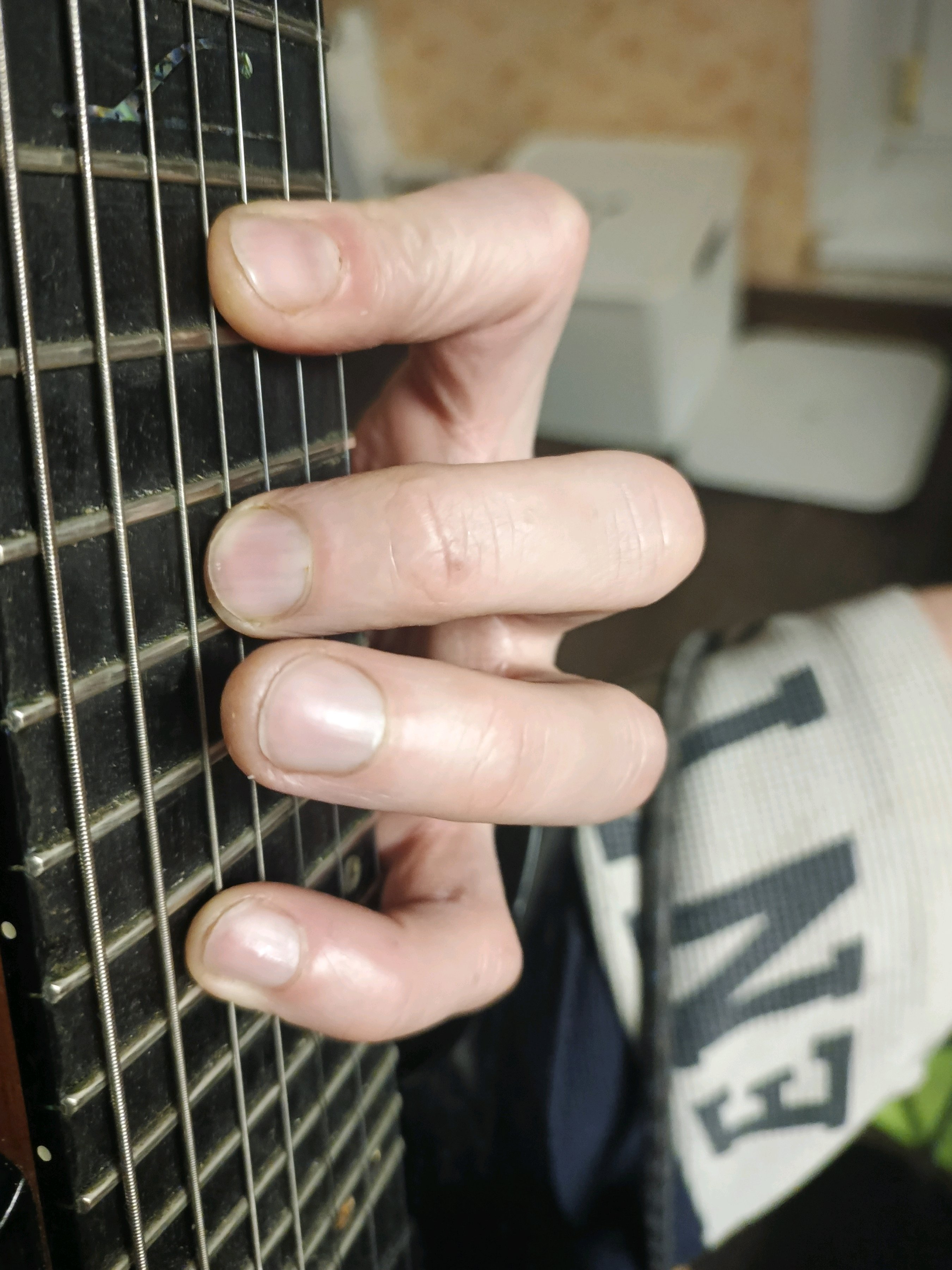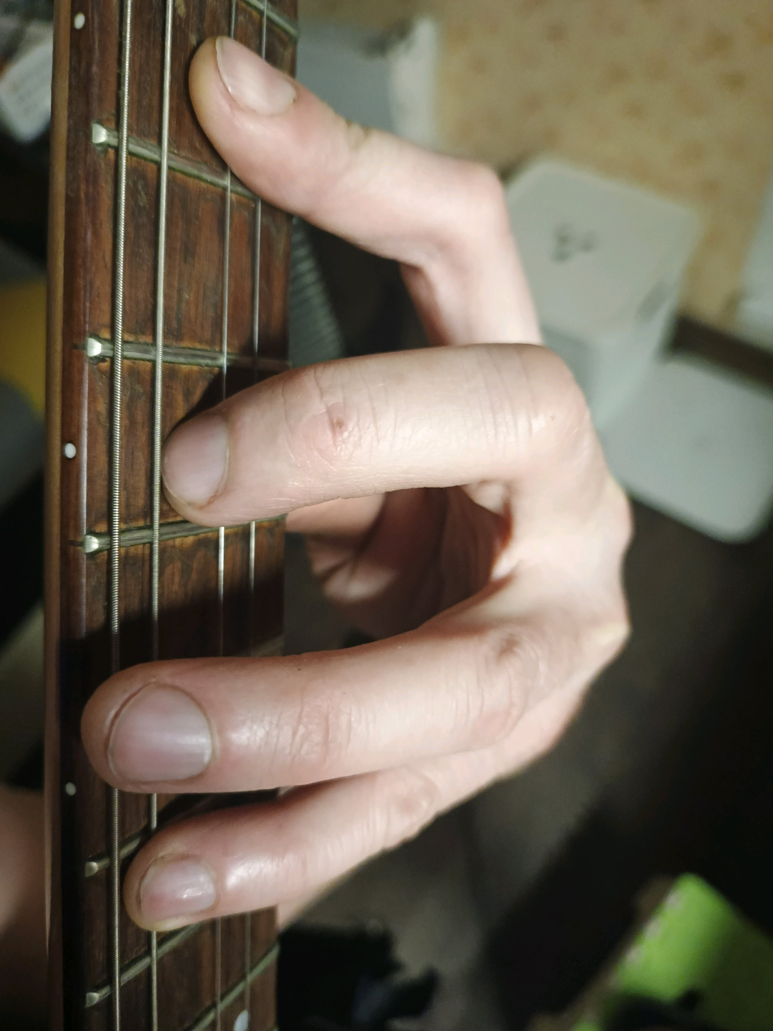 Или например выше на одну струну эту аппликатуру переставить, как он уже зажмет? Тут ему надо уже скалопирование ладов делать, чтобы указательный палец смог также зажать и за гриф загнуться. А вот как я зажал можно и слайд сделать и туда-сюда вниз вверх переставлять. Но это все равно хуета. Скорее всего такой аккорд выгодно зажимать за двенадцатым ладом, на обычном аккорде пальцы друг другу мешают на близких расстояниях, а вот такая тема как раз подойдёт.
