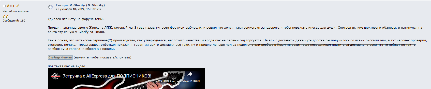>>1128314 Ну оно. Как тебе сухр или не сухр? Хорошие железки, хорошее дерево, вплоть до однокусковых флейм мейпл корпусов и прочих радостей. Все по максимальному гитарному феншую, и по цене ниже чем самые дешевые гипсаны. Я уж молчу про сухры. Сухр ты за 800-1500 баксов вообще никакой не купишь.