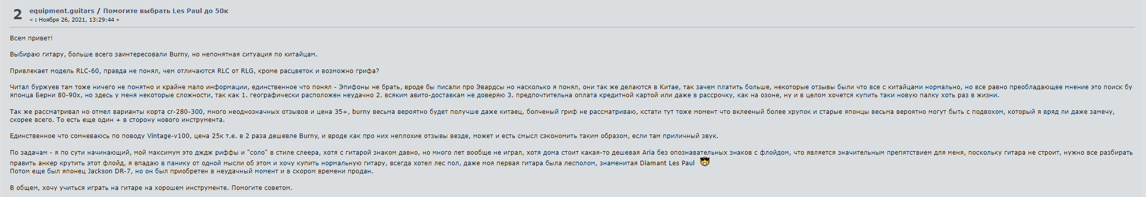 Положняк по гитарам: Хочешь красивую гитару - бери Лес пол Хочешь удобную гитару - бери Ибанез Хочешь быть нитакусей - бери ЕСП или ПРС Хочешь выкинуть много денег на хуйню - бери фендер Хочешь инвестировать а не играть - гибсон Если ты нищий - бери джет Если тебе только попробовать и выкинуть - ирин, глорифи, китаенабор за 6к с комбиком