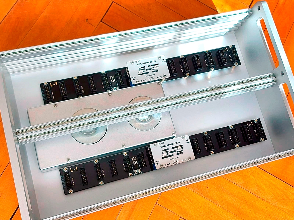 Full anodized aluminum case. Each busboard has own PSU 1A per rail. Two busboards in a case - total 2A per rail.. PSU is linear ultra-low noise. Based on last generation regulators TPS7A47. Here is a page with PSU ripple & noise measurements http://l-1.su/PSU_measurements.html. 230V or 115V input selectable with a jumper. Optional: rack ears. Optional: two pairs balanced XLR outputs at the back. Optional: solid aluminum stands.