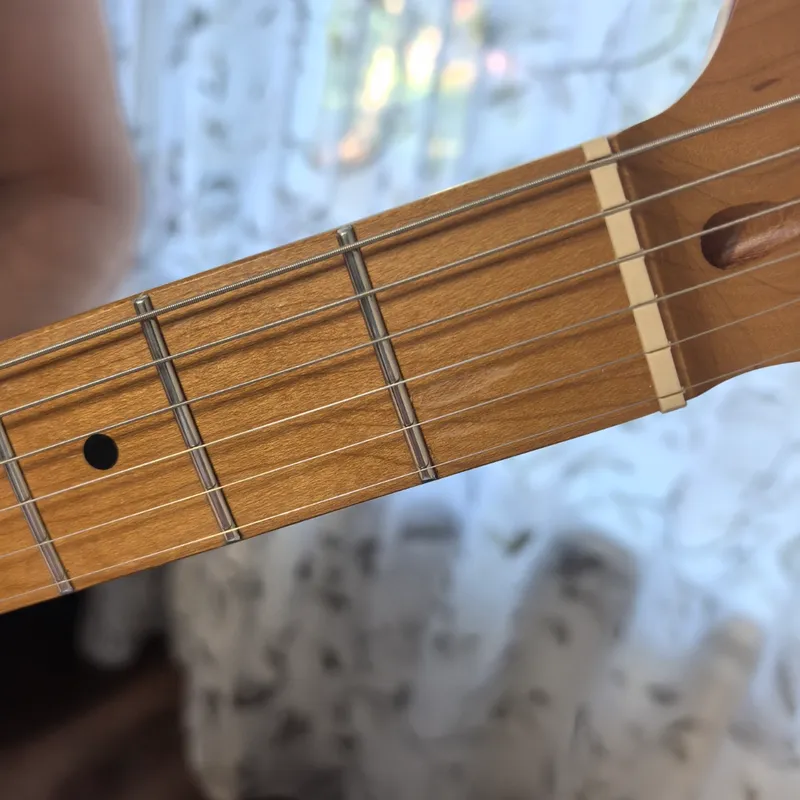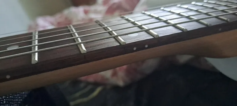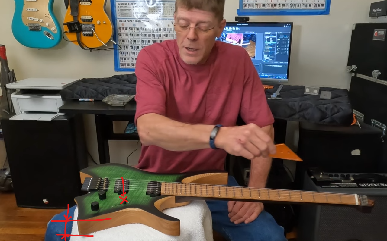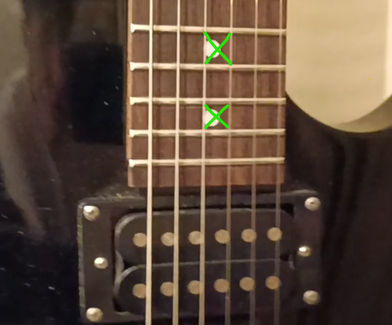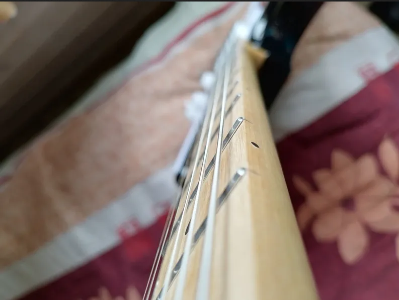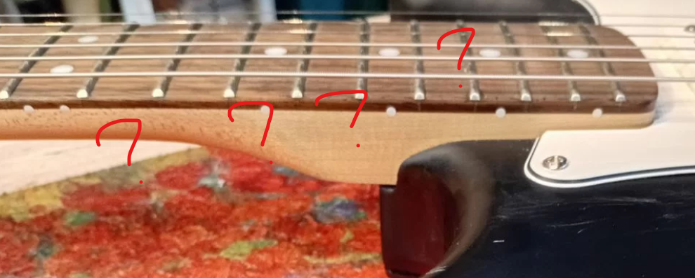 >>1132467 Вот эти точки(инкрустация грифа) должны быть строго по середине. Если гриф стоит под углом (как у тебя), то у тебя все лады смещены относительно мензуры на какие-то проценты. Кроме того, что струнно-ладовый инструмент изначально ни у кого не строит, у тебя ещё и дополнительное искажение. Ещё можно по попадание в магниты ориентироваться (на звук не влияет)