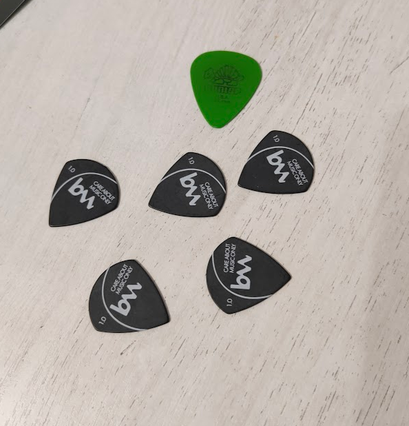 вроде и толстым медиатором 3мм могу играть, но он прокручивается и появляется грязь, потому что пальцами не держащими медиатор задеваю струны, особенно при палммьютах. толстые обычные медиаторы из-за того что не пробивают струну - застревают при переменном штрихе, больше всего на супер мягком медиаторе гибком понравилось, вроде 0,5 - но он просто сломался на 3 части пополам во время игры. может кто на озоне посоветует что-то недорогое? те что купил YoYoMuse - говно, пластик хуйня какой-то волокнистый что-ли, даже если полирнуть - как сотрётся - скребёт волокнами, самый приятный по материалу зелёный данлоп шарп 88, но я не уверен что смогу найти на озоне такой же и не подделку, а оригинал наверное дорогой нынче