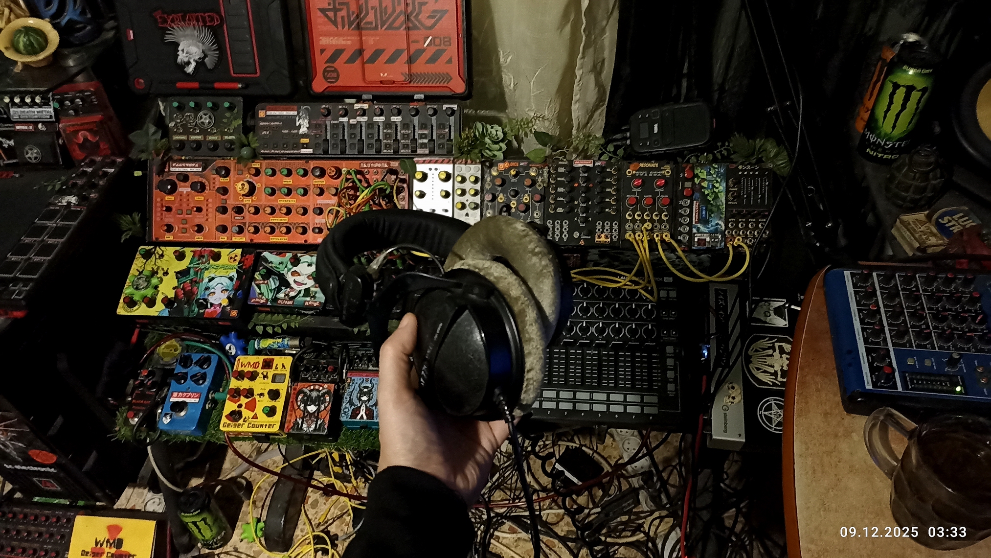 Вчера вечером гулял по кладбищу в полной темноте, по памяти читал стих Багрицкого - смерть пионерки (точнее отдельные строки которые запомнил из интернета), и вдруг на меня как на Проханова снизошла благодать, сам собой словно луч света начал рисоваться рифф и рисунок трека . Я дошел до дома постепенно забыв божье послание, но ужиная снова вспомнил, включил пекарню и сделал пару набросков за 5 минут.
