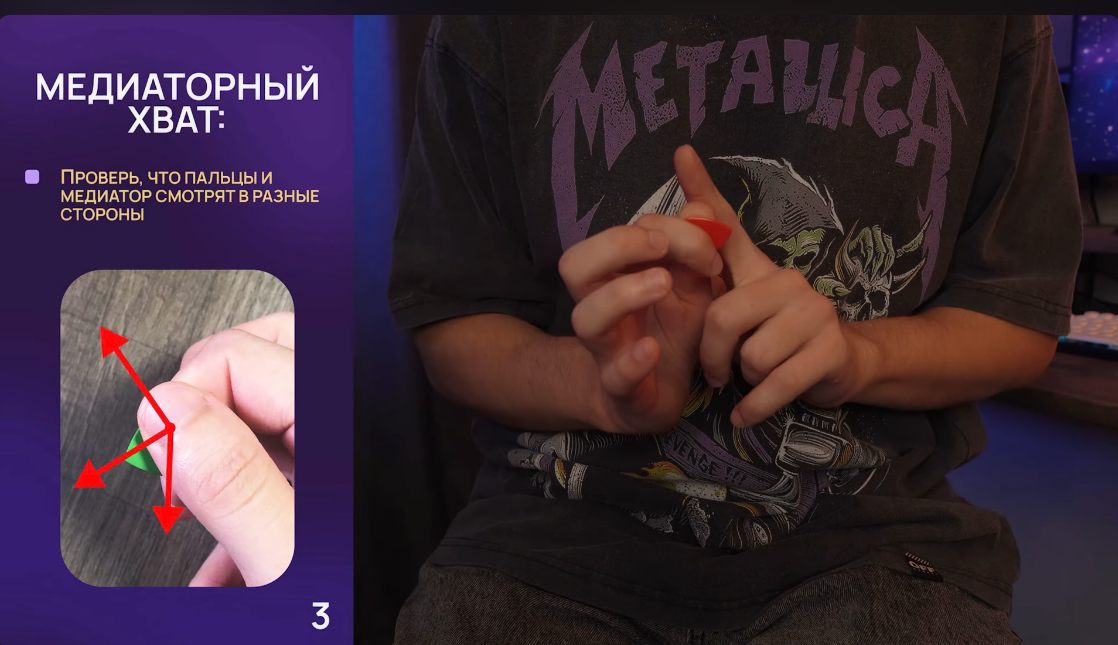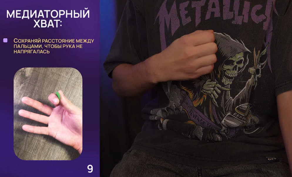 И да, учитывая что руки у всех плюс минус одинаковые, логично предположить что существует таки некая приближенная к идеальной постановка руки и в т.ч. хват медиатора, который позволит быть наиболее успешным при обучении и как минимум не потребует переучиваться впоследствии.