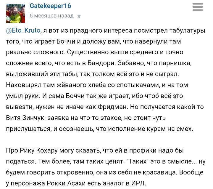 >>1137058 > Учиться играть через Rocksmith слишком плохая идея, или реально? Времени на репетиторов из-за неудобного рабочего графика нет. Играть на гитаре не научишься, но игра веселая. > Нужно ли сразу покупать комбик, или достаточно будет просто подключать по шнуру к приставке/ноуту? И если комбуха нужна, какие есть хорошие варианты за адекватную цену? Комбик удобнее тем, что независим от компа, одной кнопкой включил и играешь. Но звуковая карта даст больше возможностей для формирования своего звука и звукозаписи за меньшие деньги. Ещё к выбору комбика нужно очень серьезно подходить, потому что это 90% твоего звука и многие комбики просто дерьмо. > Слышал что на электро учиться немного проще чем на акустике. Одинаково > Пацифика норм выбор для начала? Отличная гитара