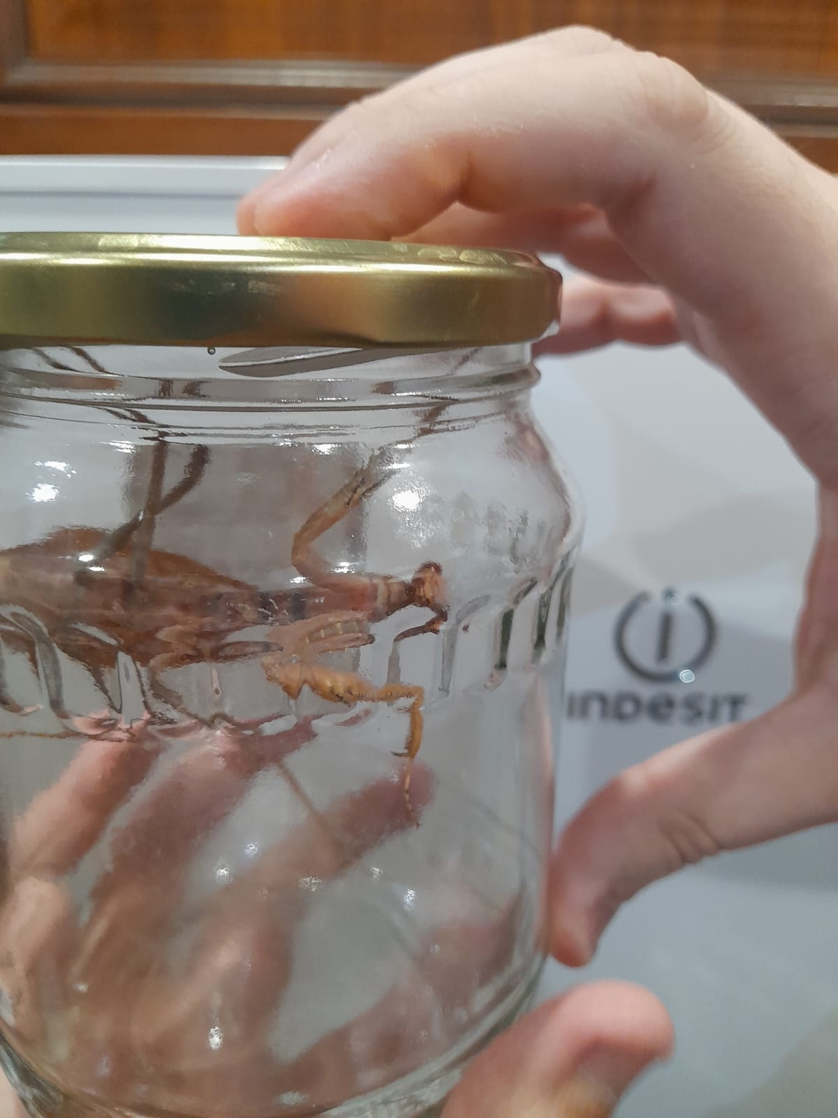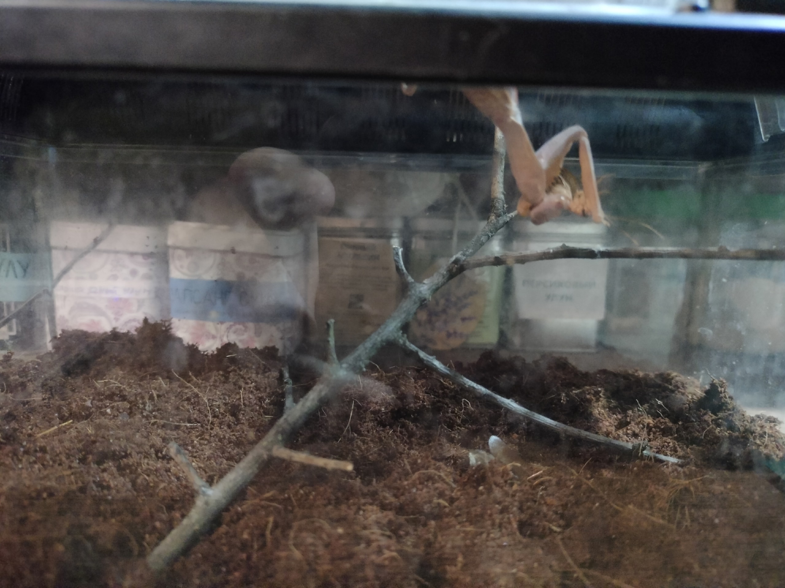 Прикольно, в этом году у нас в республике появились богомолы. У себя в огороде в первый раз за 36 лет нескольких нимф увидел, но были слишком мелкие и кормить нечем было бы. Маман несколько шкур нашла и вечером соседка мне принесла такого, взрослого. Hierodula transcaucasica походу. Уже двух тараканов заточила