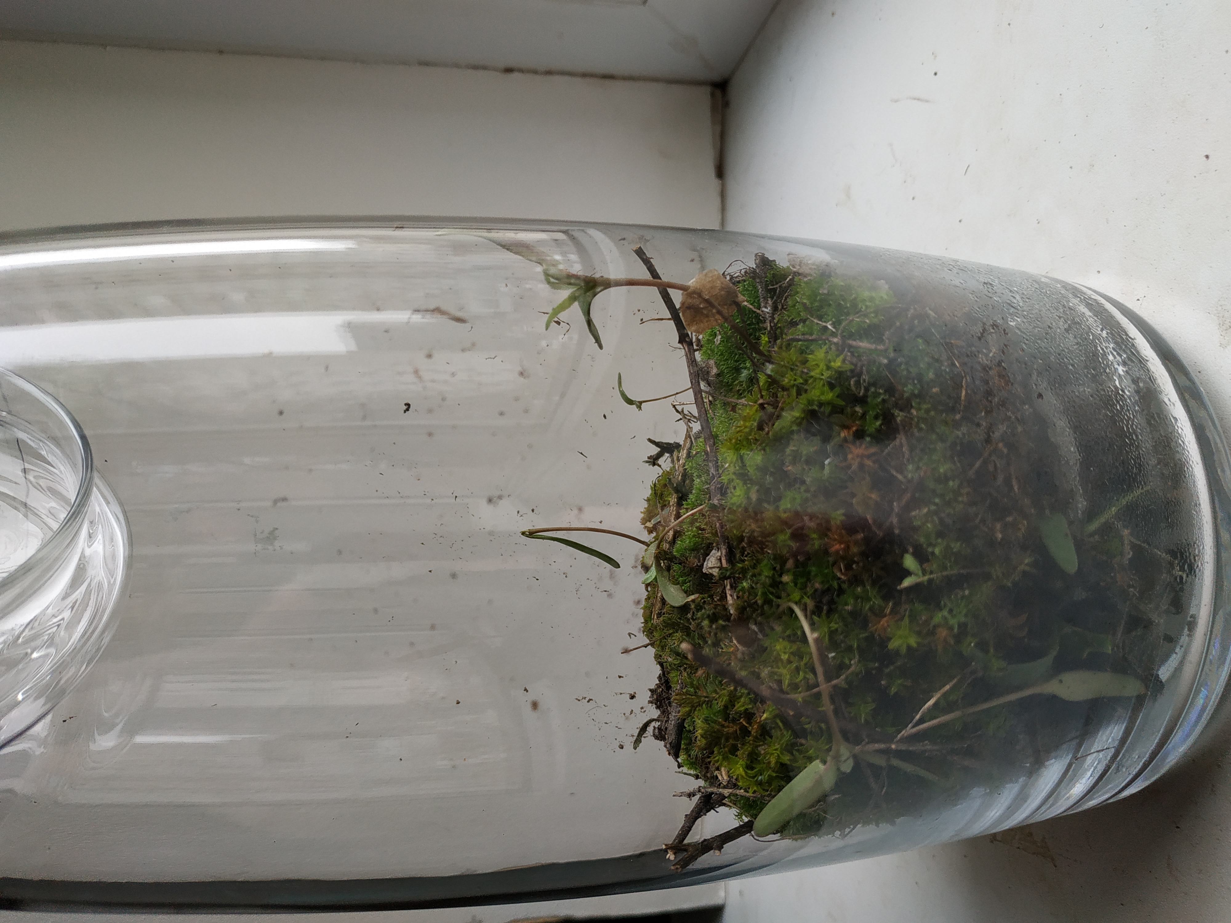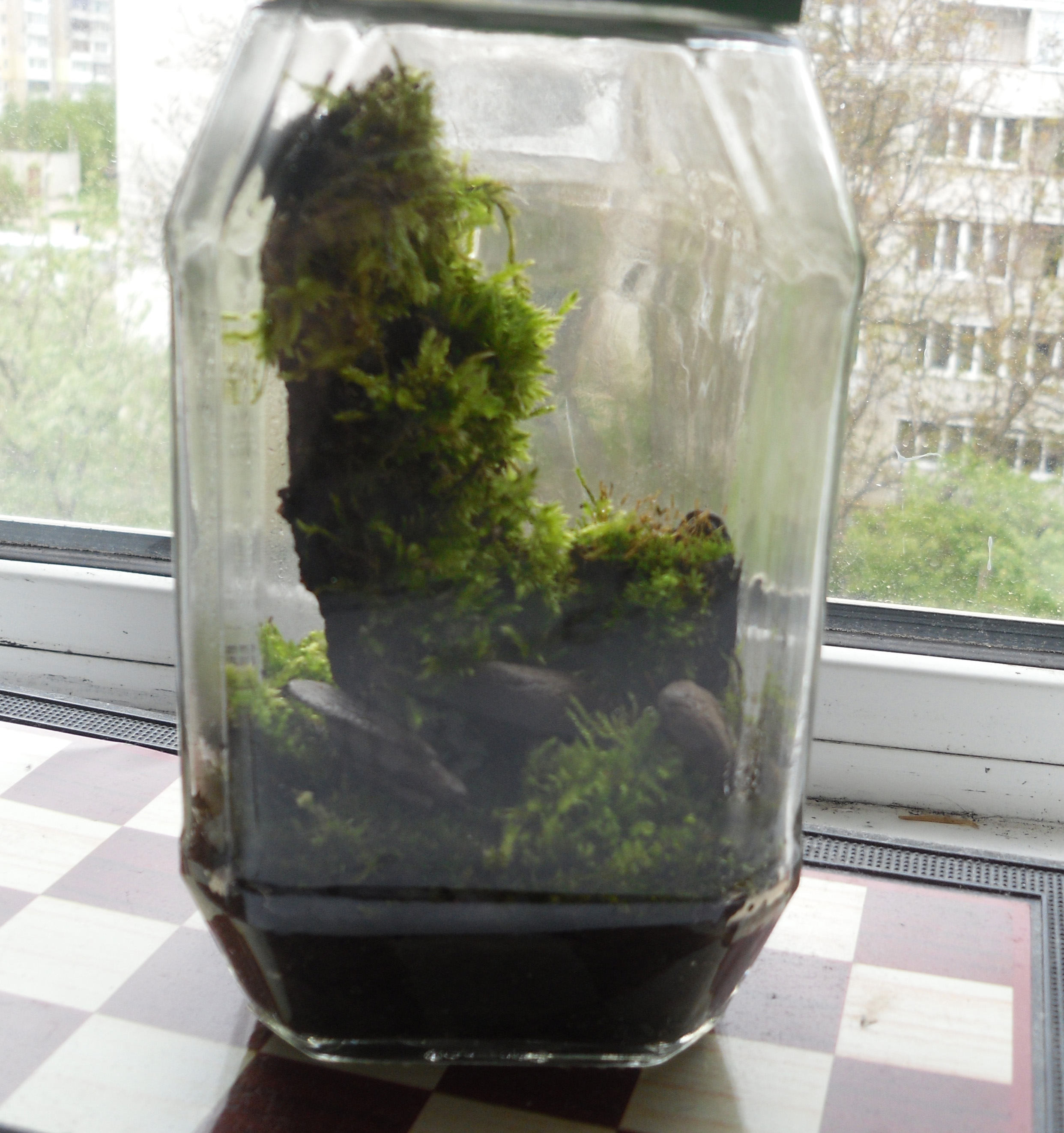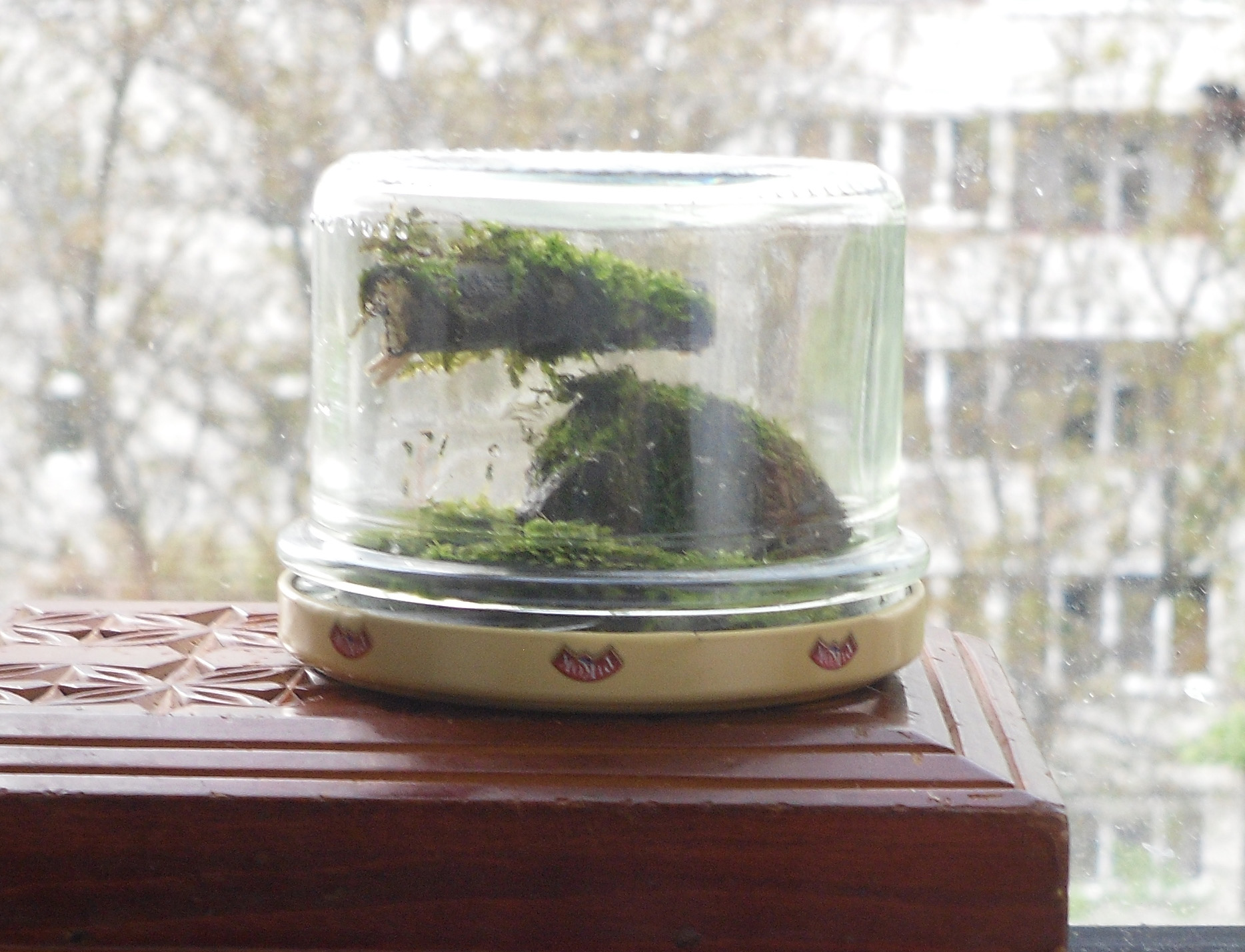 Банка от сока меня не радует. Там всё сдохло ещё осенью. Не ожидал. Вся живность. Там абсолютно мертво. Даже растения. Даже мох не растёт, а тот, который остался на куске коры, не увеличивается в размерах. Последние месяцы крышка заменена на марлю, чтобы лишняя влага испарялась (слишком много воды налил в начале). Думаю, плотно закрывал зря. Там много было гниющих растений (и трупов животных), плюс живые животные - кислорода всем не хватило, потому что зелёных растений почти не было. В общем, фейл. Выкидывать пока не буду, хочу чуть позже очистить изнутри стекло от прилипшей грязи и снова закрыть. И посмотреть, будет ли всё же мох расти, когда станет более солнечно. Кроме мха там сейчас есть буквально один росток непонятной травы, но он уже месяц не увеличивается в размерах. Но и не помирает.