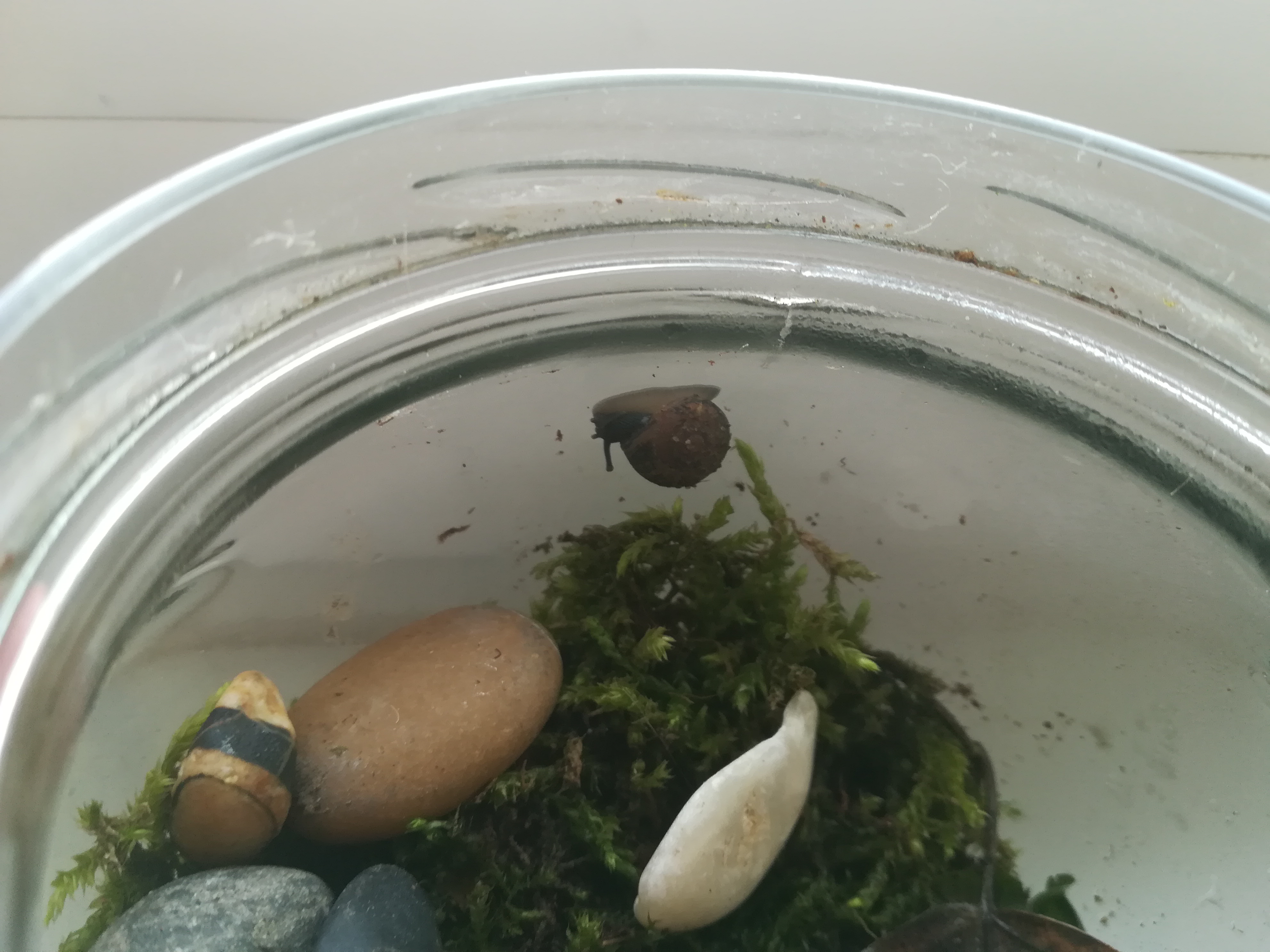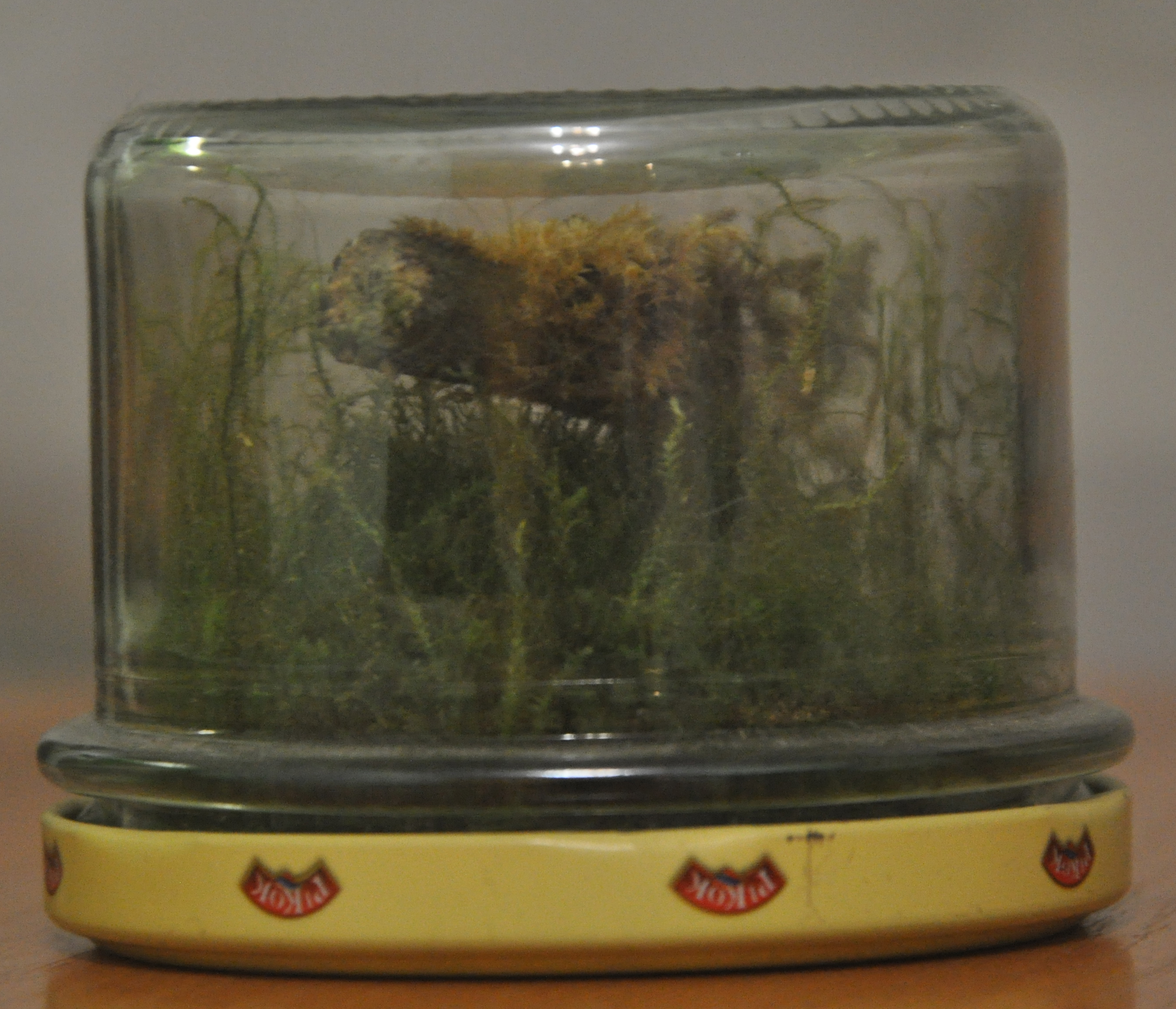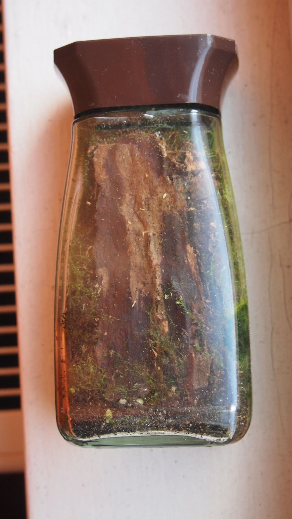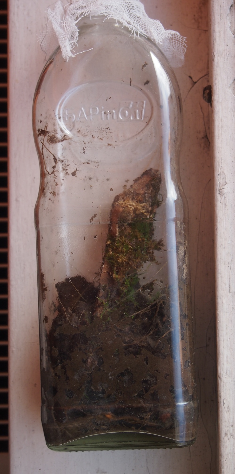 Банка от сока меня не радует. Там всё сдохло ещё осенью. Не ожидал. Вся живность. Там абсолютно мертво. Даже растения. Даже мох не растёт, а тот, который остался на куске коры, не увеличивается в размерах. Последние месяцы крышка заменена на марлю, чтобы лишняя влага испарялась (слишком много воды налил в начале). Думаю, плотно закрывал зря. Там много было гниющих растений (и трупов животных), плюс живые животные - кислорода всем не хватило, потому что зелёных растений почти не было. В общем, фейл. Выкидывать пока не буду, хочу чуть позже очистить изнутри стекло от прилипшей грязи и снова закрыть. И посмотреть, будет ли всё же мох расти, когда станет более солнечно. Кроме мха там сейчас есть буквально один росток непонятной травы, но он уже месяц не увеличивается в размерах. Но и не помирает.