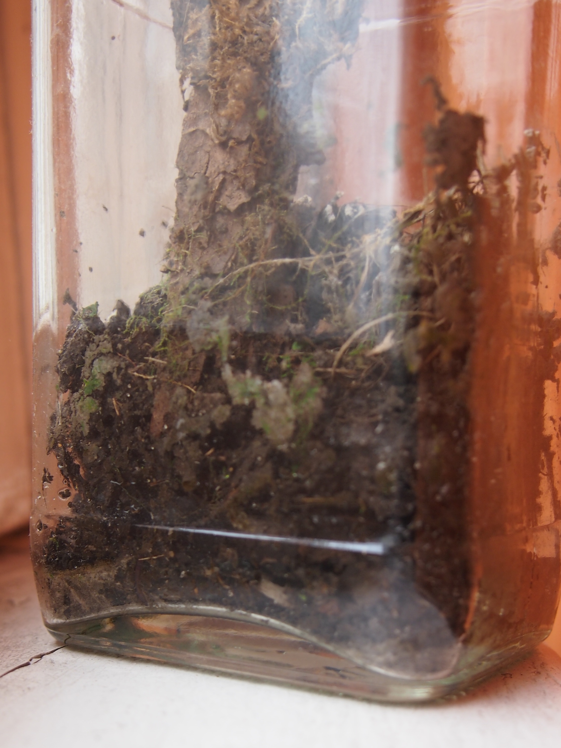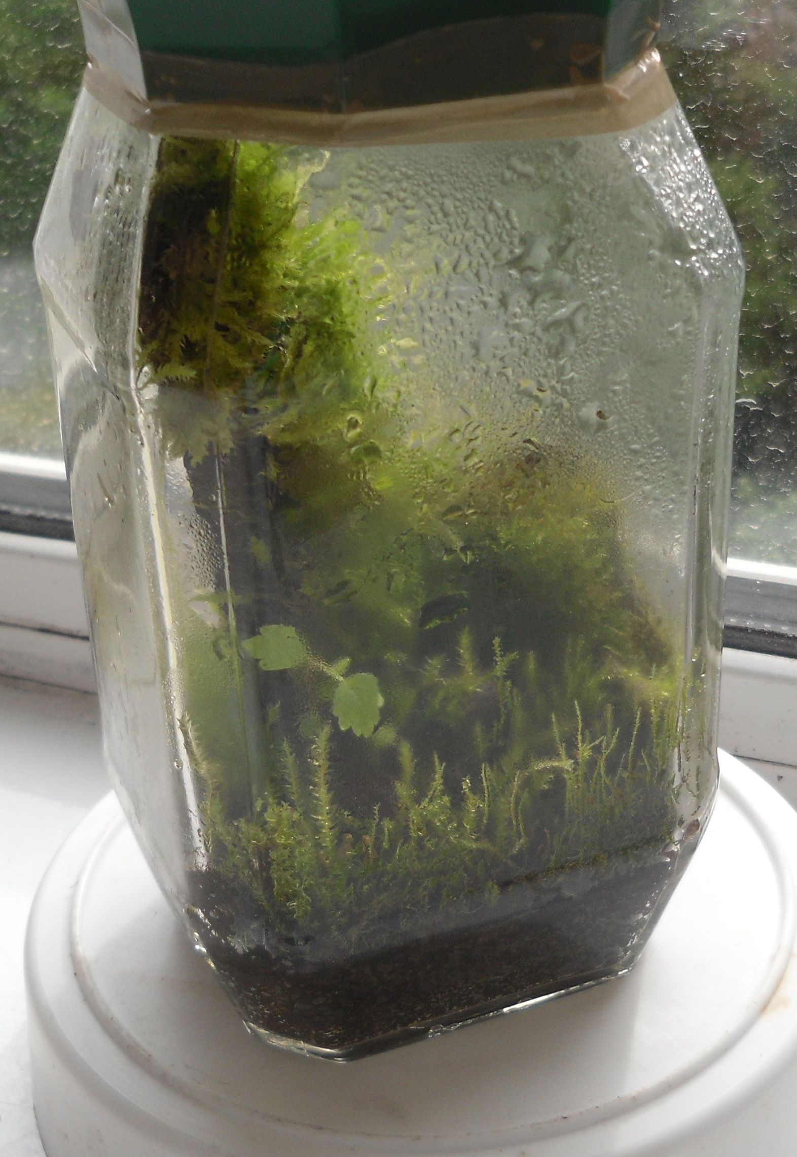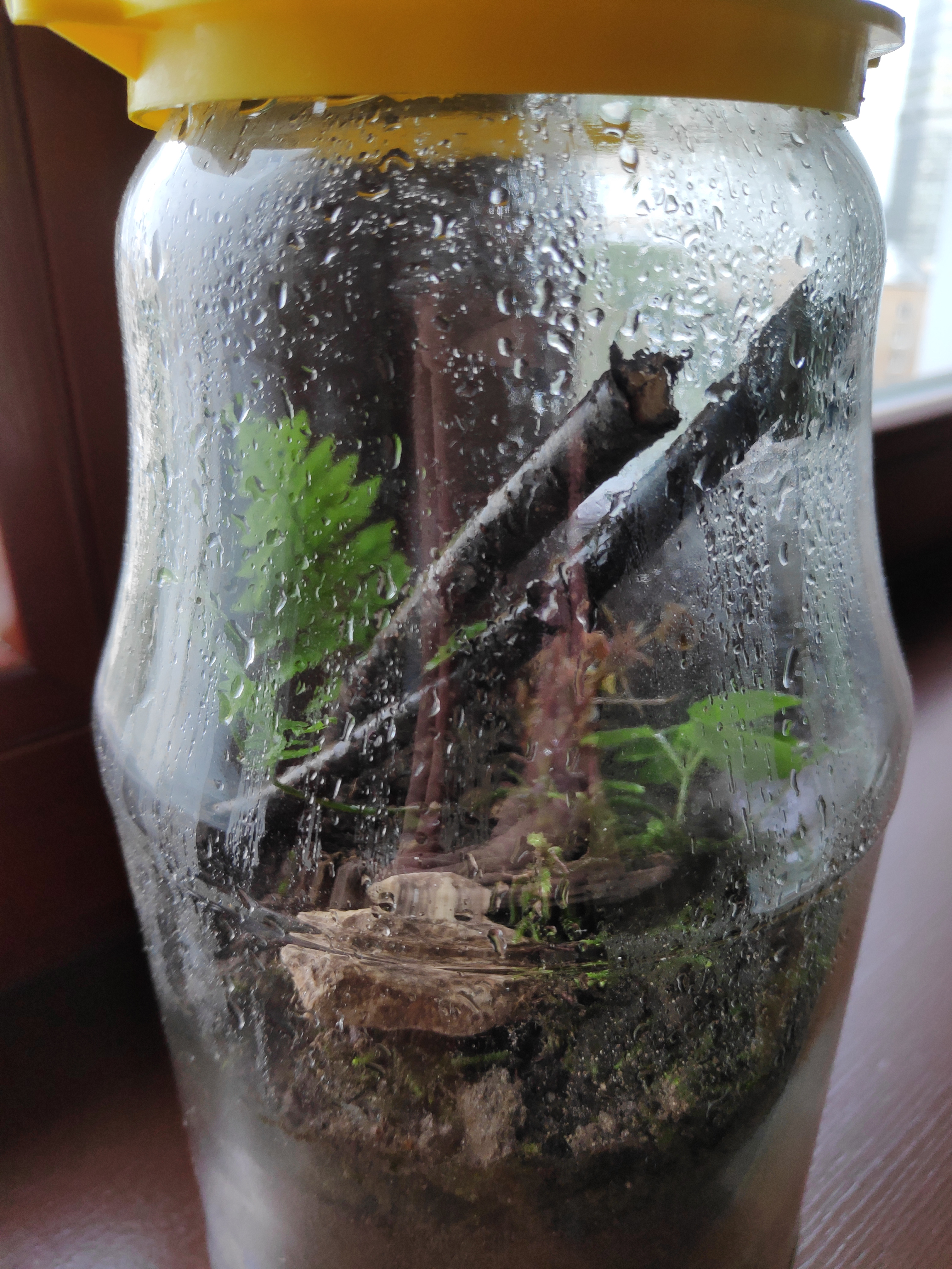 Банка за год изнутри заросла мхом и каким-то ползучими корнями, показывать нечего. На стекле иногда видно живых ногохвосток, в земле ещё червие ползает. Что внутри происходит, не знаю. А вообще забавно, такой девонский период в миниатюре получился. Примитивные членистоногие, черви, мох и водоросли. Там ещё наверняка высокая температура (банка на солнце стоит), давление и высокая концентрация углекислого газа. Как думаете, что там будет через пару миллионов лет?