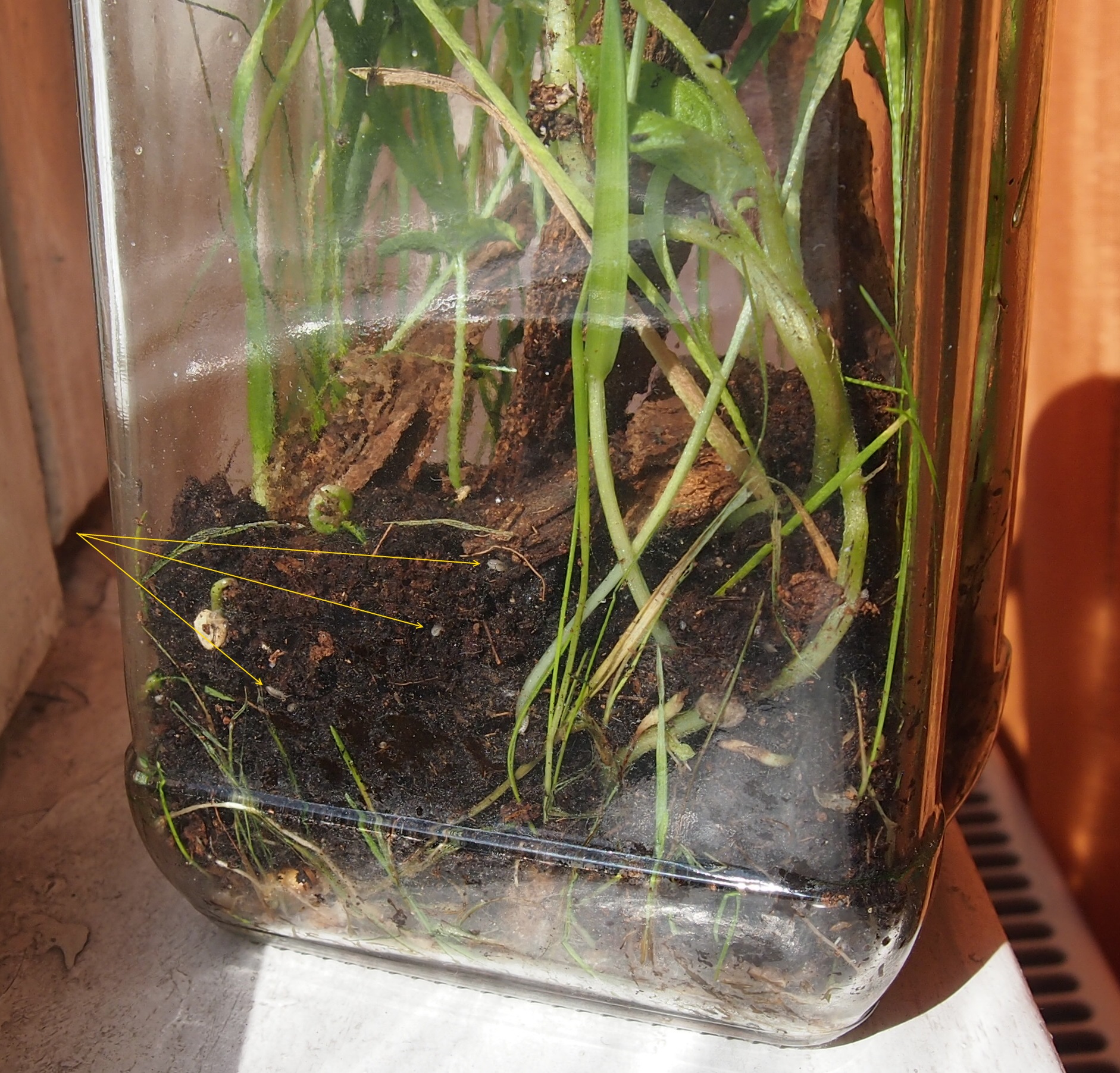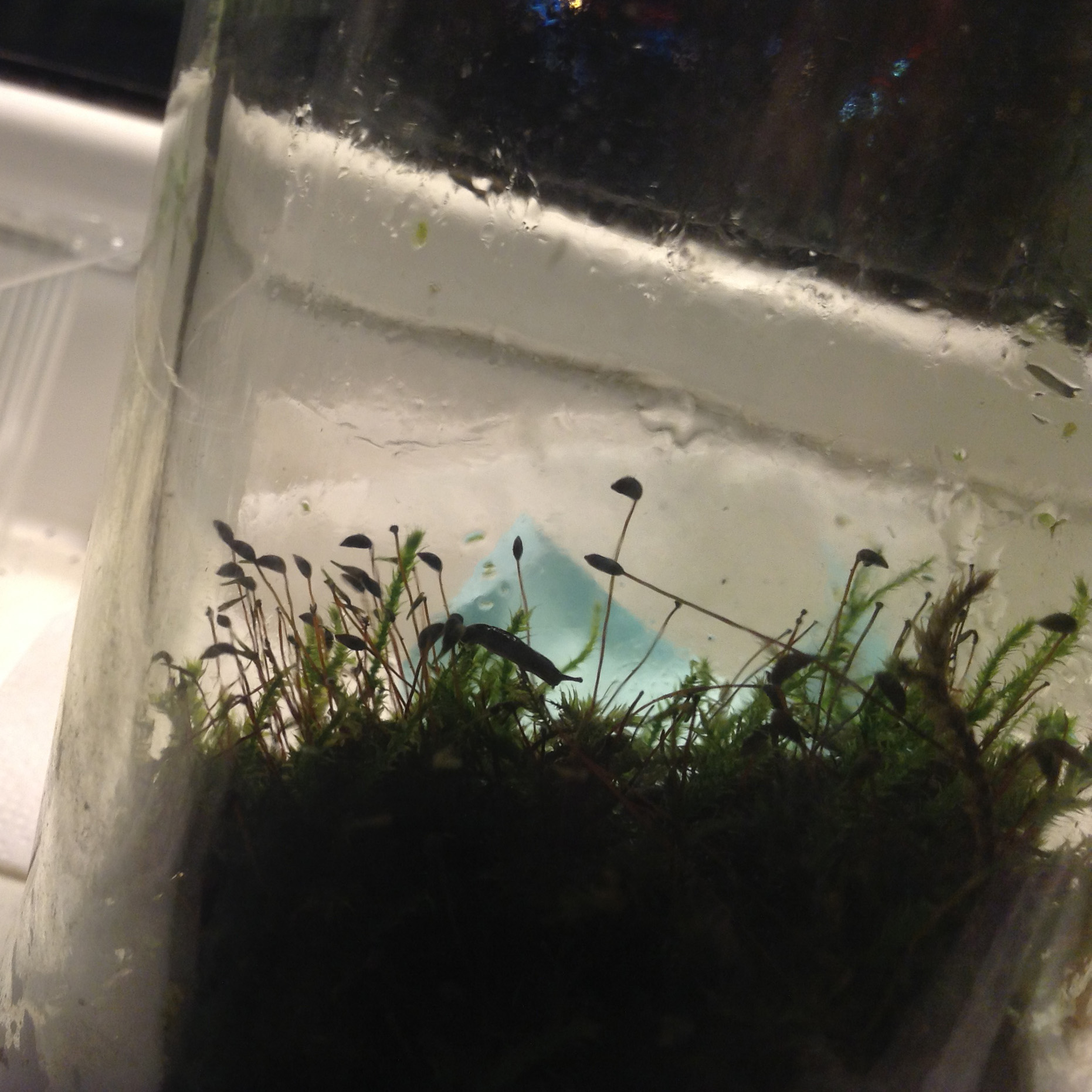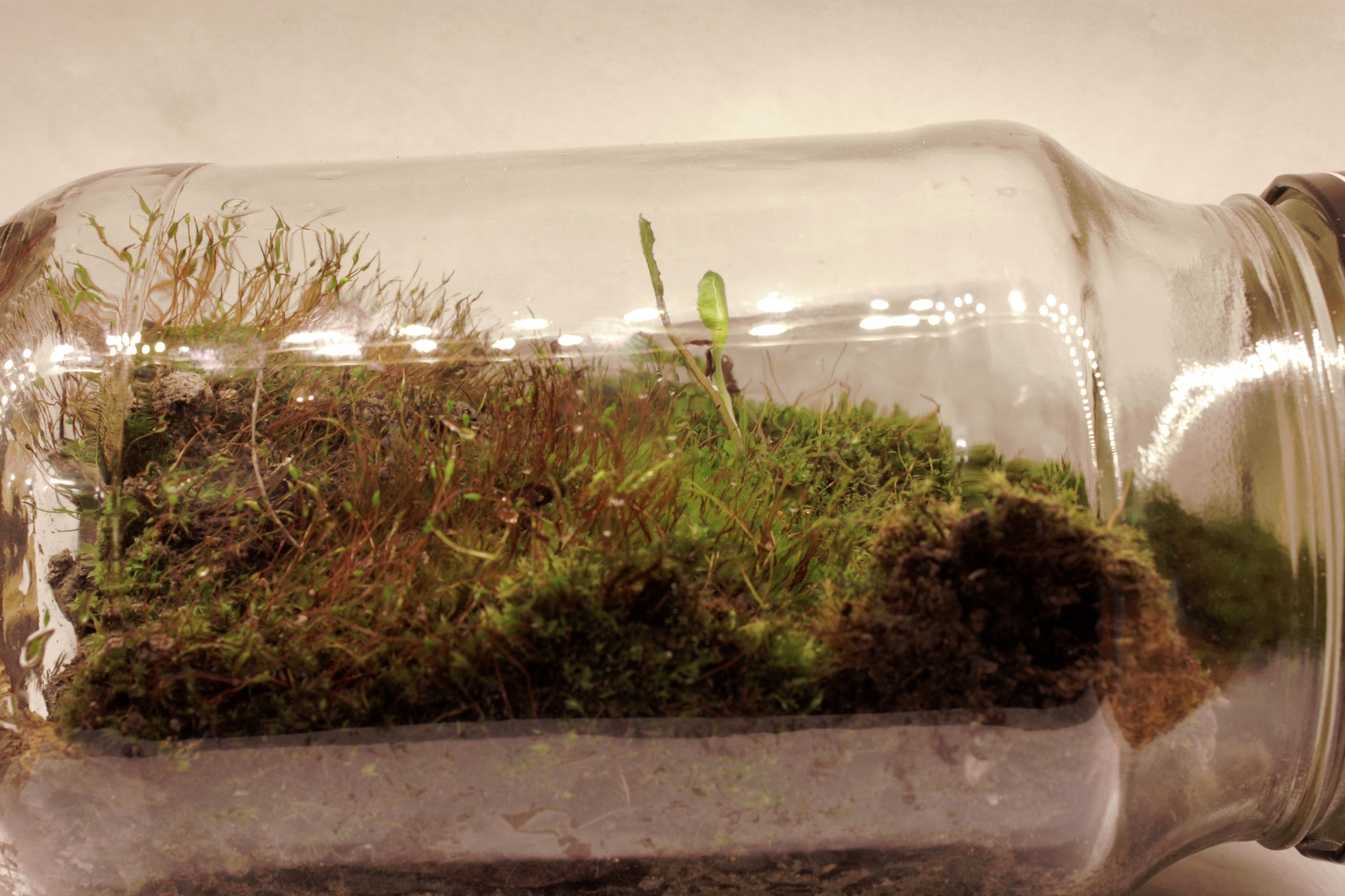Банка за год изнутри заросла мхом и каким-то ползучими корнями, показывать нечего. На стекле иногда видно живых ногохвосток, в земле ещё червие ползает. Что внутри происходит, не знаю. А вообще забавно, такой девонский период в миниатюре получился. Примитивные членистоногие, черви, мох и водоросли. Там ещё наверняка высокая температура (банка на солнце стоит), давление и высокая концентрация углекислого газа. Как думаете, что там будет через пару миллионов лет?