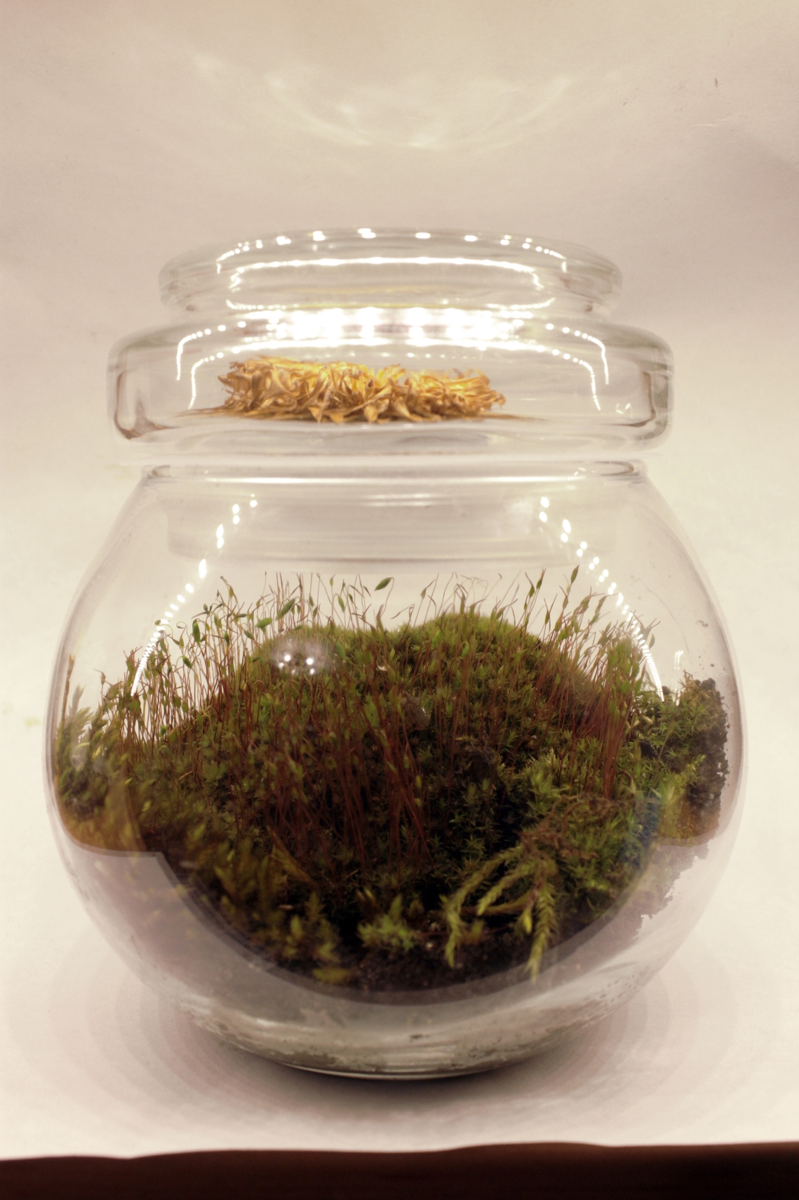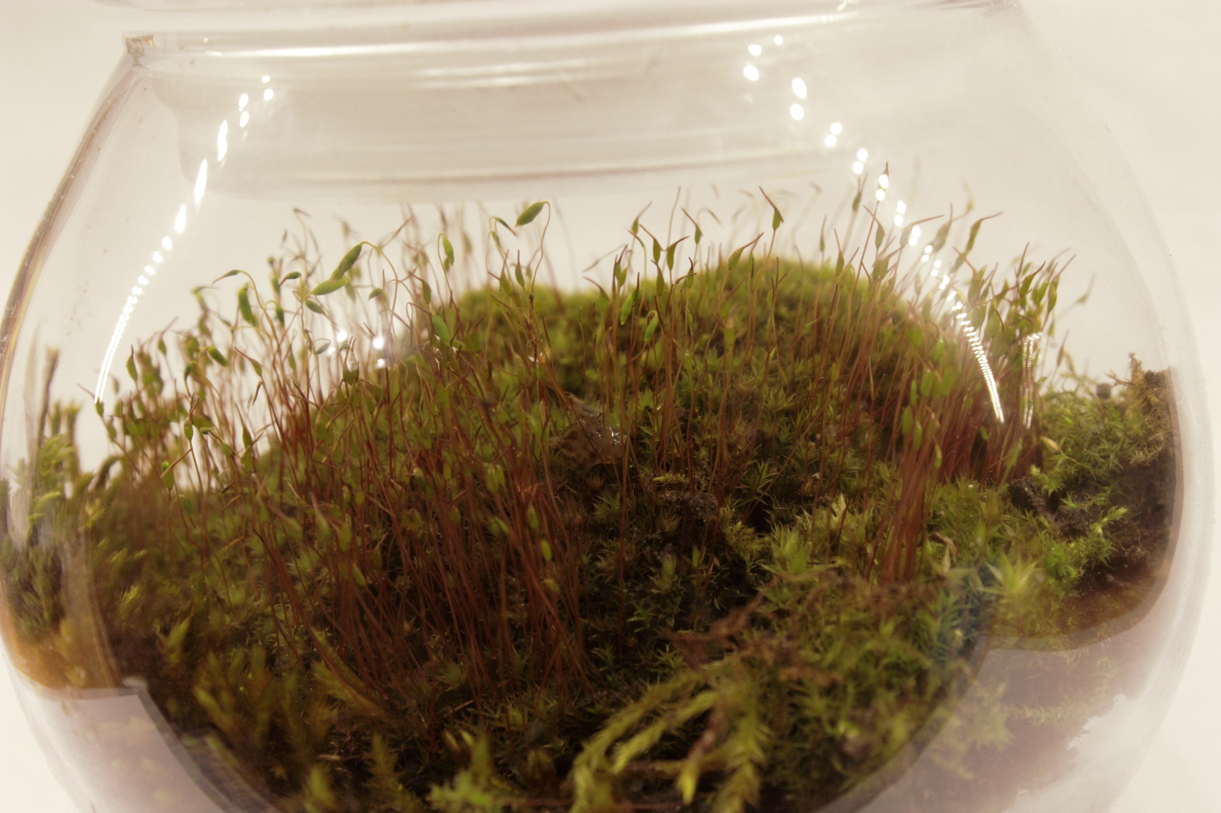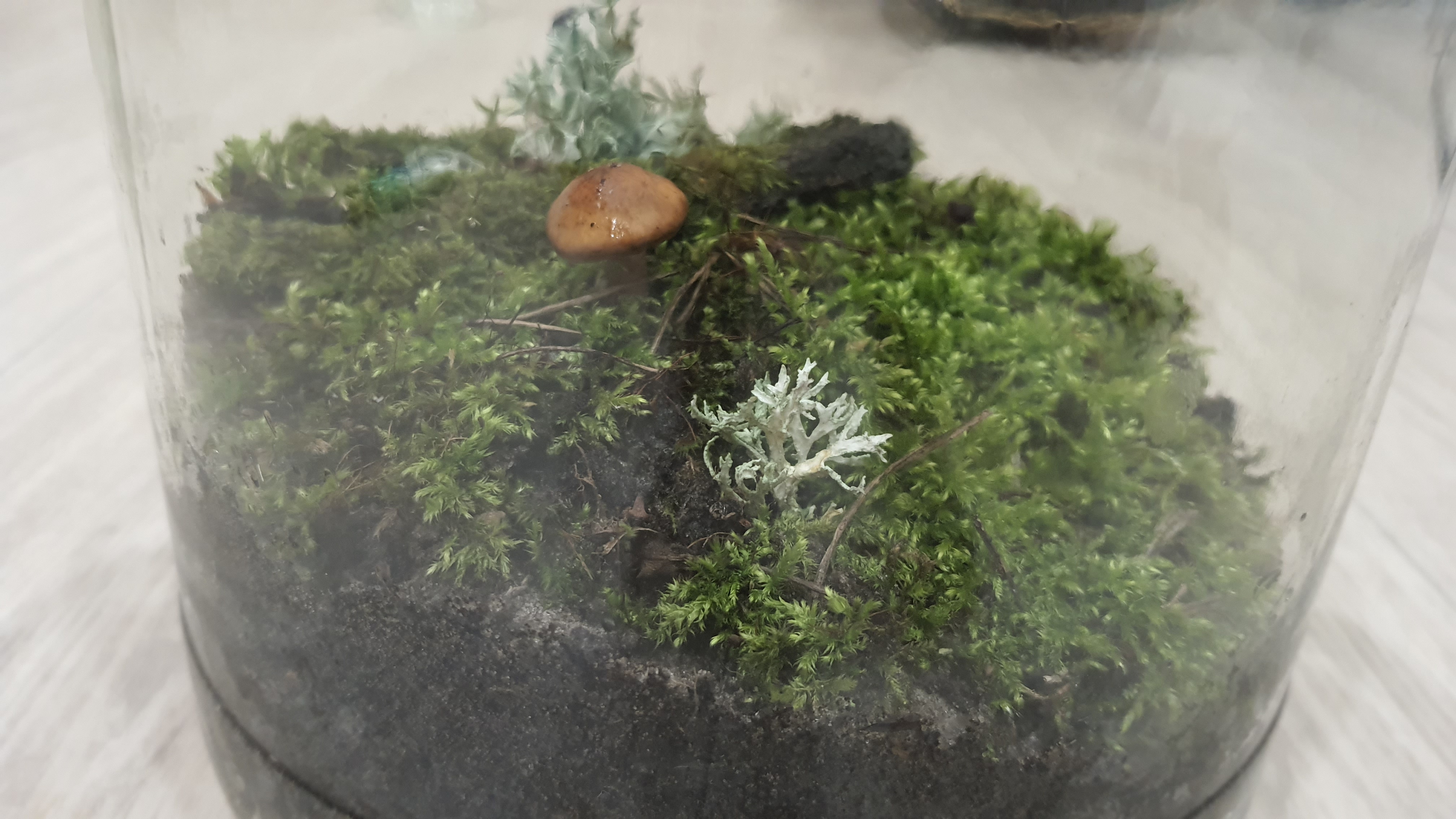 Вкачусь со своей эко-банкой. Собрал в середине сентябре, бросил на дно горсть земли, сверху - кусочек коры от старого пня, обросший зеленым мхом и еще какой-то мелочью. Специально не заселял туда живность, но предполагал что в земле и коре могут попасться чьи-нибудь яйца/личинки. В итоге так и получилось, через пару недель заметил на стенке банки маленького слизня и полупрозрачную мошку. Сейчас банке ровно 3 месяца, почти перестала запотевать. Старый мох немного потускнел, но дал новые тонкие отростки. Мошку уже с месяц не видать, видимо подохла от голода, слизняк же прекрасно себя чувствует, подъедает молодые побеги и потихоньку прибавляет в размерах.