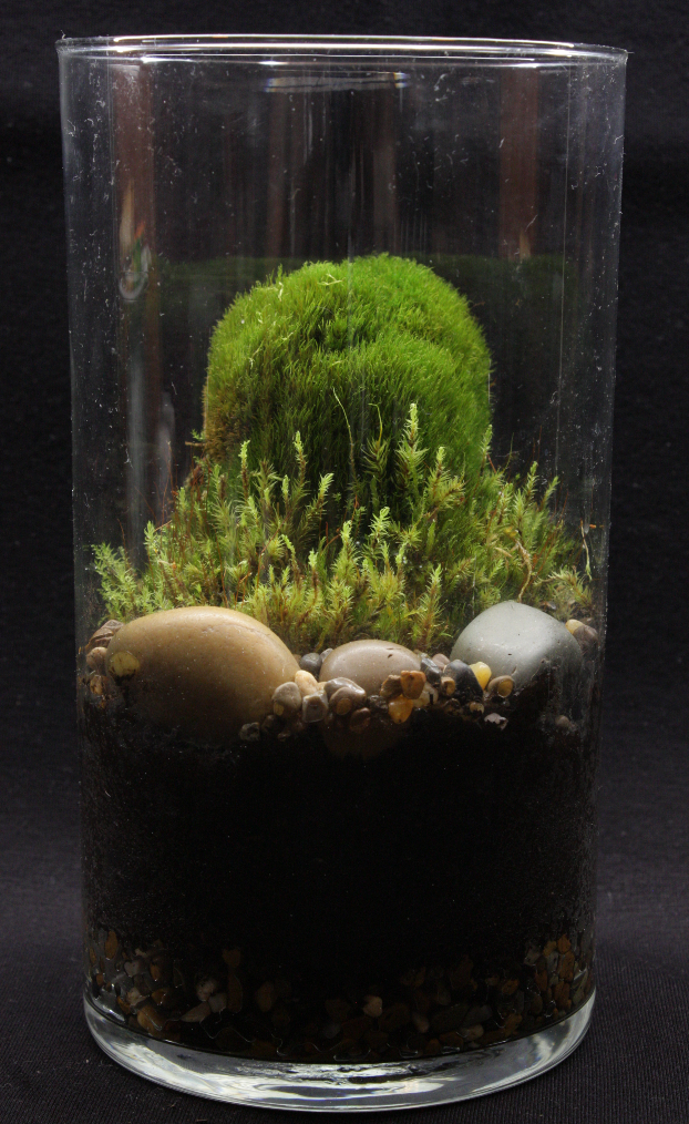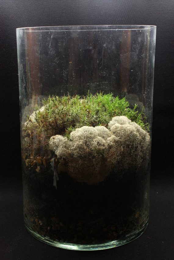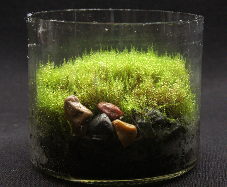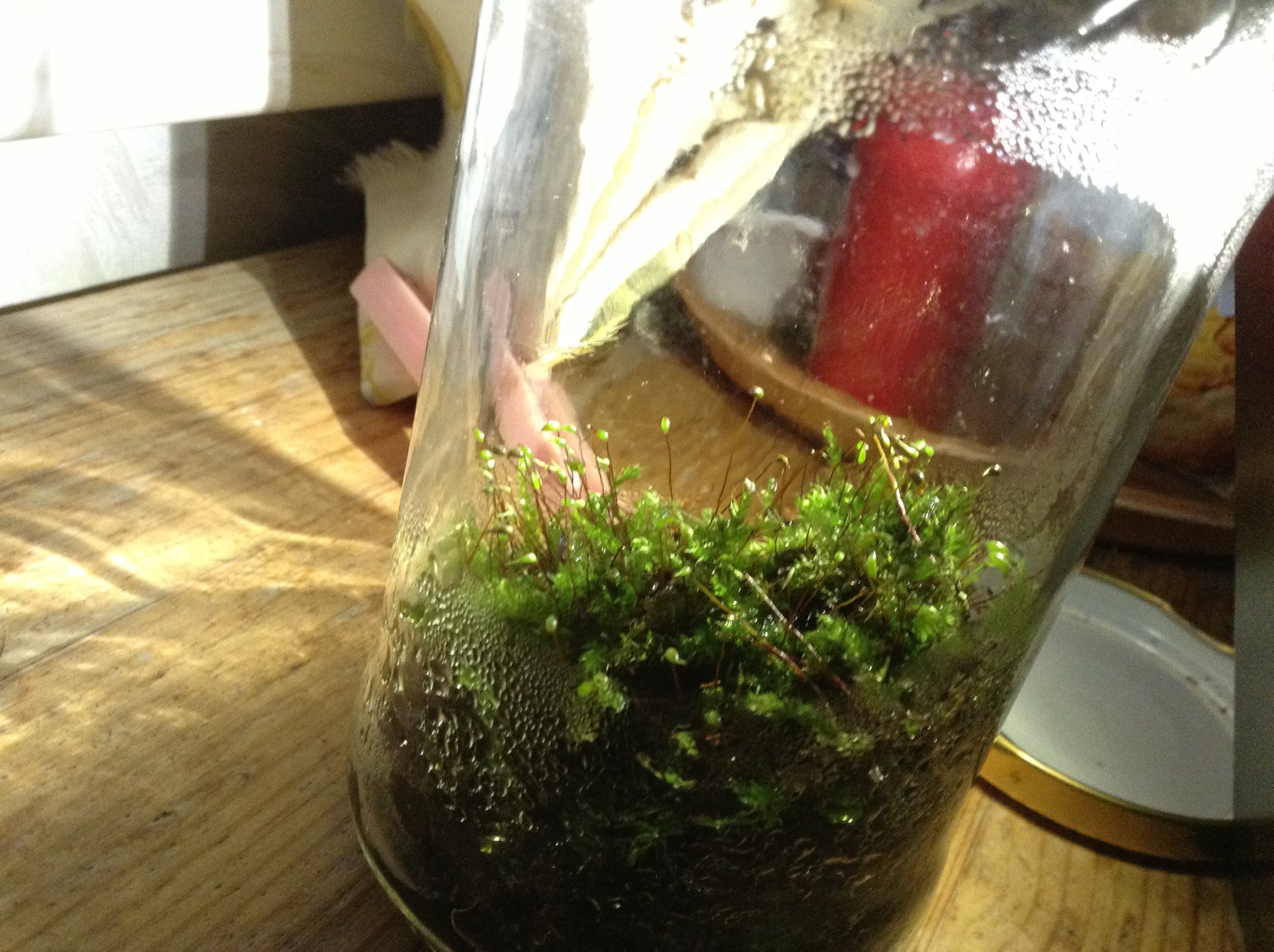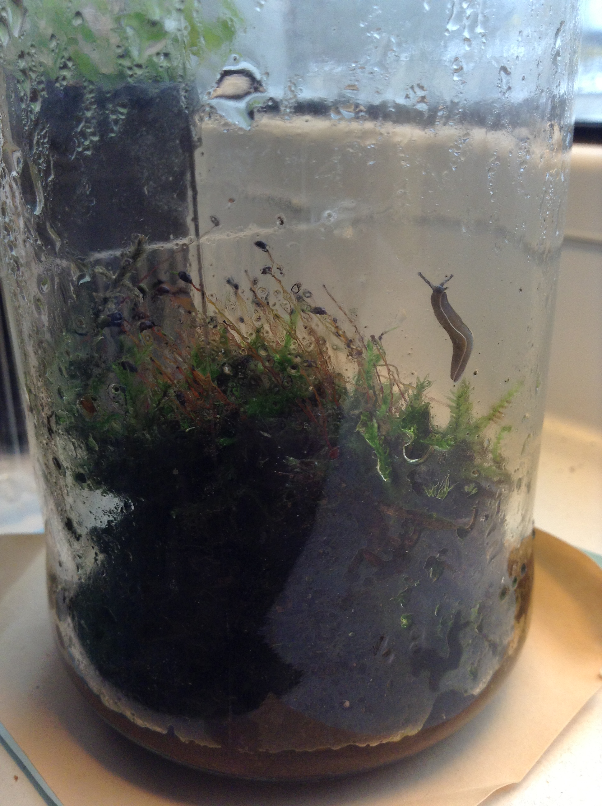 Вкачусь со своей эко-банкой. Собрал в середине сентябре, бросил на дно горсть земли, сверху - кусочек коры от старого пня, обросший зеленым мхом и еще какой-то мелочью. Специально не заселял туда живность, но предполагал что в земле и коре могут попасться чьи-нибудь яйца/личинки. В итоге так и получилось, через пару недель заметил на стенке банки маленького слизня и полупрозрачную мошку. Сейчас банке ровно 3 месяца, почти перестала запотевать. Старый мох немного потускнел, но дал новые тонкие отростки. Мошку уже с месяц не видать, видимо подохла от голода, слизняк же прекрасно себя чувствует, подъедает молодые побеги и потихоньку прибавляет в размерах.