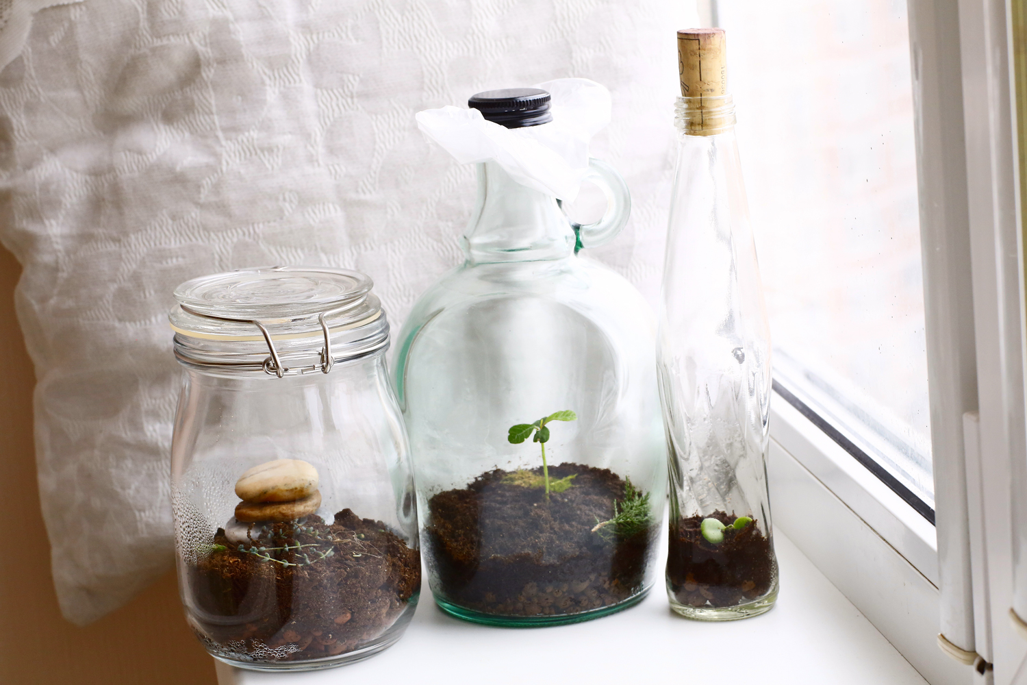 Дозвольте вкатиться. Три товарища, возраст 1 неделя В коньячной какой-то комнатный росток с работы (начал выпускать новый листок), мох, нарытый из-под снега и ветка можжевельника для няшности. В банке какие-то суккуленты с работы В лимонадной крассула толстянка. Живности нет, февраль же(