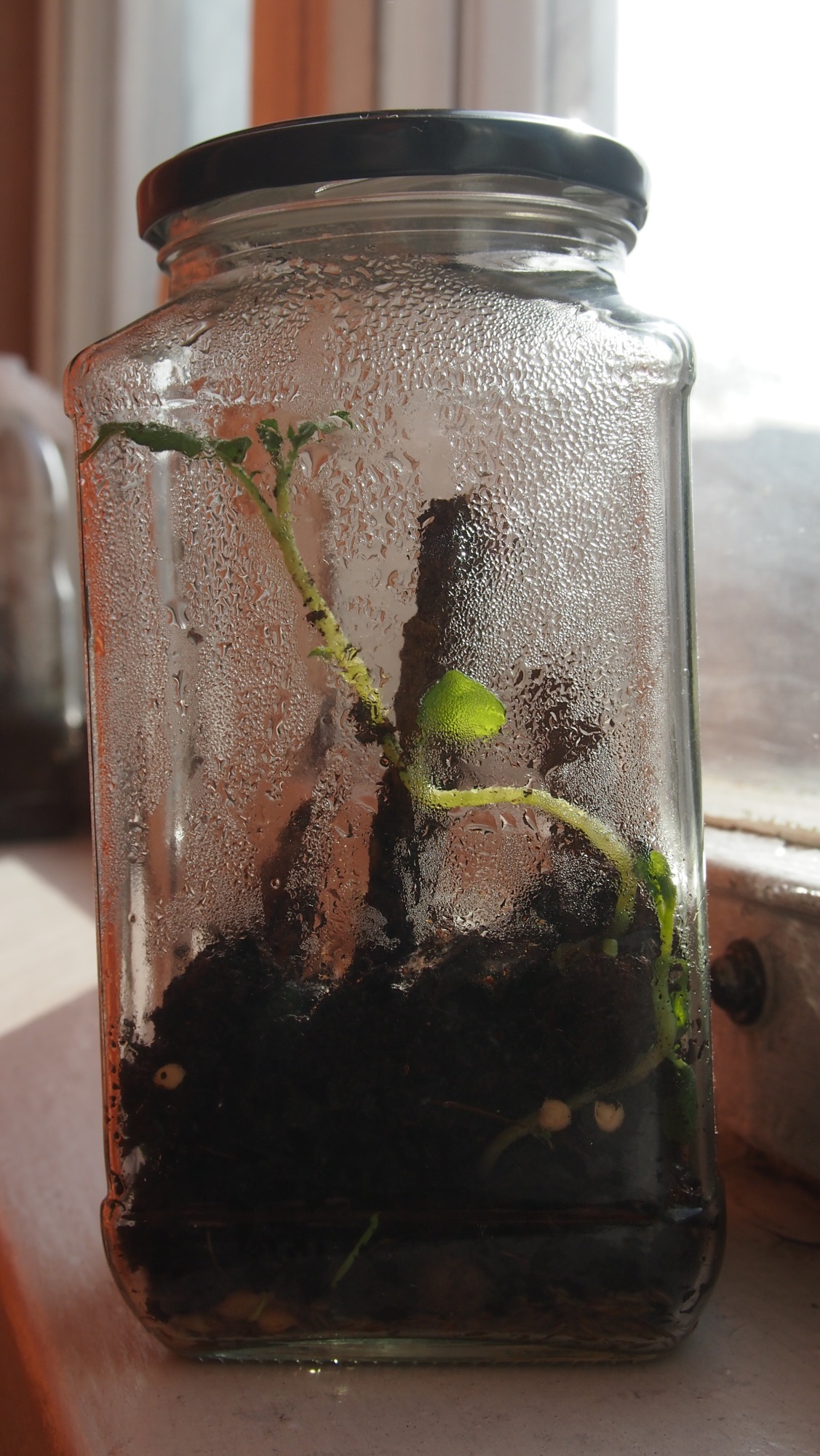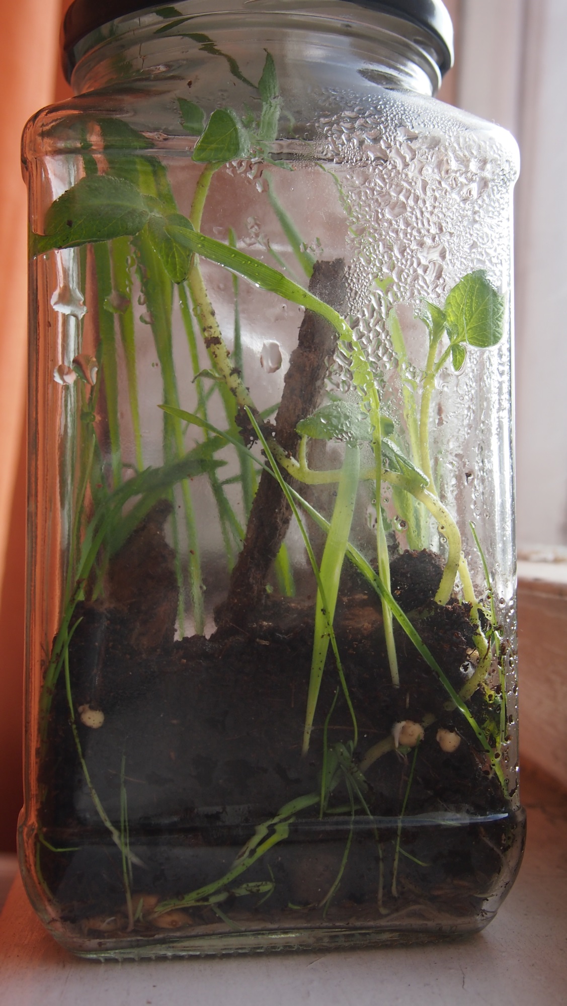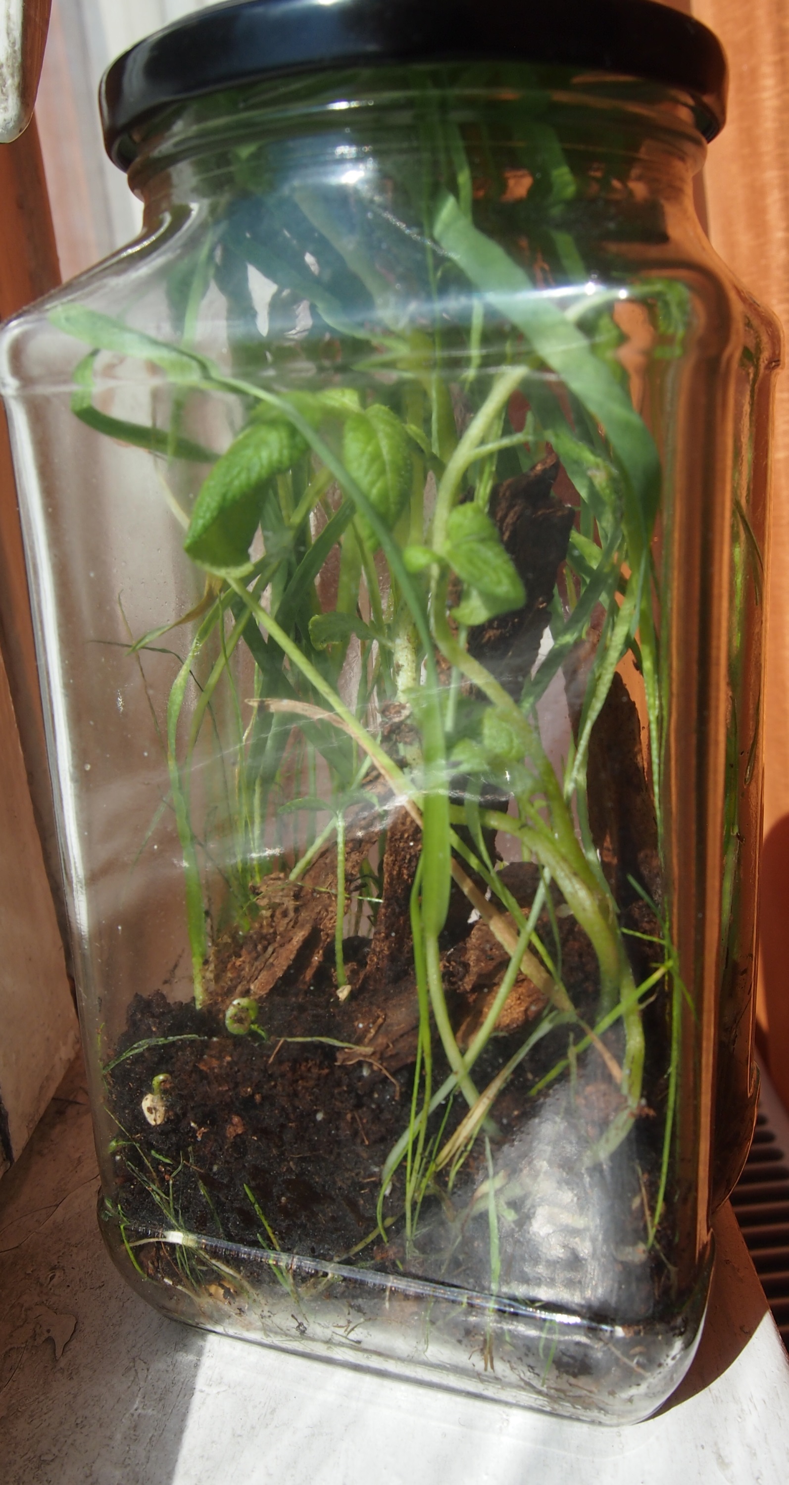 Поставил на подоконник, в то место, на которое не светят прямые солнечные лучи. Это всё ещё 5 марта было. Пока что полёт нормальный. Картопля зеленеет, мокрицы хоронятся в складках местности, червяк иногда виден через стекло (но тоже предпочитает закапываться глубоко в грунт). Много конденсата. По вечерам я открываю банку, чтобы она дышала. Но только под личным приглядом, чтобы никто не убежал из неё. Надо бы какую-нибудь марлевую крышку соорудить, что ли. Некоторые семена уже проклюнулись. А ещё сегодня накидал туда семечек от сладкого красного перца. И собираюсь и дальше засевать всякими растениями. А потом, когда более-менее зарастёт, попробовать запустить слизней или улиток. Жутко интересно, смогут ли они в итоге создать устойчивую связь, или тупо сожрут все растения и сами передохнут от голода.