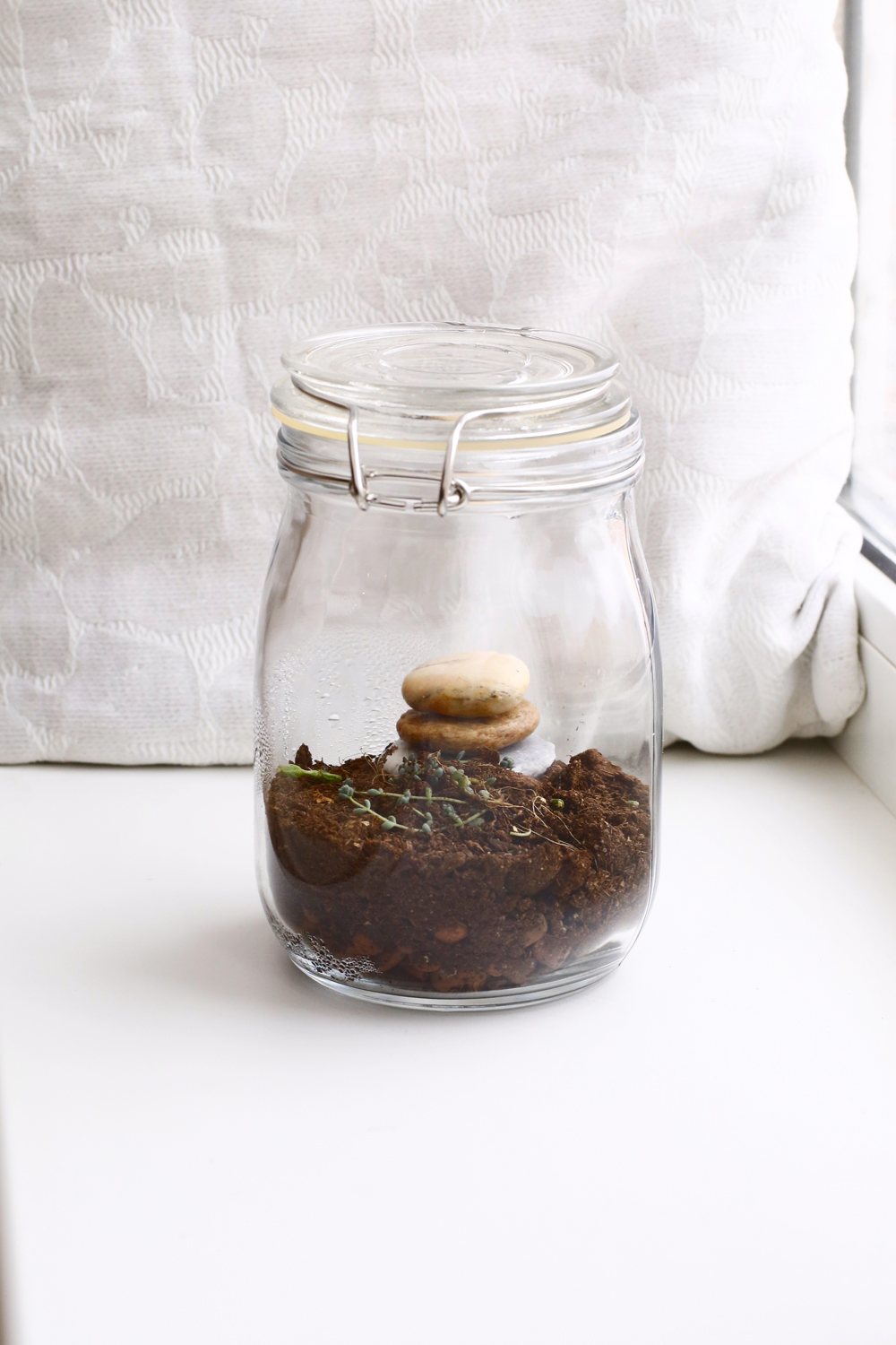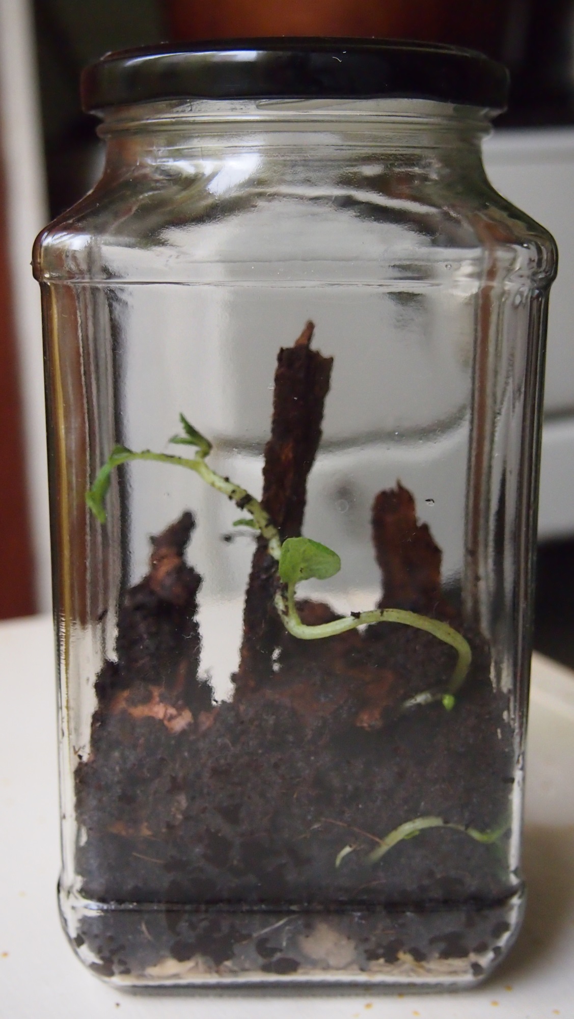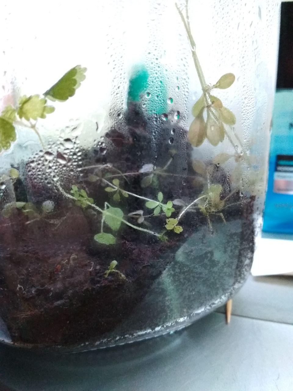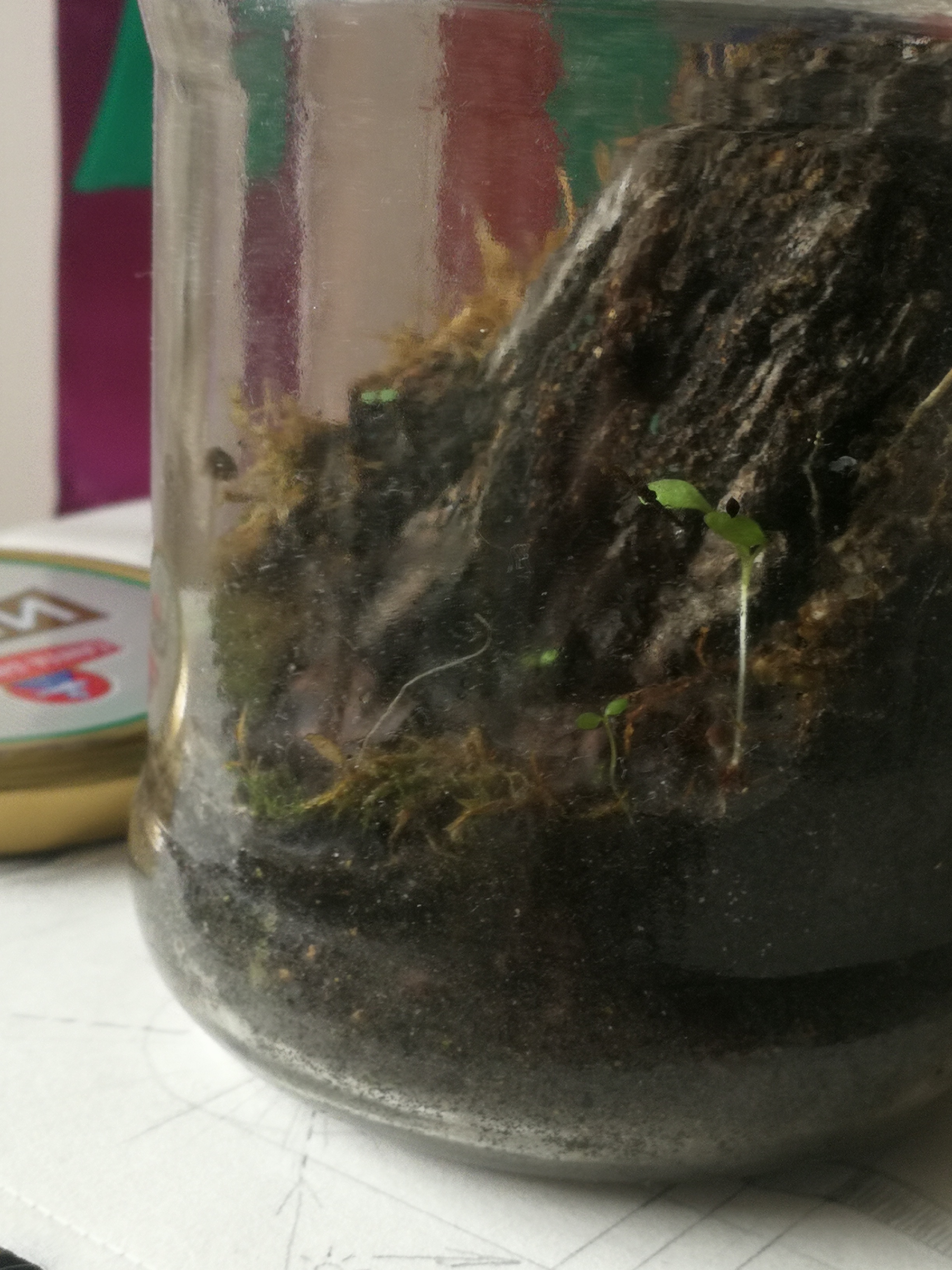 Поставил на подоконник, в то место, на которое не светят прямые солнечные лучи. Это всё ещё 5 марта было. Пока что полёт нормальный. Картопля зеленеет, мокрицы хоронятся в складках местности, червяк иногда виден через стекло (но тоже предпочитает закапываться глубоко в грунт). Много конденсата. По вечерам я открываю банку, чтобы она дышала. Но только под личным приглядом, чтобы никто не убежал из неё. Надо бы какую-нибудь марлевую крышку соорудить, что ли. Некоторые семена уже проклюнулись. А ещё сегодня накидал туда семечек от сладкого красного перца. И собираюсь и дальше засевать всякими растениями. А потом, когда более-менее зарастёт, попробовать запустить слизней или улиток. Жутко интересно, смогут ли они в итоге создать устойчивую связь, или тупо сожрут все растения и сами передохнут от голода.
