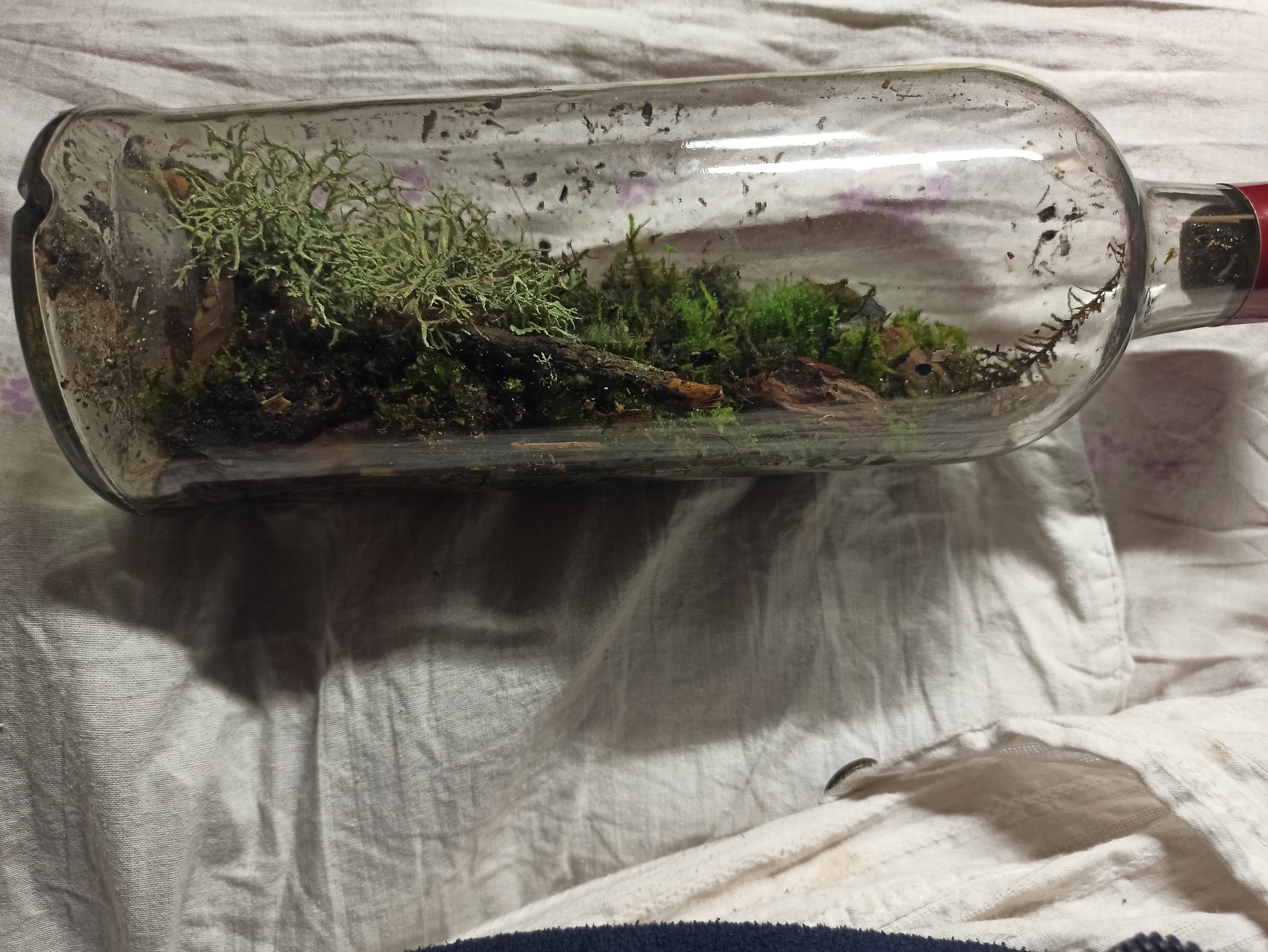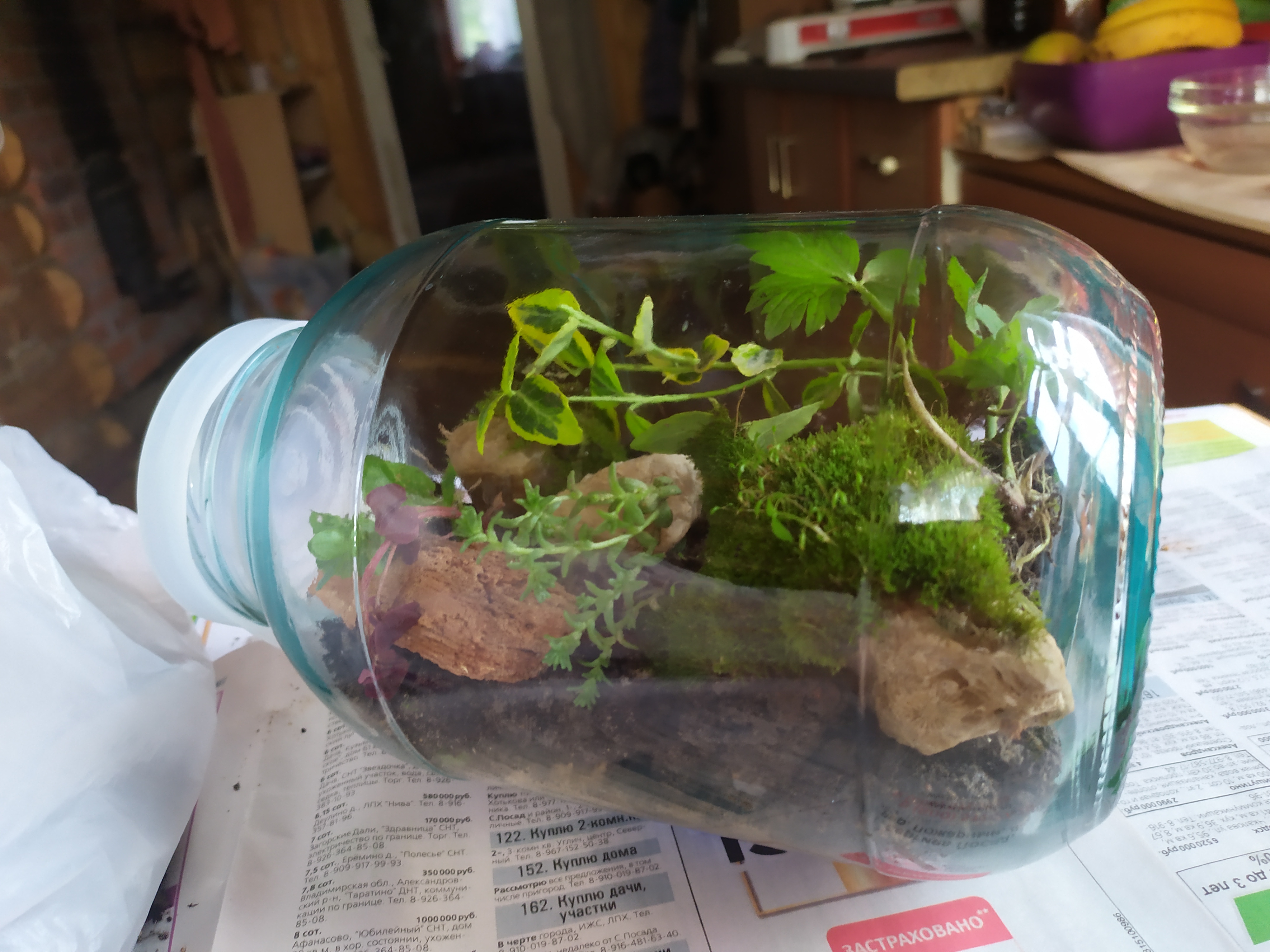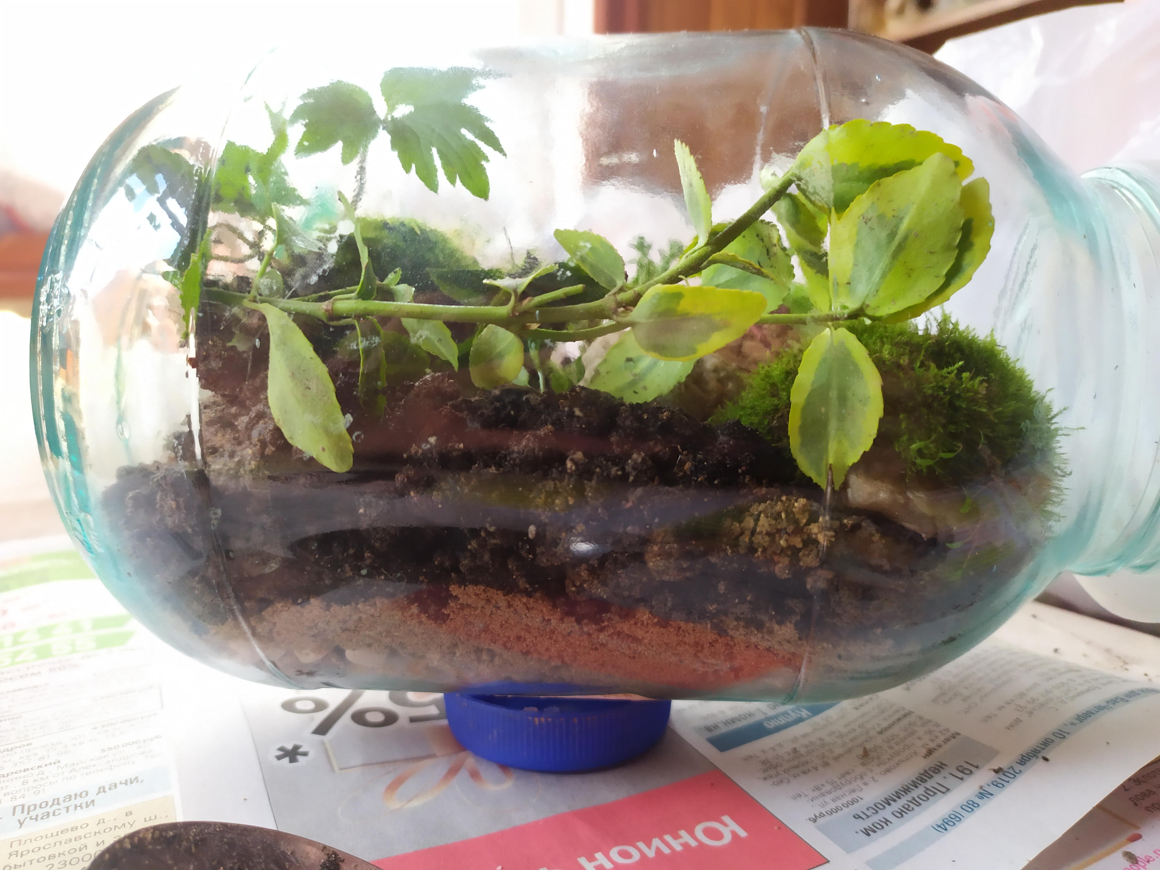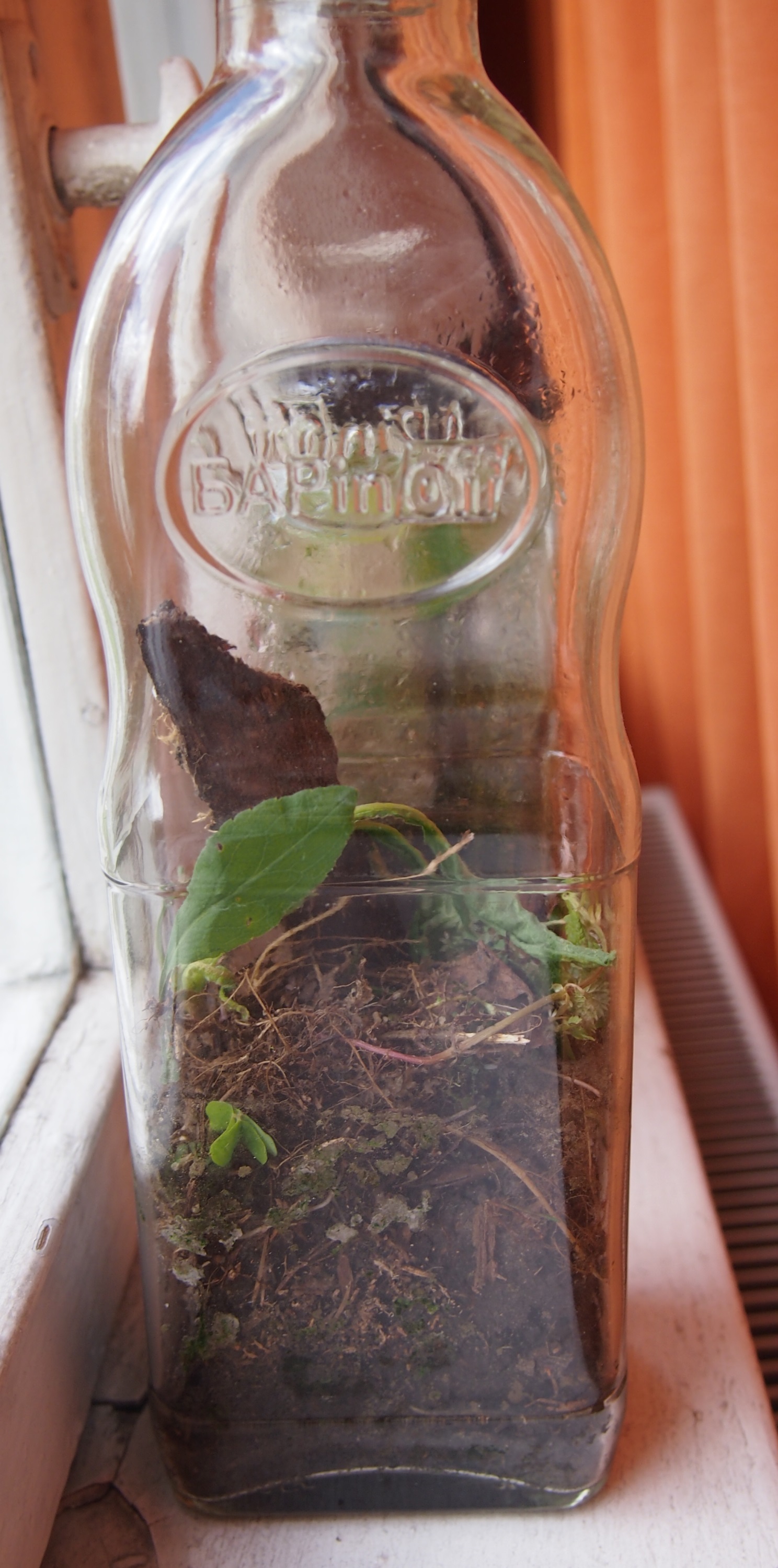Сделал ребенку на окруж мир в бутылке из под Стратислы 1L. Посадил: камушки, песочек с опилками, мох от коры, просто мох (какой-то другой), кору со мхом и маленький клевер. Вместе с корой попались мокрицы в кол-ве 4 шт. Всё залепил термоклеем. Повесил бирку с назиданием: "Не переворачивать". Хрен с этими мокрицами - сожрут что-то хорошее - им же хуже. Старался соблюсти основные правила: фотосинтез - мох и прочие днищевые растения, дренаж, кора дерева и НЕ ПЕРЕБАРЩИВАТЬ с водой. Много воды - самая распространенная ошибка. И то - капнул пару капель, закрыл, а на стенках сразу пот... Хотя вроде земля была сухая.. Через пару лун вернусь.