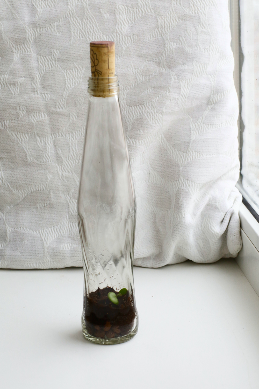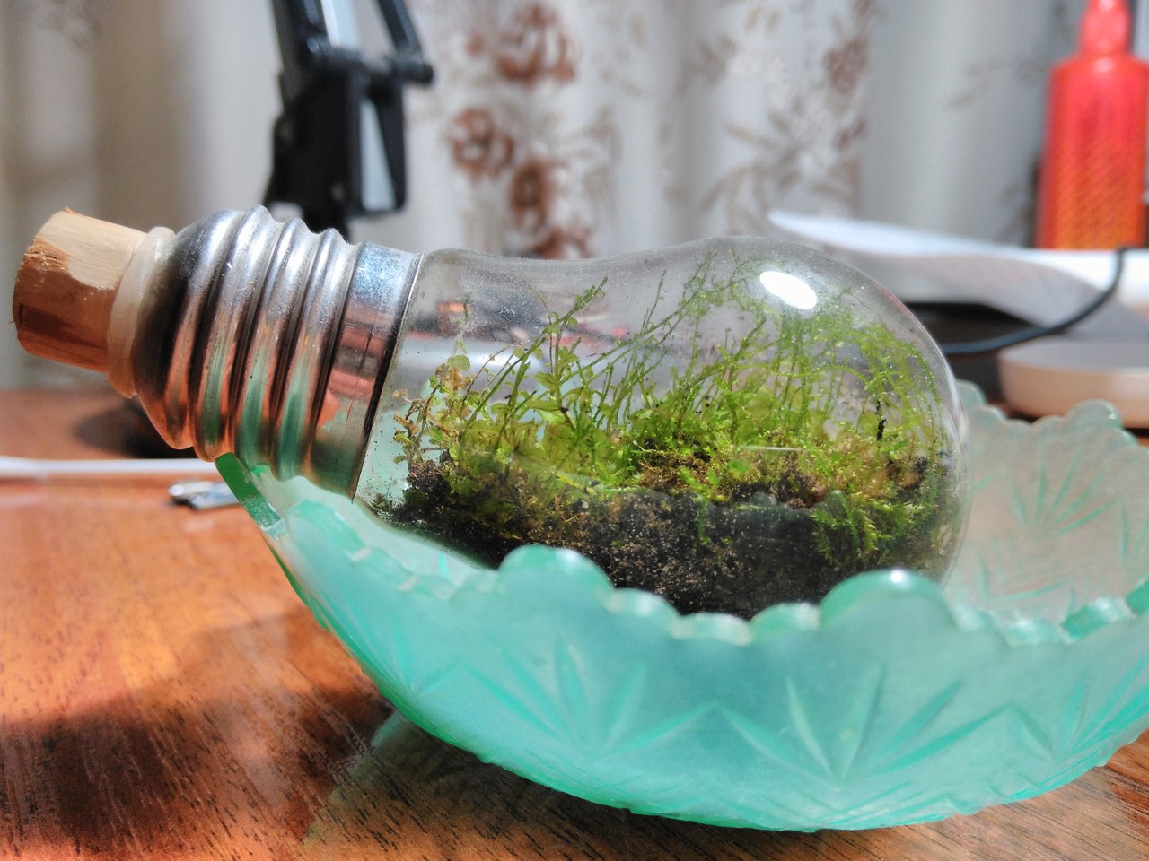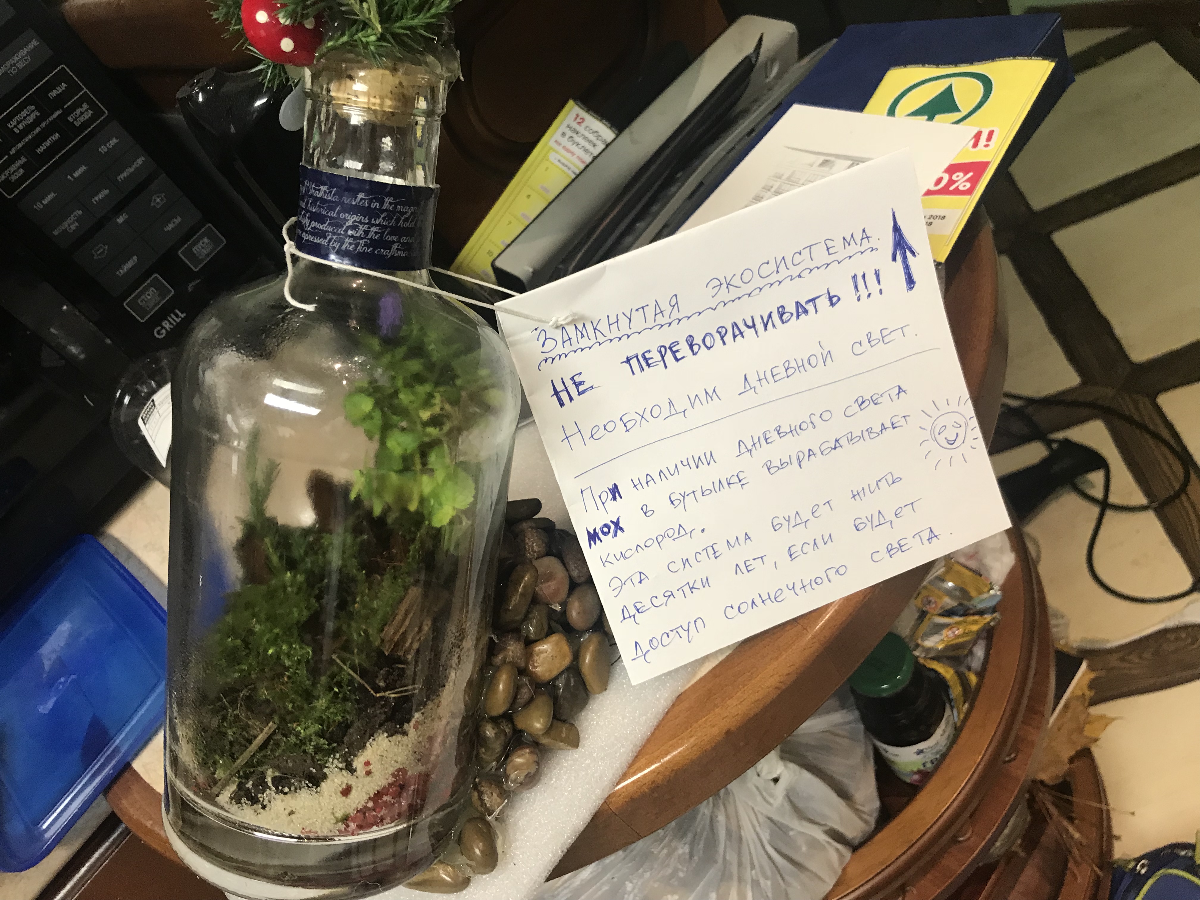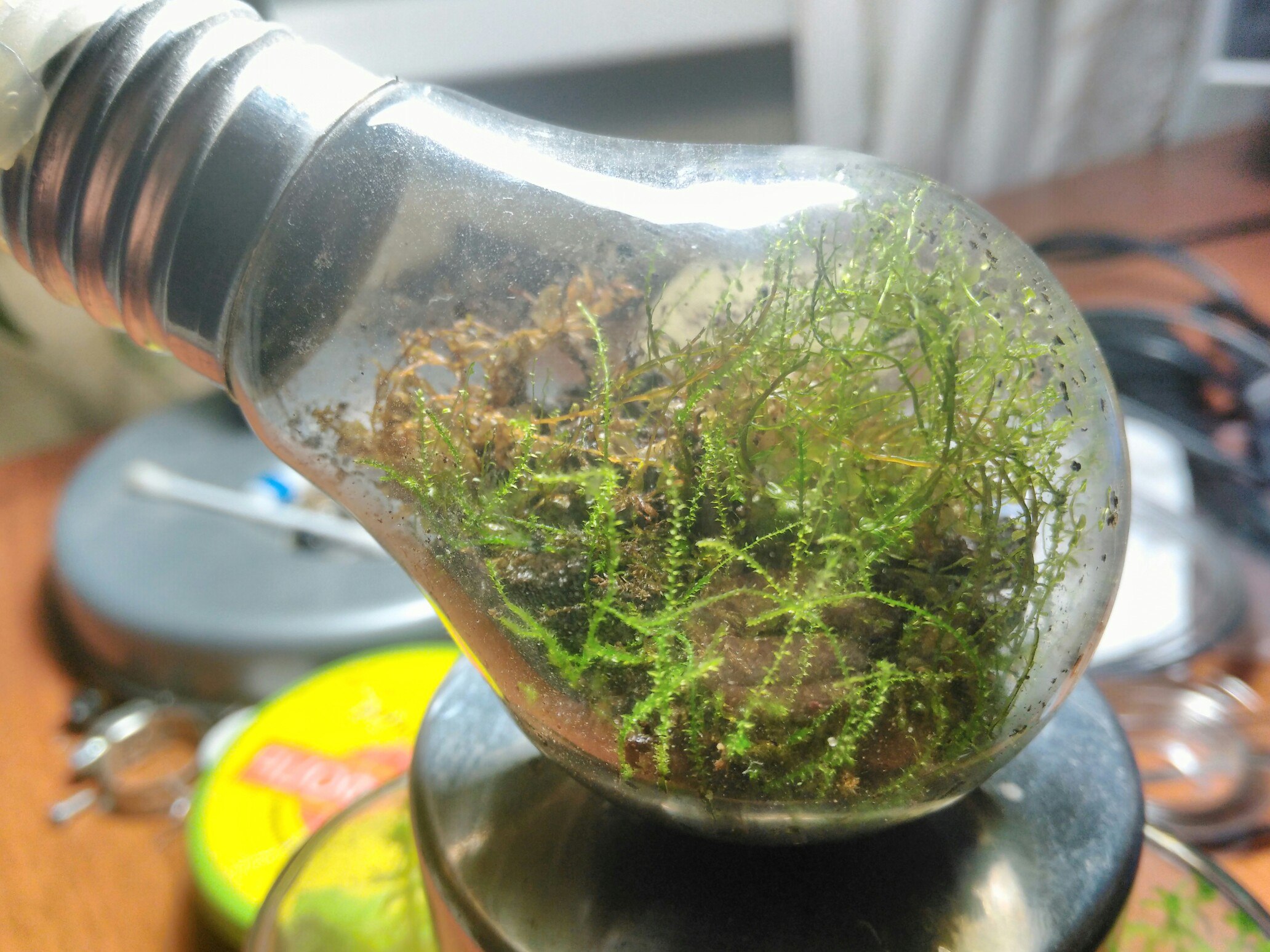 Сделал ребенку на окруж мир в бутылке из под Стратислы 1L. Посадил: камушки, песочек с опилками, мох от коры, просто мох (какой-то другой), кору со мхом и маленький клевер. Вместе с корой попались мокрицы в кол-ве 4 шт. Всё залепил термоклеем. Повесил бирку с назиданием: "Не переворачивать". Хрен с этими мокрицами - сожрут что-то хорошее - им же хуже. Старался соблюсти основные правила: фотосинтез - мох и прочие днищевые растения, дренаж, кора дерева и НЕ ПЕРЕБАРЩИВАТЬ с водой. Много воды - самая распространенная ошибка. И то - капнул пару капель, закрыл, а на стенках сразу пот... Хотя вроде земля была сухая.. Через пару лун вернусь.