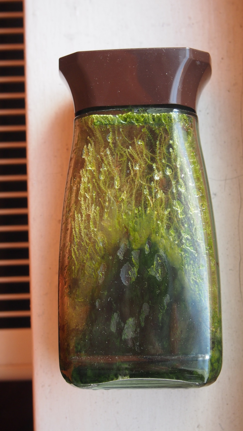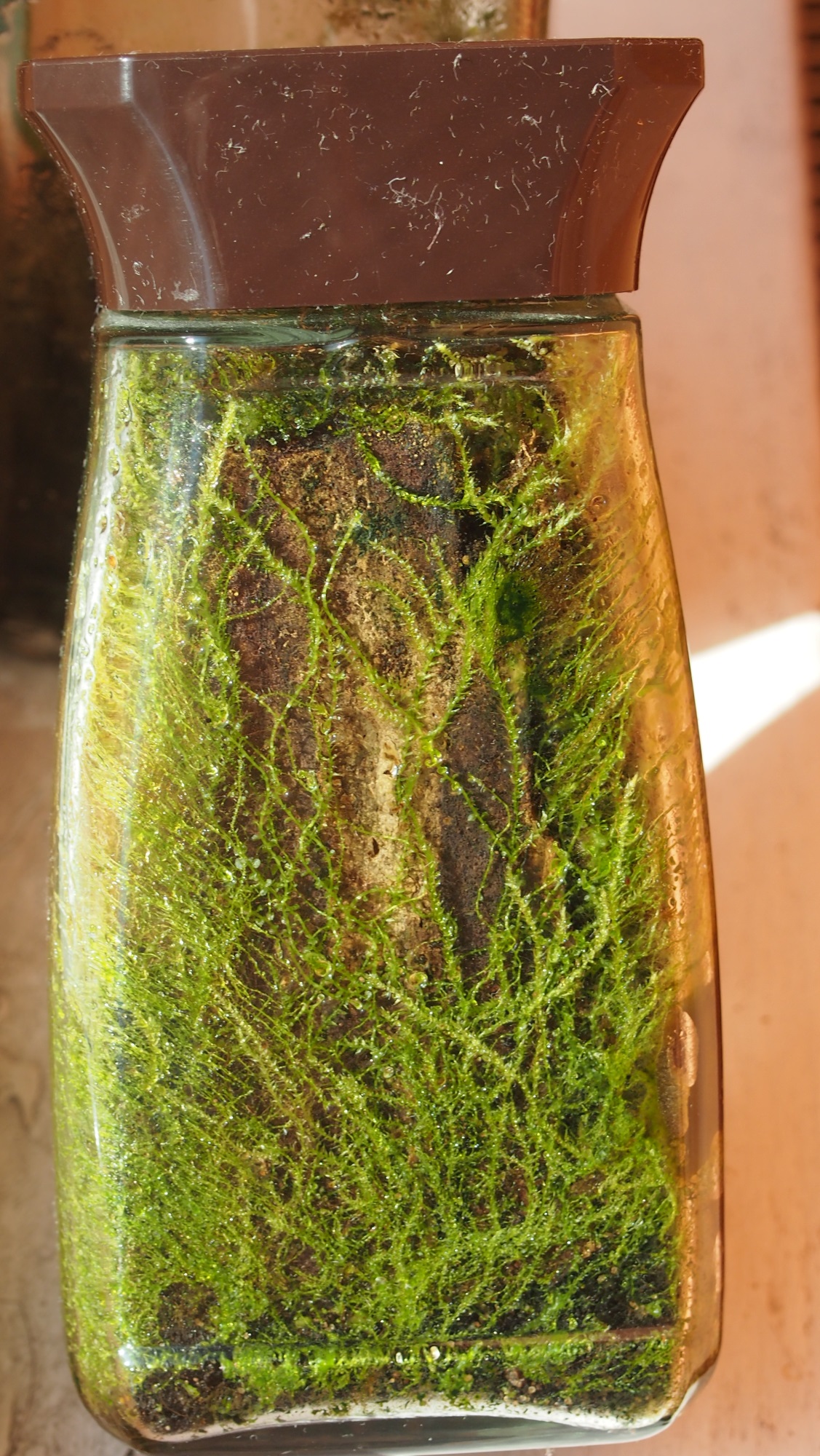 В банке от кофе никаких изменений. Мох занял всё пространство, водоросли ждут солнечных дней, чтобы продолжить экспансию. Разве что, появились довольно большие "пузыри" на передней стенке банки, где водоросли отходят от стекла. Из животных видно только мелких беловатых червячков, меньше миллиметра размером. Большой дождевой червяк не то прячется, не то сдох.