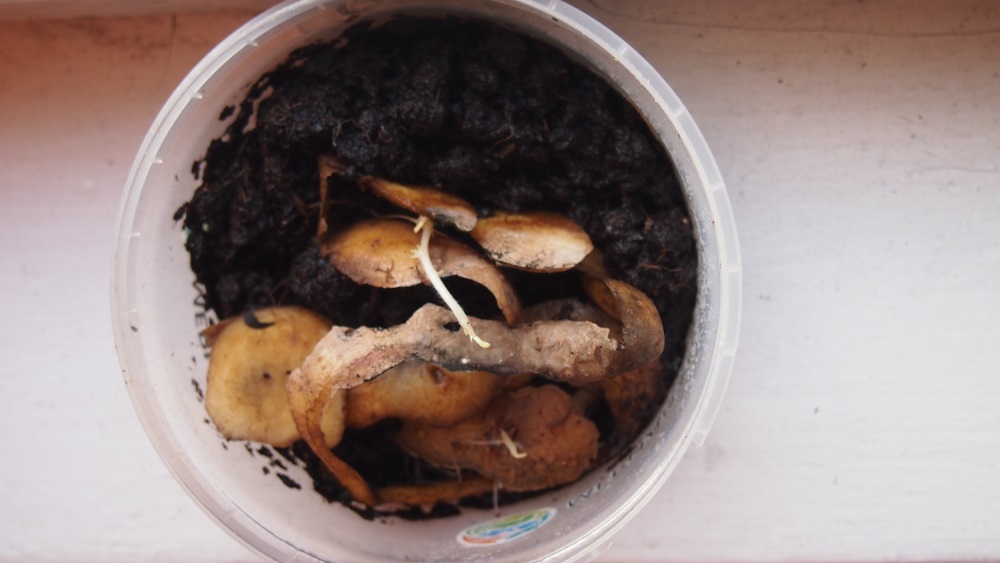 А вот банка с парой дождевых червей. Раньше они жили в стеклянной, но пришлось пересадить. Я рассчитывал на их размножение, но что-то не получается. С прошлого мая сычуют, а о потомстве не думают. Тлетворное влияние двача, наверное. Так вот, я им кинул картофельных очистков на прокорм. Думал, что будут потихоньку гнить, а червяки их объедать. А картофель взял - и пророс. Фото 20-дневной давности, сейчас там уже несколько ростков, позеленевших на конце.