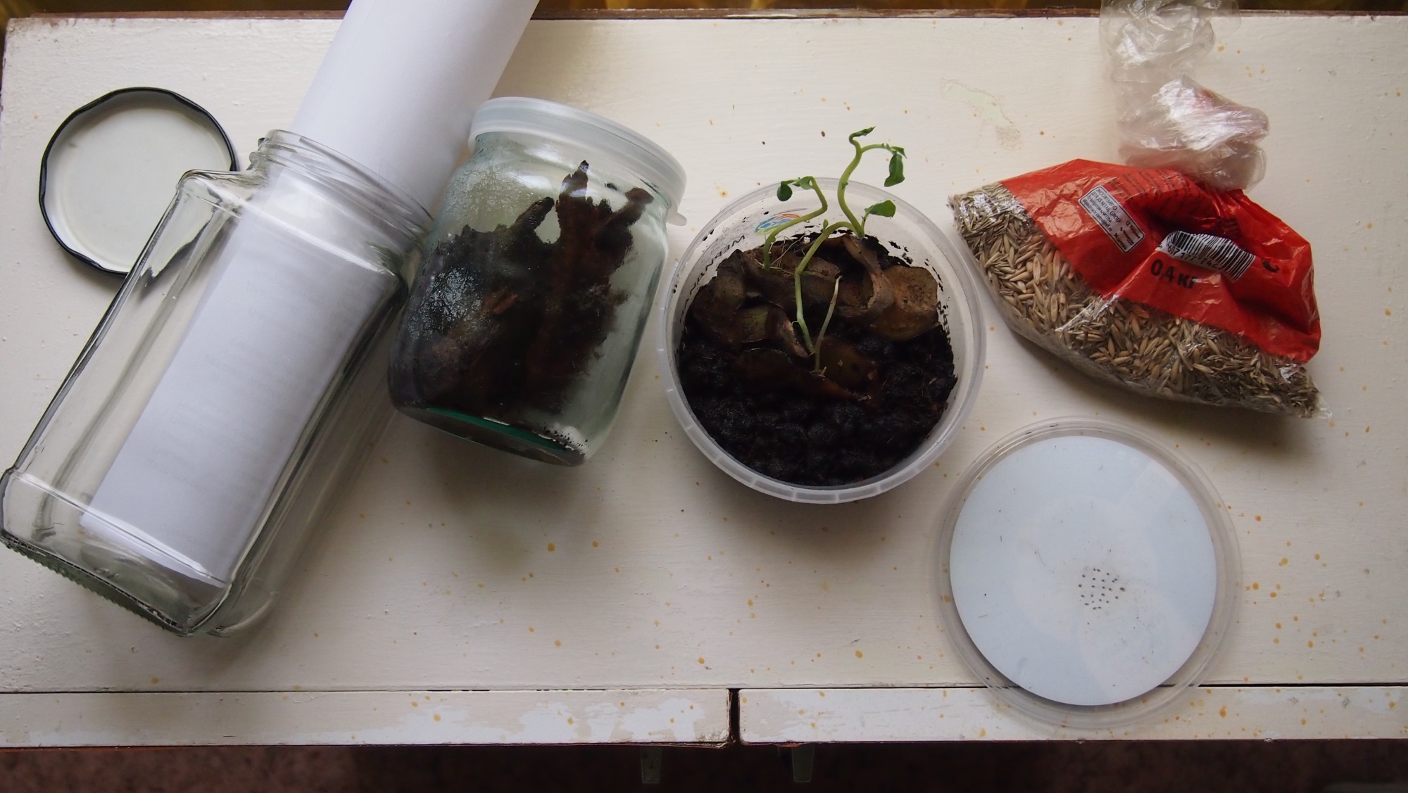В общем, я взял очередную банку (из-под солёных грибов) на 800мл и заселил её. Кстати, на банке была приклеена этикетка "Шампиньоны", на ценнике значилось "Грузди", а в чеке "Грибы Шиитаке". Но ничего, не отравился. На первой фотографии слева-направо: сначала эта банка, потом временное жильё мокриц, потом картопля с червяками (одна штука) и справа пакетик с семенами. Газонная трава и овёс. Семена старые, года три им, мало что проклюнется. Сначала я засыпал немного семян на дно банки, потом засадил картоплю и засыпал через свёрнутую трубкой бумагу (чтобы не пачкать стенки) землю. Воткнул три кусочка сосновой коры. Ну и вселил червяка и мокриц. А личинки дрозофилы и так были на коре и в грунте. Получилось пока что симпатично.
