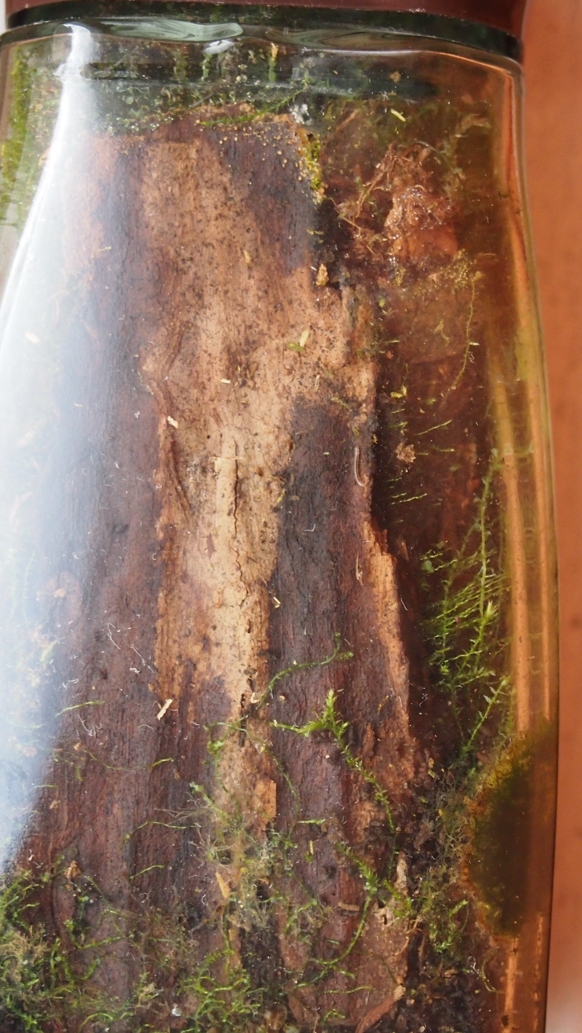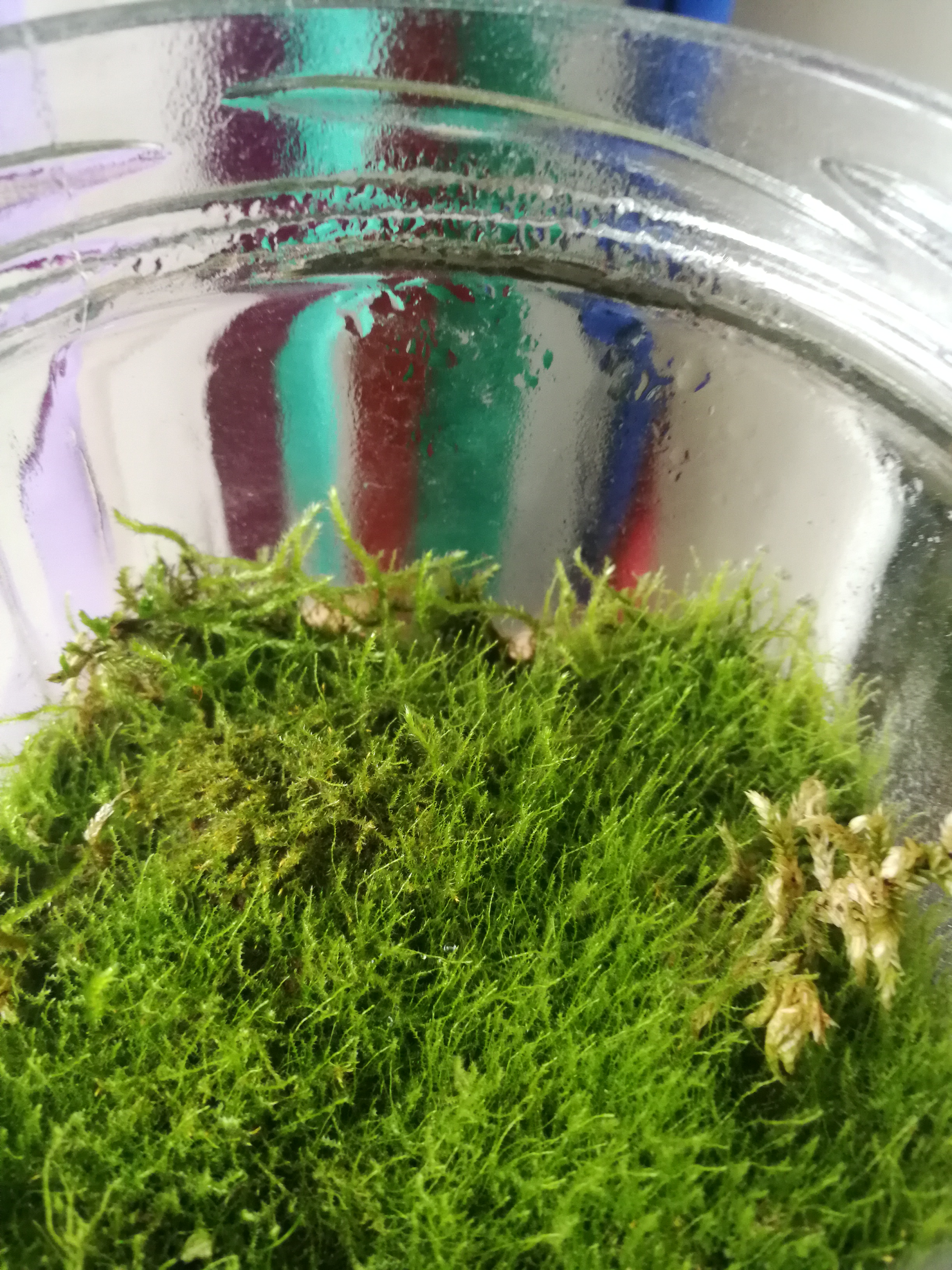 13 сентября исполнилось джва года банке из под кофе. Мох там себя чувствует великолепно. Пострадавший от прямых солнечных лучей и побуревший мох отдаёт место новой поросли. Эта новая поросль захватывает все места, в том числе даже сзади, где к стеклу прилегает кусок коры. Прилегал он неплотно, вот и результат. А ещё мох отжимает поверхность банки у водорослей. Получается так: - Водоросли размножаются на стекле и выделяют кислород. - Из-за этого появляются пузыри между стеклом и слоем водорослей. - В эти пузыри заползают ростки мха. Так что вероятность полного захвата банки водорослями сильно уменьшается.