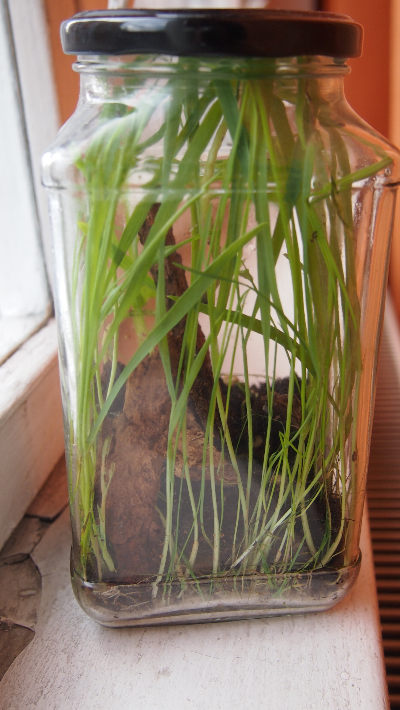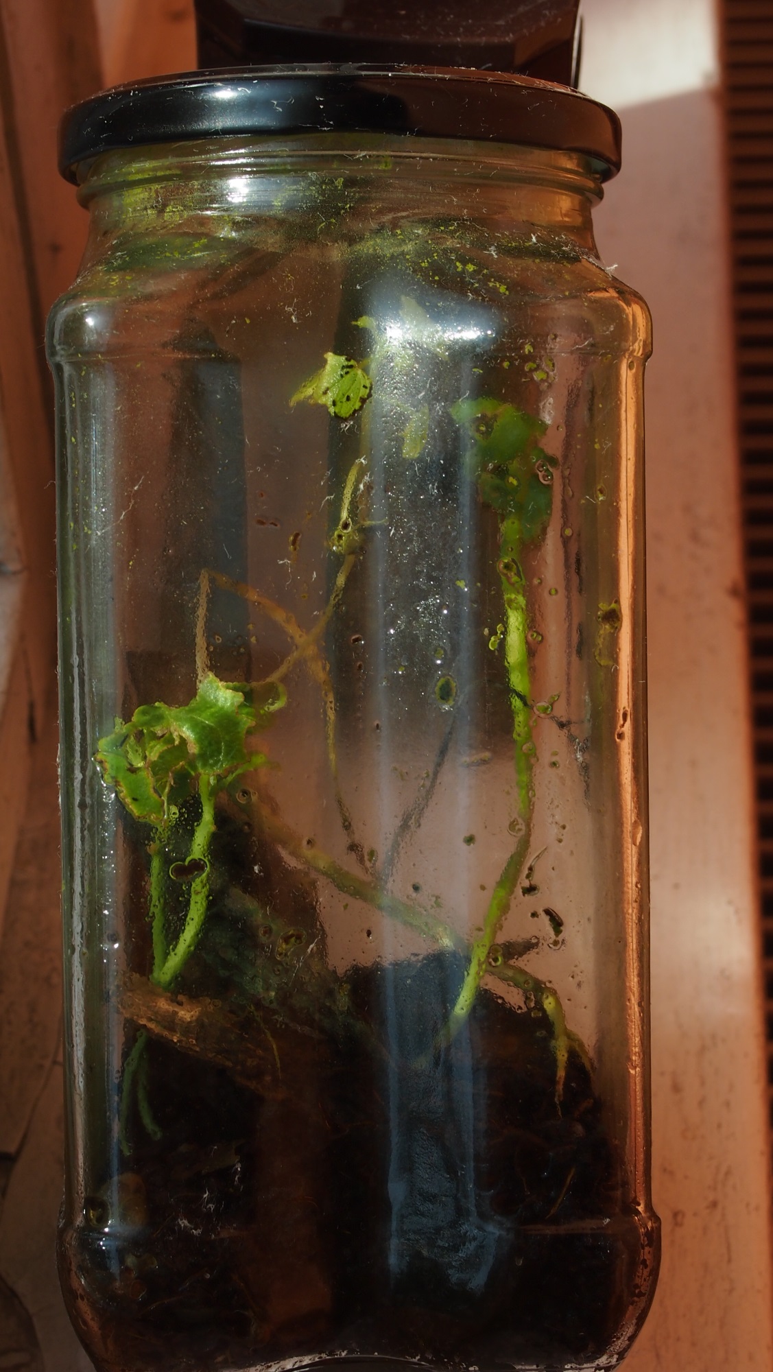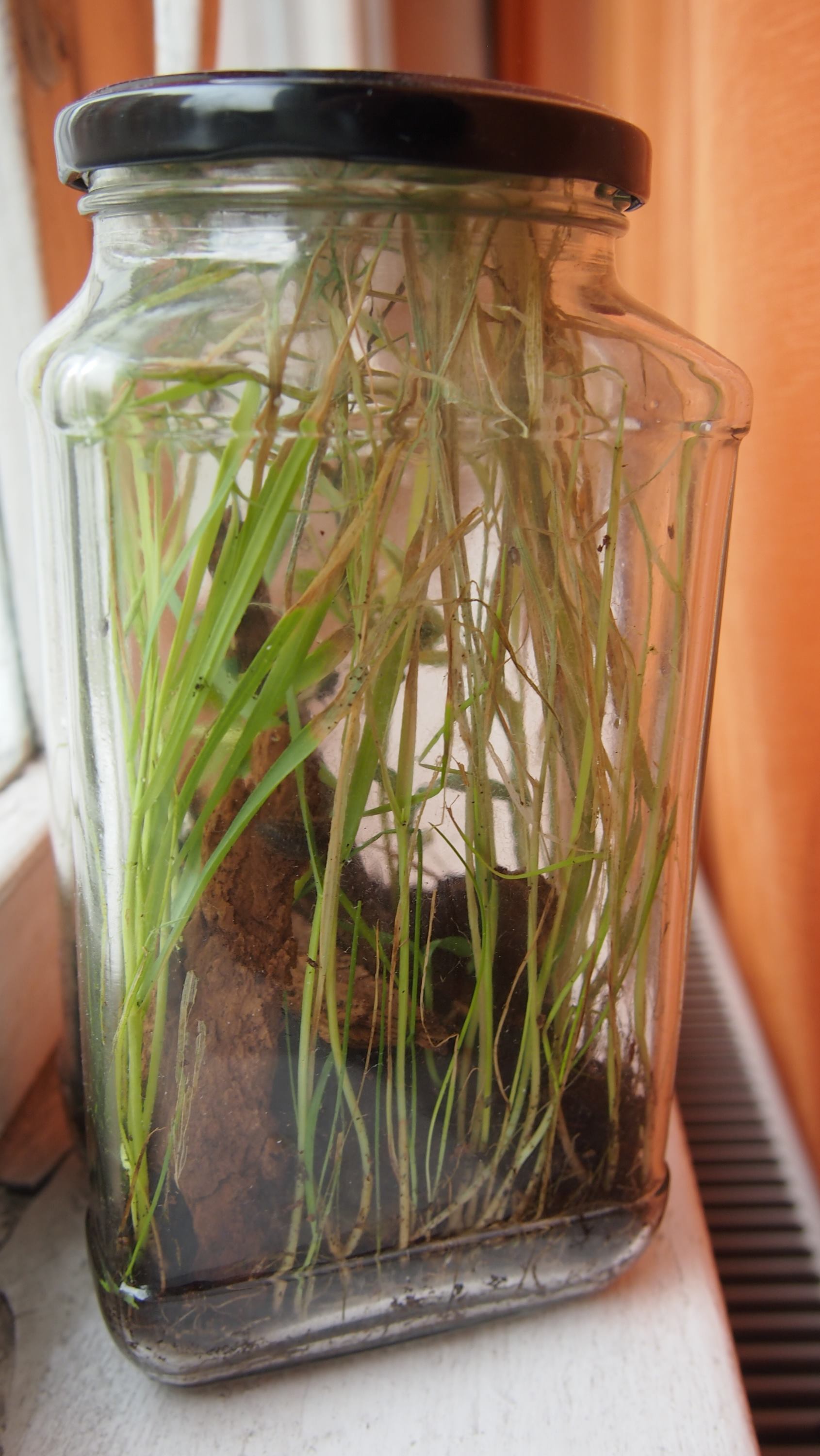 Кстати, вспомнил. В начале декабря я туда сыпанул немного зёрен овса (живых) и луговой травы. Трава не взошла, а овёс пророс и упёрся в верх банки. А потом очень быстро зачах и умер. Банка смерти какая-то.