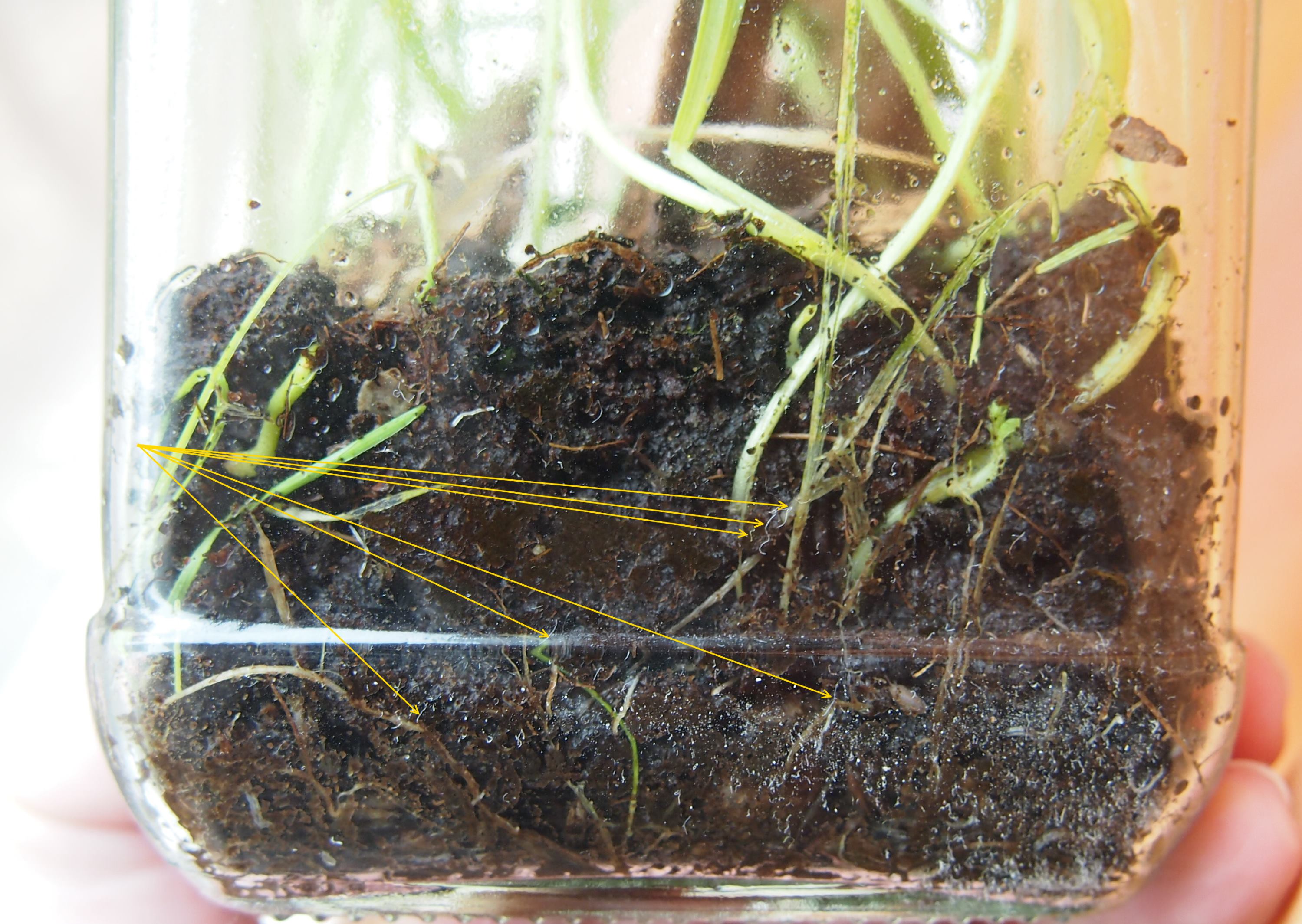 В третьей банке часть растений умирает. Во-первых, те листья и стебли, которые прилипают к стенкам банки. Во-вторых, некоторые семена, давшие всходы, но как-то дальше у них не идёт. Но в целом, флора процветает. И банка явно для неё мала. Из фауны господствующая позиция у дрозофилы. В грунте кое-где шевелятся их личинки, а на поверхности летают взрослые. Кроме того, достигнуты успехи в размножении мокрицы. Все три крупных особи живы, да ещё появилась мелочь. На последнем фото показал их тонкими стрелочками. Кстати, от яркого света они прячутся. Да и крупных можно увидеть только достав банку с окна вечером.