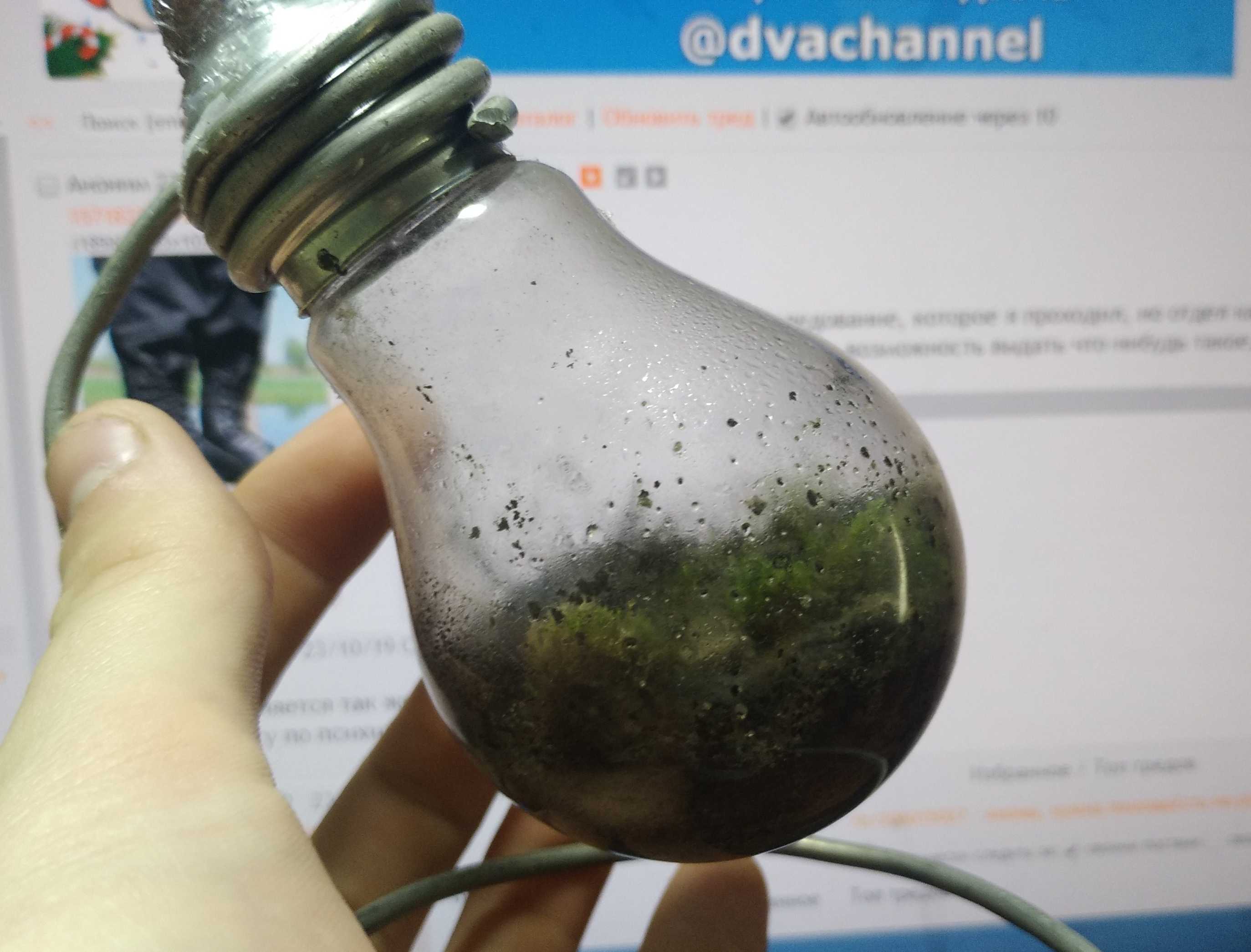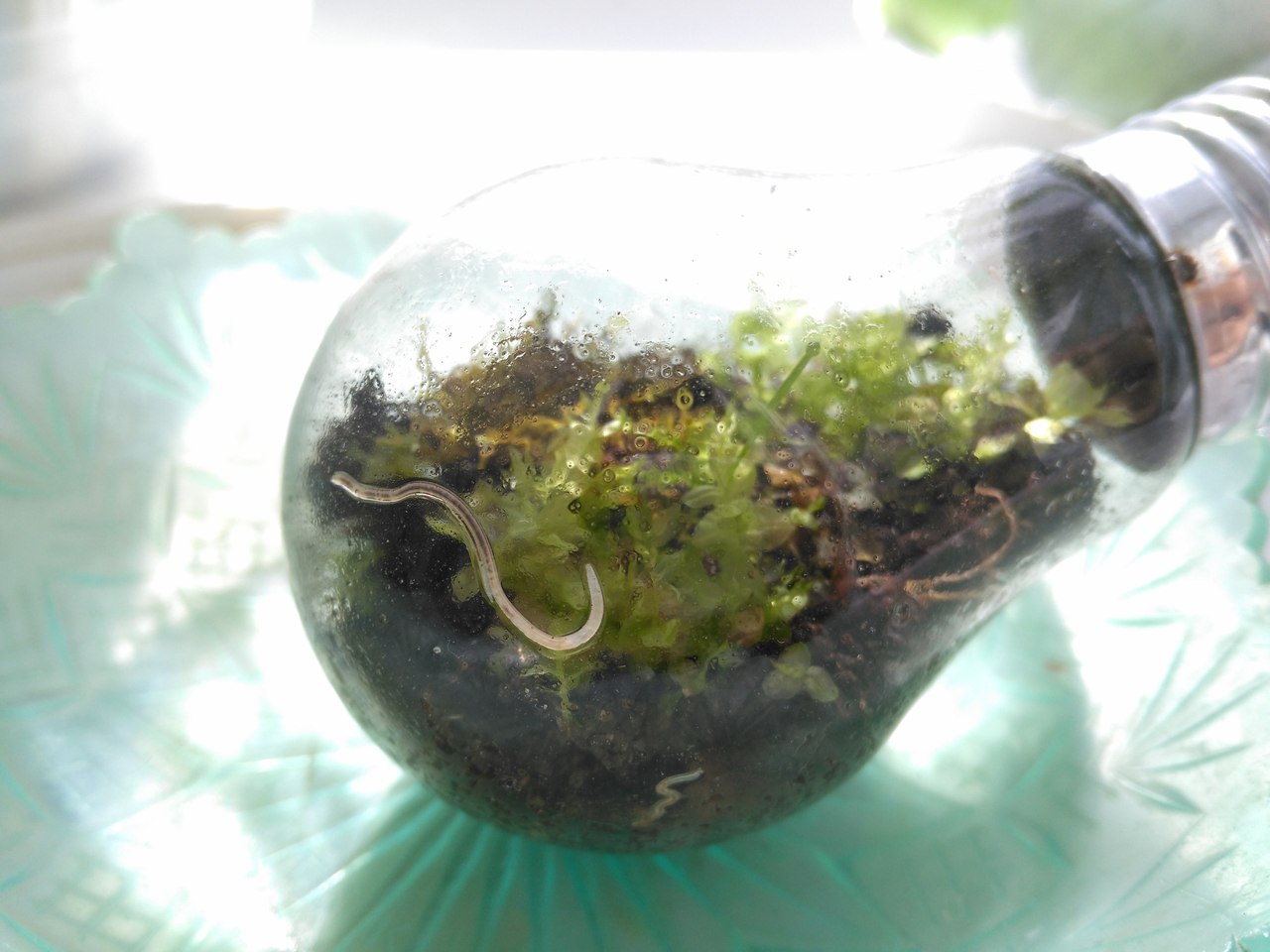 >>120405 Прогресс на сегодняшний день. Что-то подсохло и погибло, что-то живёт, зеленеет и закручивается по стенкам лампочки. Нематоды не вылезли больше ни разу.