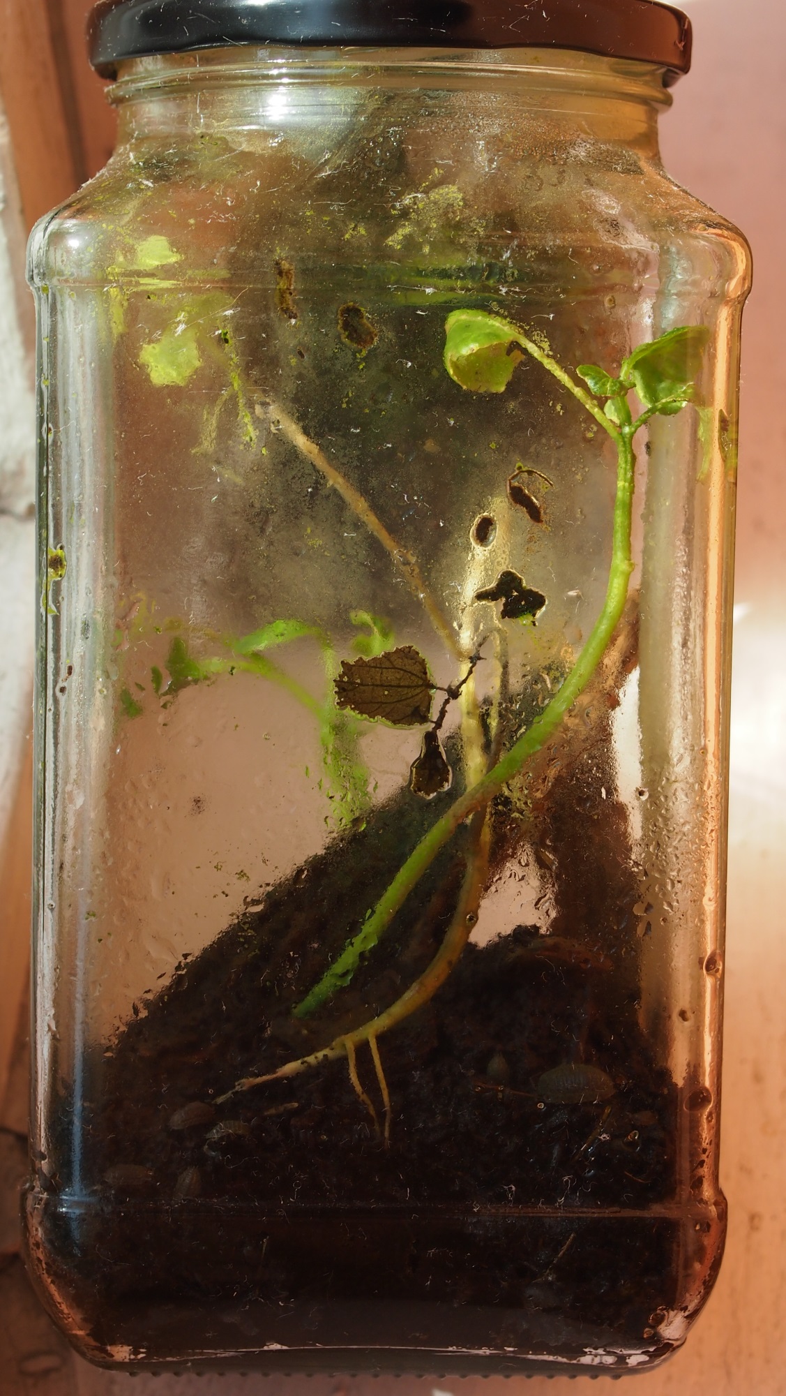 С третьей банкой тоже не всё хорошо. Вся трава сгнила. Разве что, в одном месте овёс пытается отстрелить новый побег. Картофель тоже сгнил. Не знаю, почему так произошло. Сыро? Или сварились от прямых солнечных лучей? А вот перец держится. И по стенам из-за обильного конденсата повсюду размножается зелёная водоросль, делая их грязными. Ну и не только она, там ещё на стены срёт кто-то.