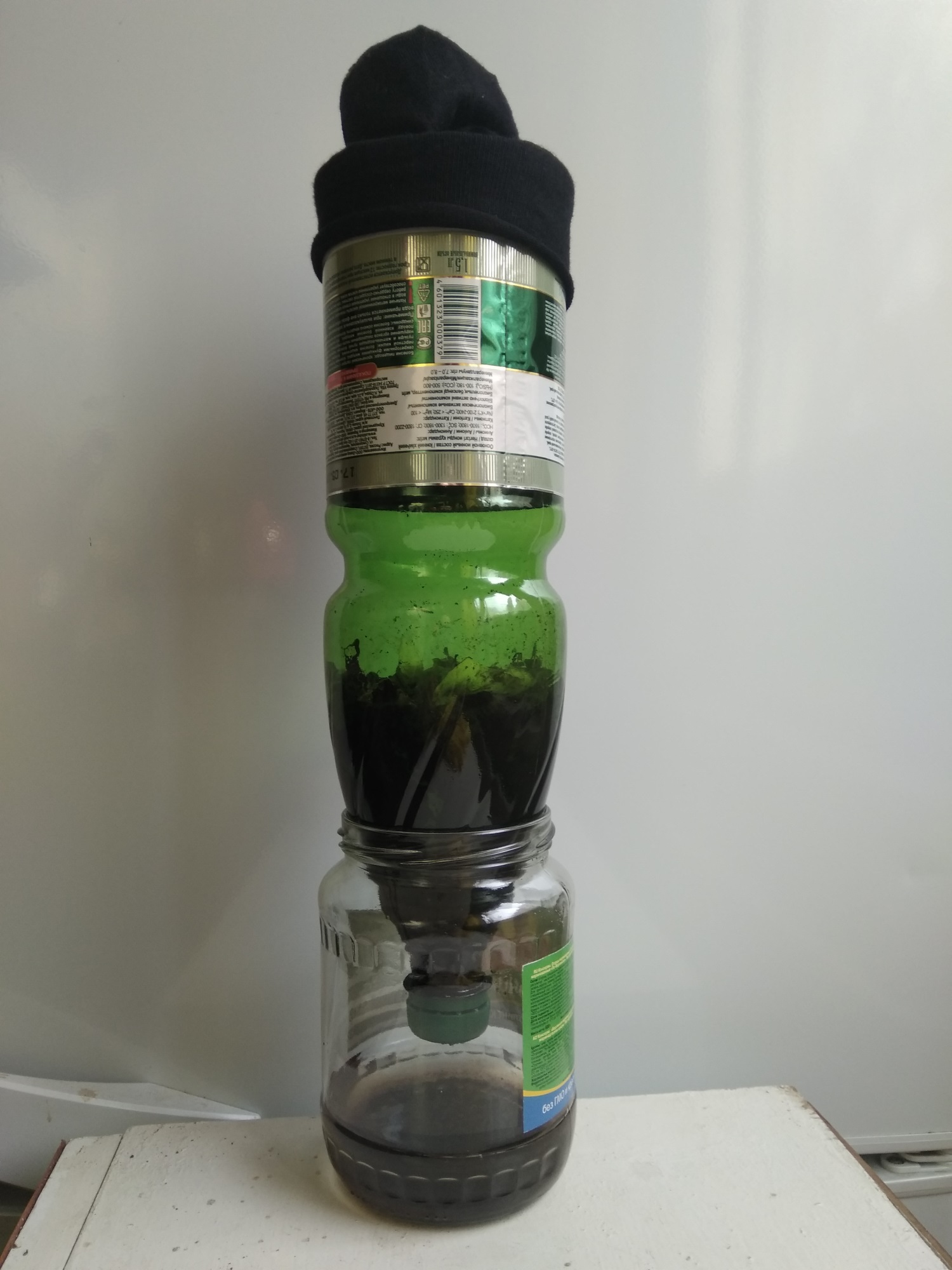 Недели три назад я "сконструировал" вот такую штуку (пикрелейтед), состоящую из банки, обрезанной бутылки и носка. Подошёл бы и капроновый чулок, но как-то не нашлось в хозяйстве. А носков старых у меня дофига, вот конец и отрезал. Подошло всё друг к другу идеально.