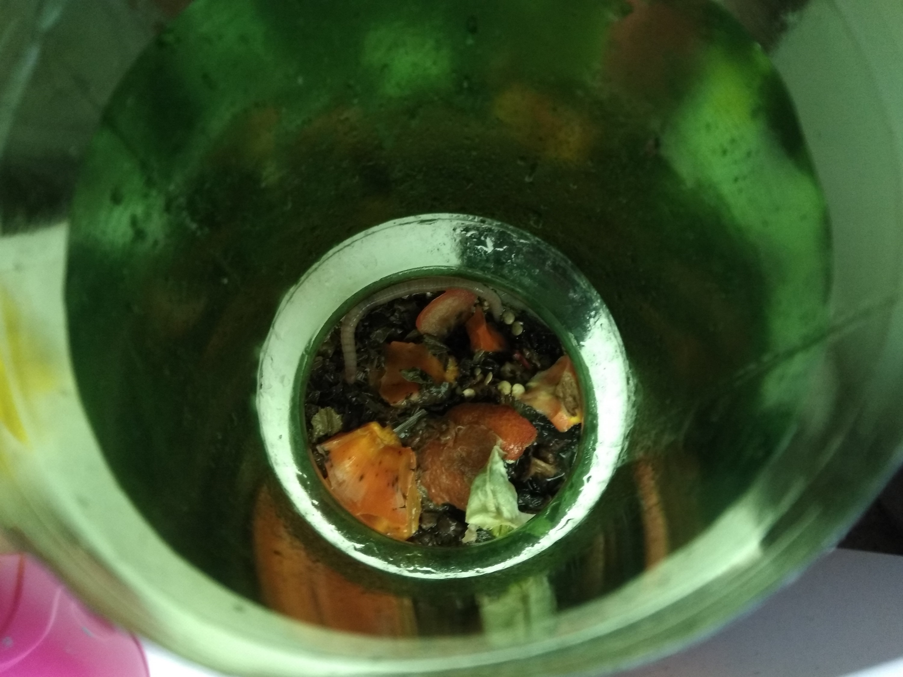 Задумка такова: в бутылке земля, сверху кидаем корм (остатки овощей-фруктов, заварка и т.п.) и регулярно это дело поливаем водой. Вода сбивает плесень, а главное, в ней растворяется слизь и прочие выделения червей. После этого вода сама собой вытекает сквозь дырочки, пробитые в крышке. Таким образом, земля всегда будет оптимальной влажности. Носок сверху блокирует мух, мошек и всё такое. Конструкция устойчива и не воняет.