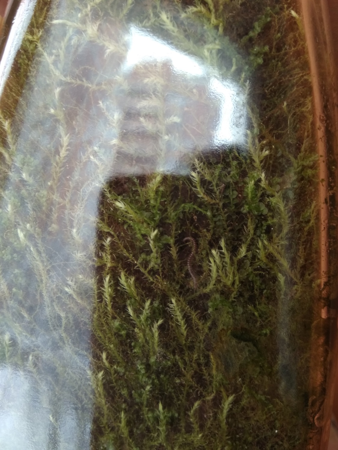 Заметил в первой банке всё тех же многоножек. Вернее, одну. Думал они уже вымерли. На фото видна по центру.