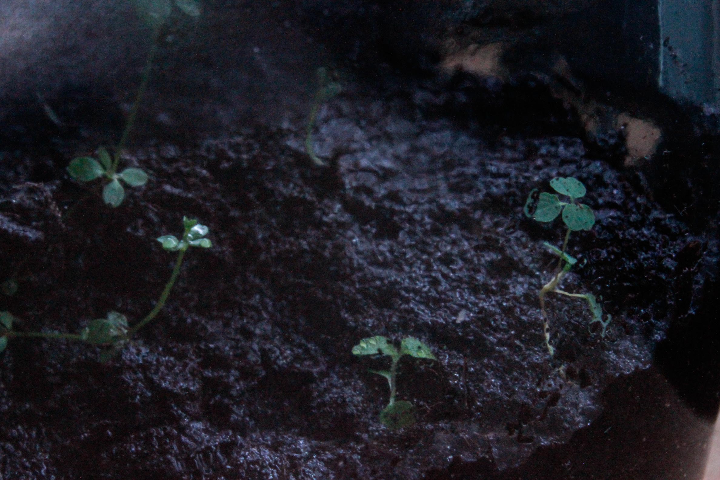 В третьей банке всё по старому. Толком ничего не растёт, но и не засыхает. Всё те же каличные три ростка перца. Хотя, у одного ростка уже сгрызли все листья, а у другого сильно повредили стебель. Не думаю, что они доживут до весны. А когда зелень исчезнет, с кислородом тоже начнутся проблемы. Мокриц стало сильно меньше, крупных вообще не видно. Червяк жив. Он стал каким-то ржаво-рыжим и хоронится, как партизан, редко можно наблюдать его.