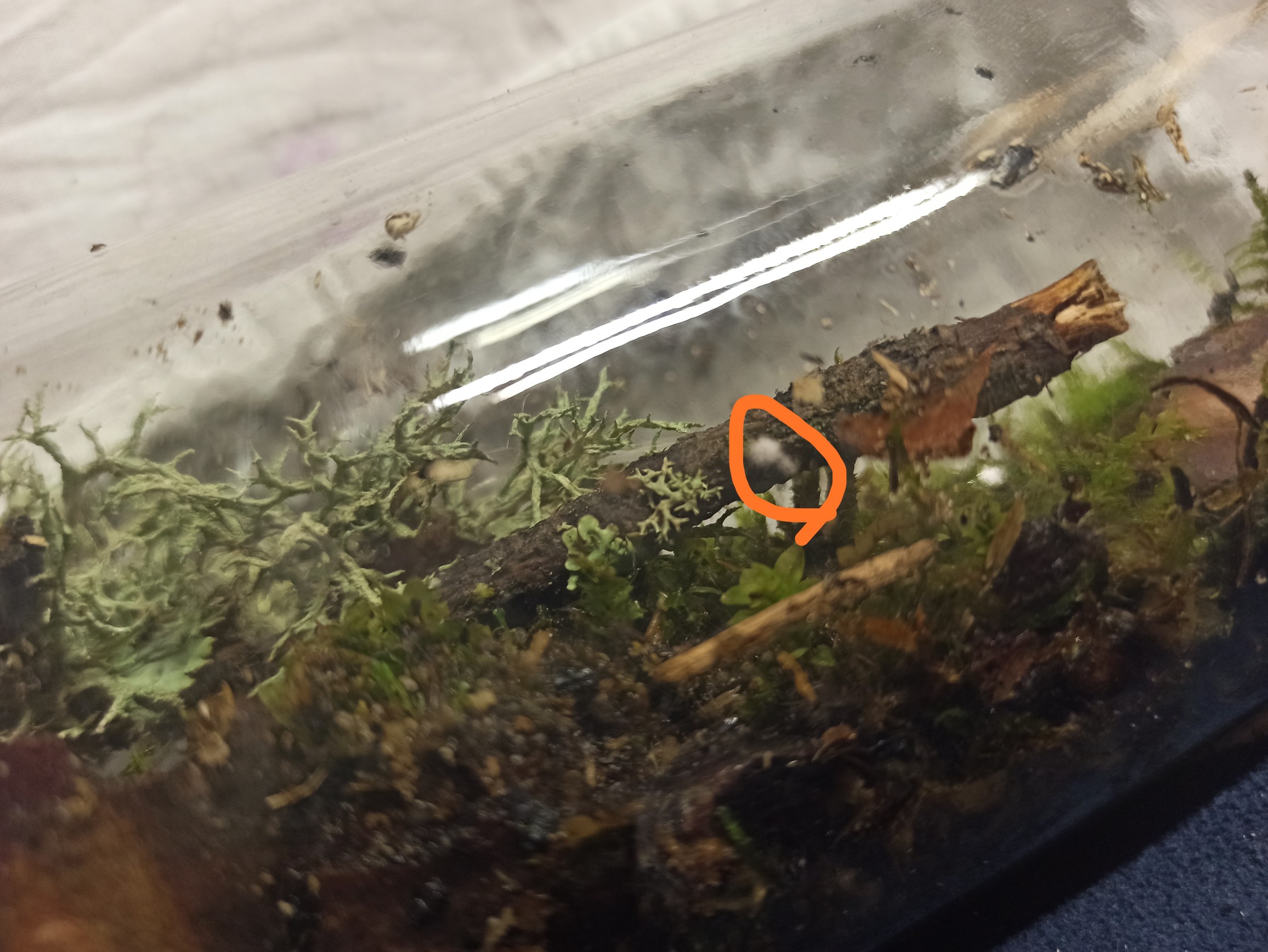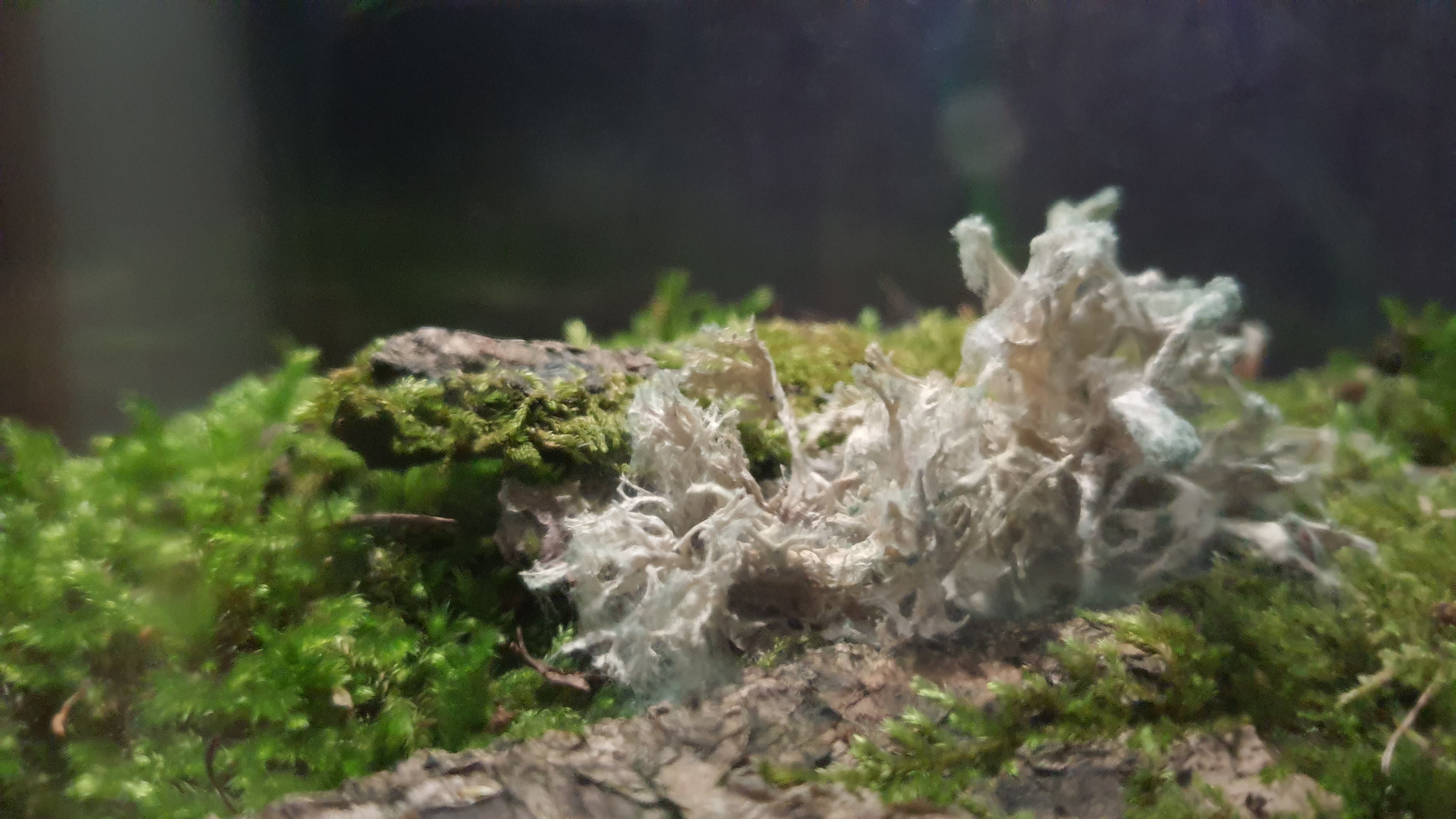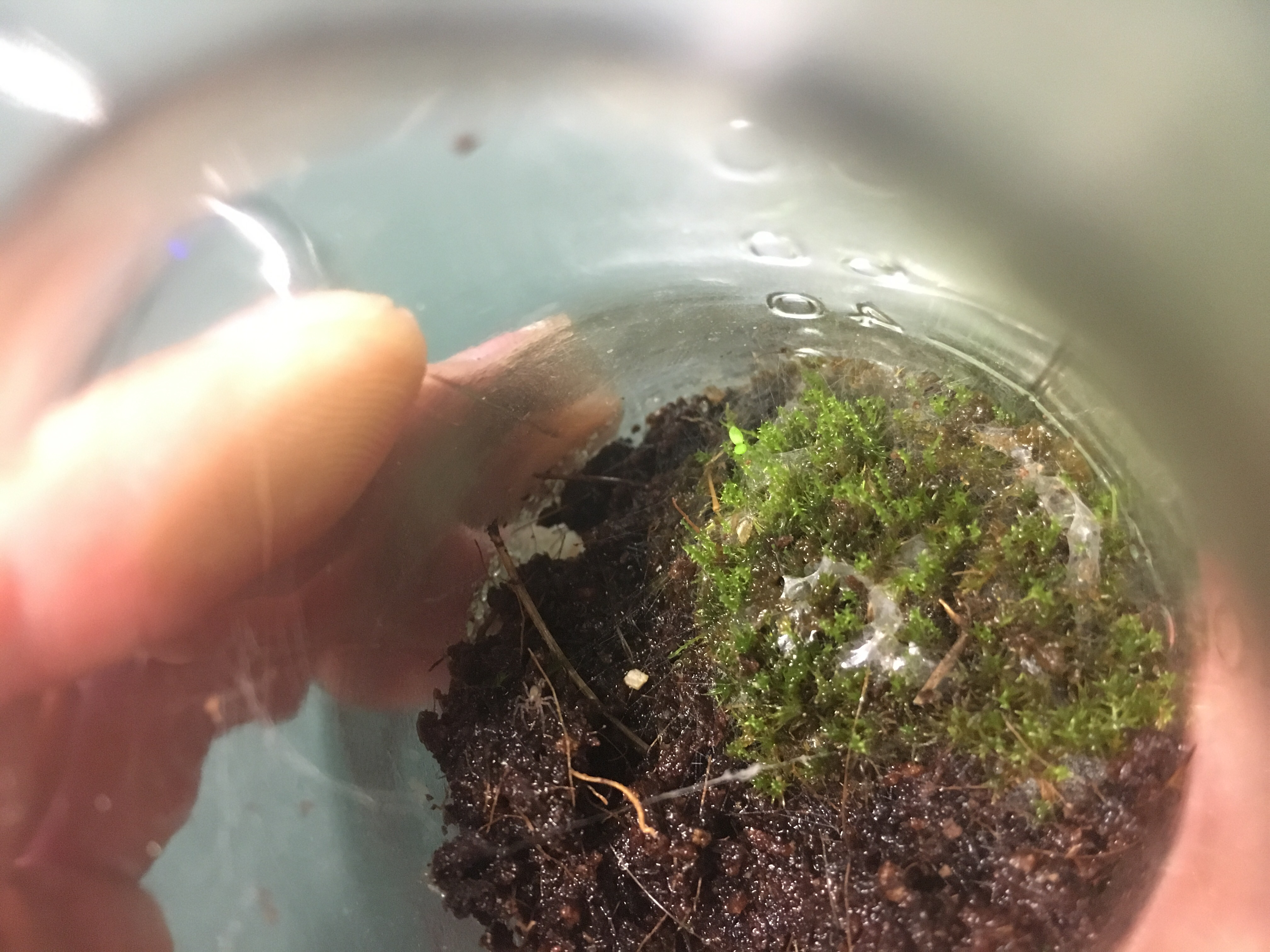 P.S Кстати, мох я туда не сажал. Мох я сажал в другую банку, а в эту тупо высыпал остатки земли после мха. Банка со мхом погибла, а здесь он почему-то через пару месяцев дал ростки и прижился. Ещё эти стручки непонятные и какое-то пластинчатое то ли растение, то ли лишайник (его видно в углу снизу справа). Черви и ногохвостки видимо там же в пыли сидели.