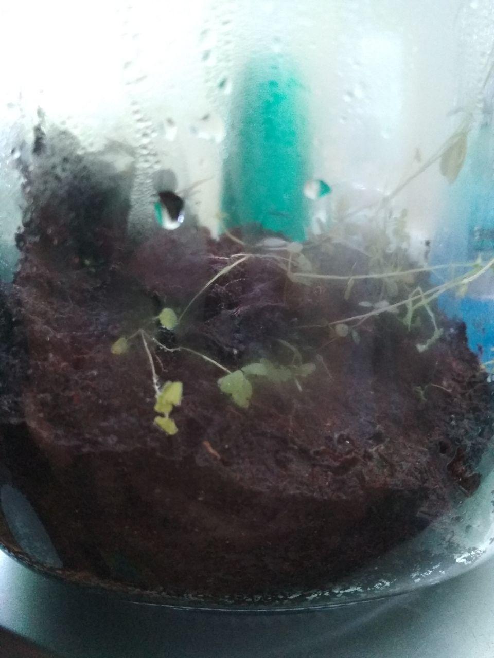 Сделал банку, натыкав из рассады всяких сорняков. Сначала перелил, было слишком много воды да и сейчас ее слишком, как по мне, выждал два дня пока она чутка сконденсируется и улетучится, но потом просто забил, взял клизму и убрал лишнюю воду. Закрыл, стоит уже второй день, можно считать, что отсчет для этой банки пошел. Буду сюда скидывать обновления иногда. Банка у меня отстойная, с магазинным грунтом, а следовательно в ней нет никаких червячков-паучков. Если все пойдет нормально, то потом куплю еще одну банку и воткну туда лесного грунта со всеми подземными ништяками.