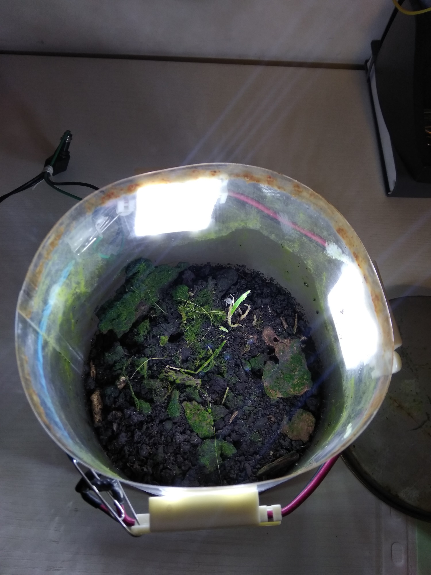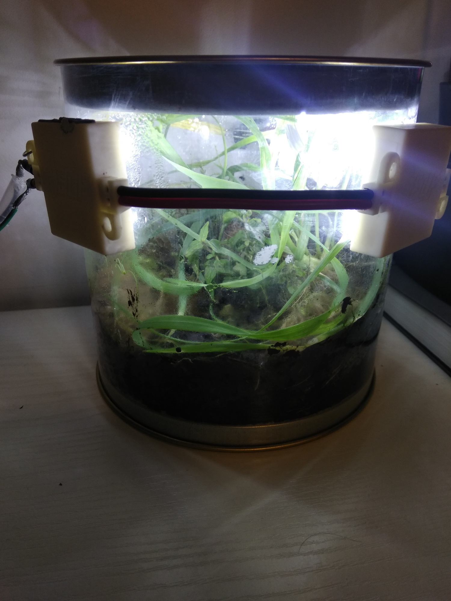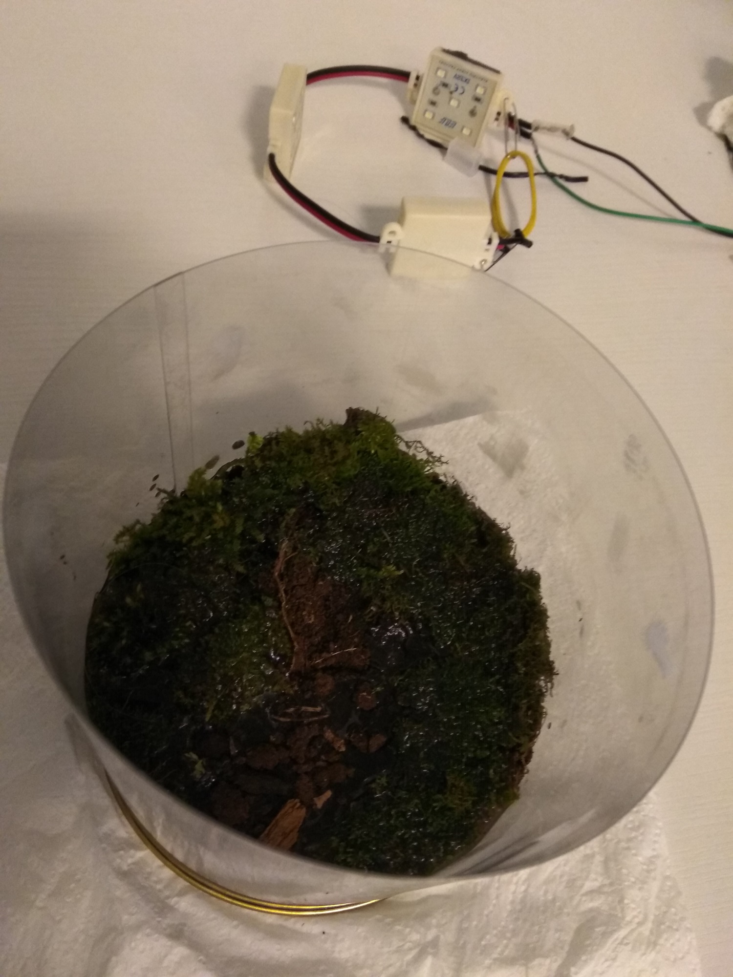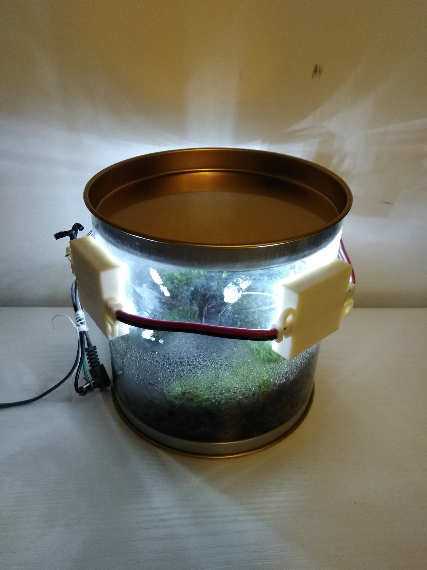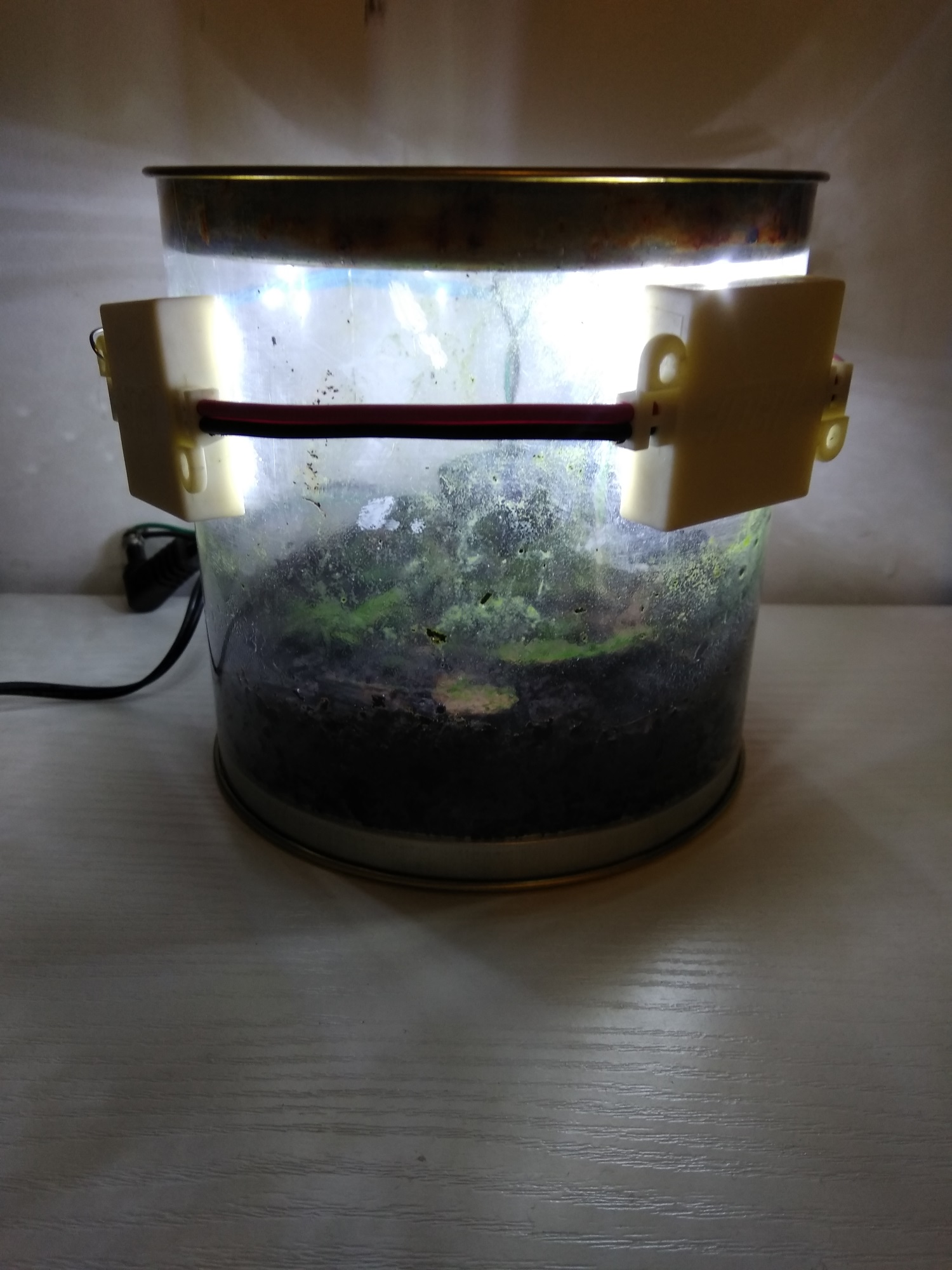 Началось всё 14 месяцев назад, когда я взял банку из под какого-то буржуйского печенья с плотной крышкой. Стенки сделаны из пластика, причём это просто лист, который свернули кольцом. Чтобы улучшить герметичность, проклеил суперклеем все стыки. И сделал большую ошибку: держал банку закрытой, пока клей сох. Из-за этого пары клея прореагировали с мельчайшими частицами жира и прочей грязи, покрывавшей стенки. На вид всё было чисто, а вот после реакции - хрен ототрёшь, въелось намертво. Поэтому стенки получились менее прозрачными (в исходном виде они были, как стекло) и на вид заляпанными. В банку засыпал земли из леса и положил мох, собранный в парке. Этот мох раньше рос на коре деревьев, но за зиму некоторые ветки попадали, вот и соскрёб. Поверх банки прикрепил три светодиодных плашки. Каждая на 5 светодиодов. Питание от 12В. Солнечного света нет вообще. На первом фото там слишком много воды, лишнюю убрал перед закрыванием.