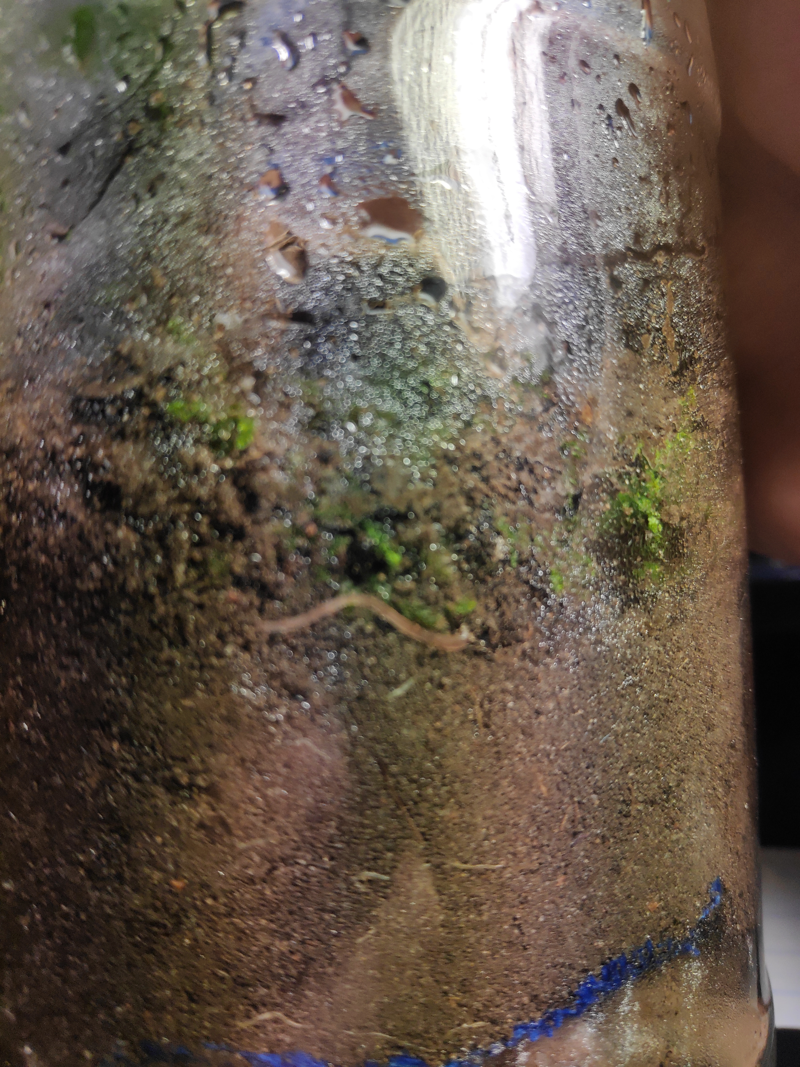 Не хочу слишком часто выкладывать отчёты, но по второй банке есть новости. Я-то считал её вымершей. Ну мох чуть-чуть, плесень белая, водоросли зелёные, червячки белые микроскопические. Но тут оказалось, что там есть аж два дождевых червя! Мелкие, сантиметра по 3-4. Вот откуда? Сидели в яйце, а как солнце светить стало по весеннему, проросли и заколосились? Вот тебе и закрытая экосистема. Удивляет.