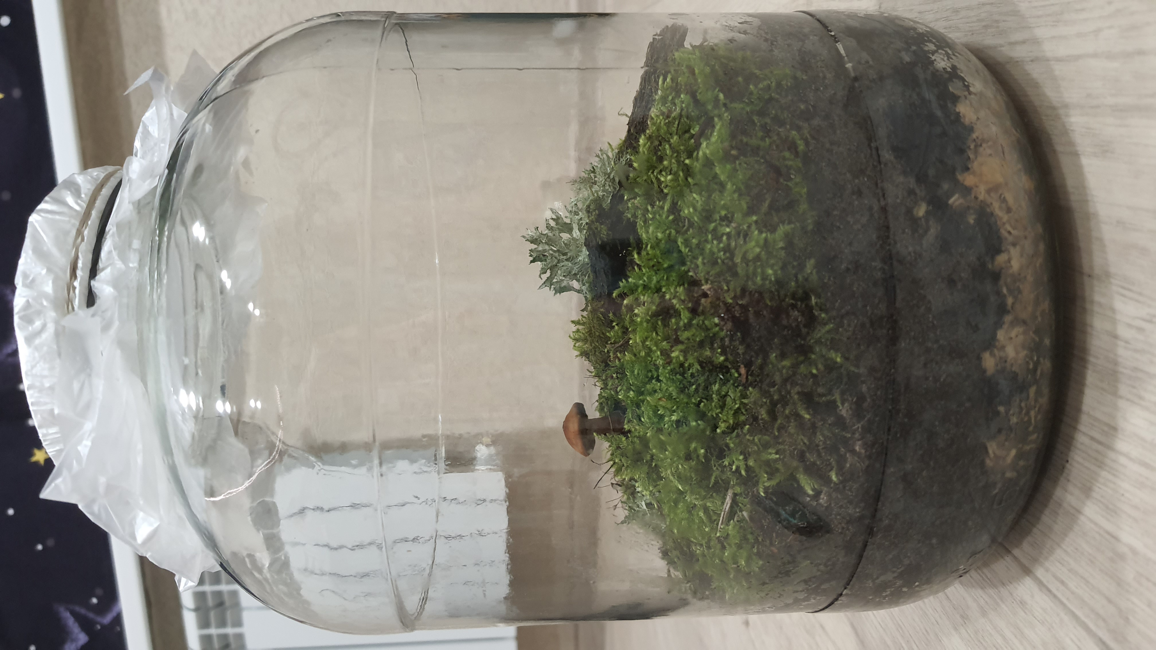 Наконец-то, спустя лет 10, закатал свою вторую баночку. Прошлая прожила где-то полгода, пока ее окончательно не завоевала длинная зеленая трава, которая умерла - и все закончилось. Что радует с нулевой - тут уже пара чего-то живого бегает, какой-то маленький красный паукообразный и ооочень тонкий маленький червячок с ножками, что-то членистоногое, видимо; а в прошлой почему-то никого не было вообще, хотя земля примерно из одного и того же места. Знаю, что грибочек, скорее всего, не жилец, но он рос прямо на маленькой полянке из мха, пройти мимо было невозможно. Зацепил кусок мицелия, а вдруг. Туда же поселил иксодового клеща, которого дома обнаружил на одежде после сбора компонентов. Такой лишайник вообще не помню, чтоб видел в этой местности (впрочем, я обычно и не приглядываюсь), но повезло случайно наткнуться на старом спиленном дереве. В целом считаю, что получилось неплохо, только остался открытым вопрос - сколько воды лить перед закупоркой. Прошлую банку перелил, часто все стенки были в каплях конденсата. Но тут же мох, ему, наверно, побольше надо влажности навести, как считаете? Всего вылил где-то 300-350мл, банка объемом 5л. И еще, по прошествии стольких лет уже не помню, где банка себя лучше чувствовала, на солнце или без оного, что посоветуете? Крайне приятно снова оказаться среди баночников, добра.