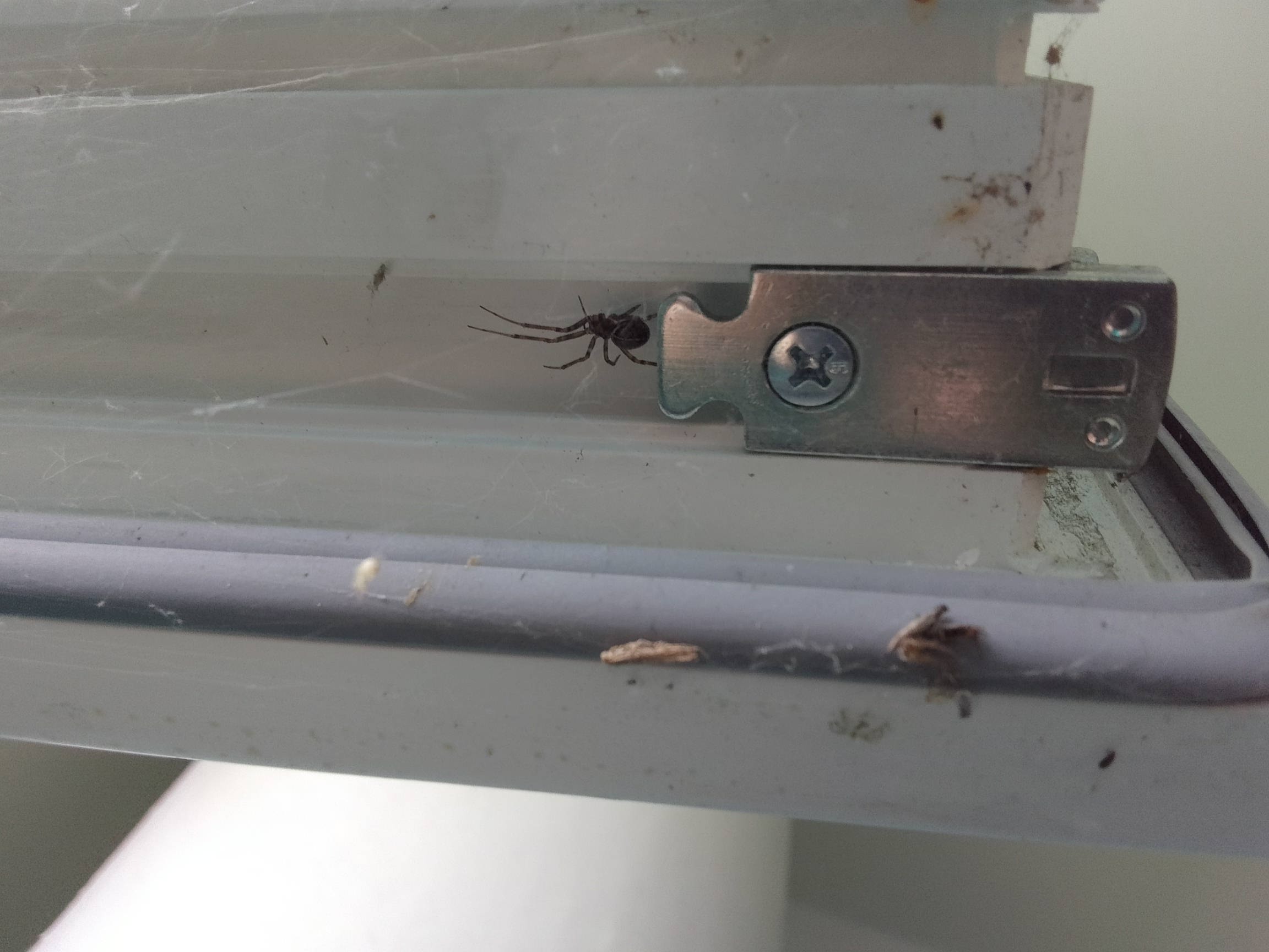 Крабик пошел гулять по жилищу человека и нарвался на стеатоду. Оба умерли. У стеатоды повреждено брюшко, краб спутан. На втором фото расправлены, чтобы показать мертвую хватку.